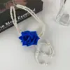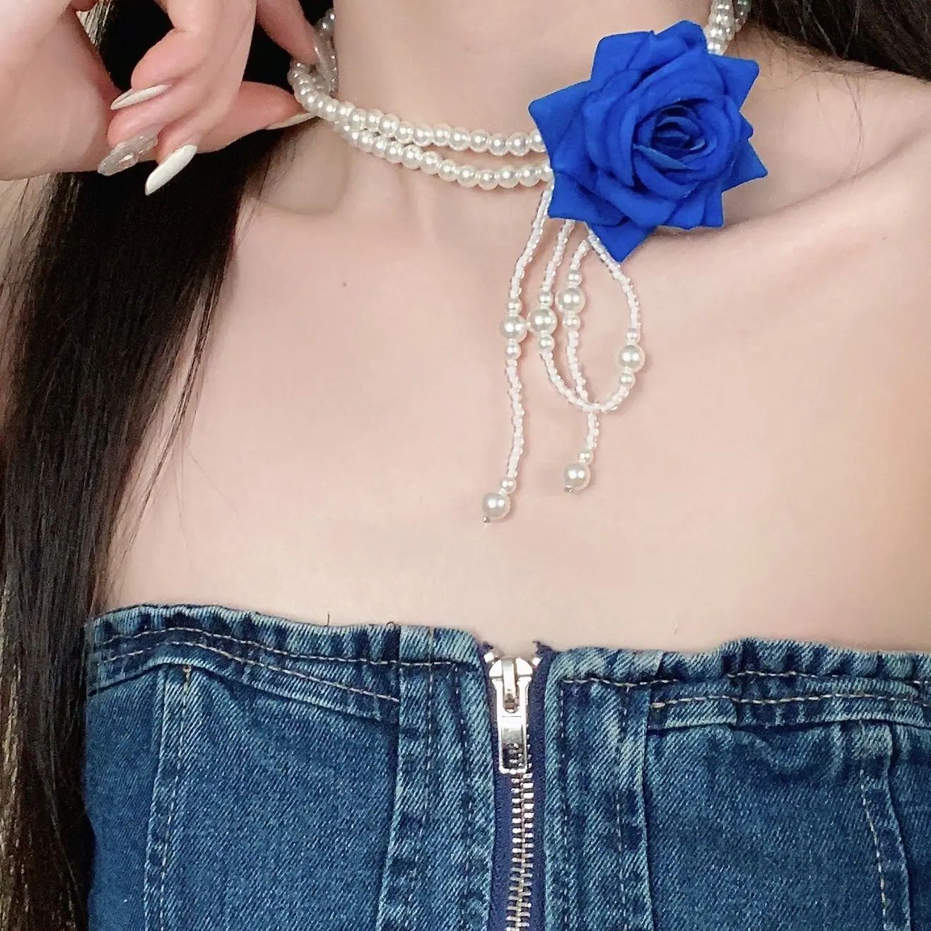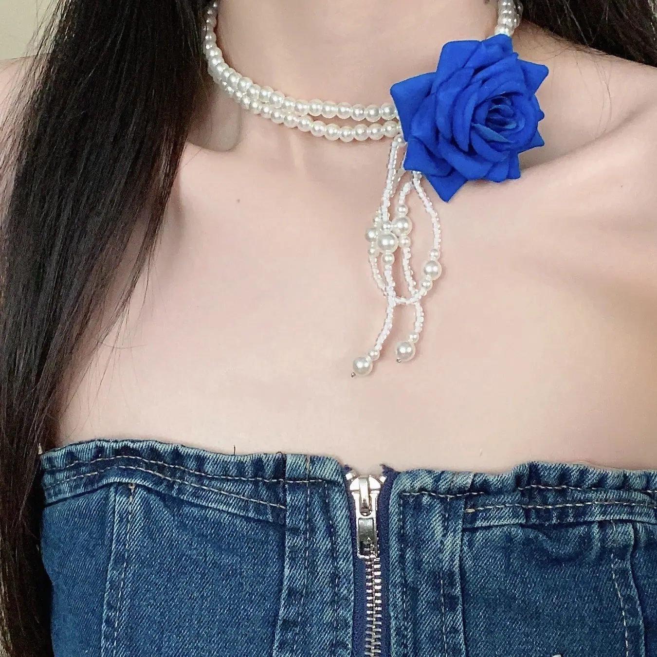Elegante Collar de Perlas de Rosa Azul Collar Choker Transfronterizo Europeo y Americano Cadena de Clavícula Apilada Versátil y a la Moda