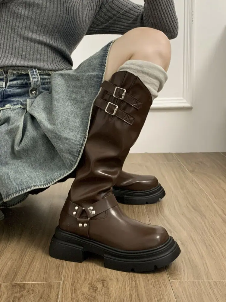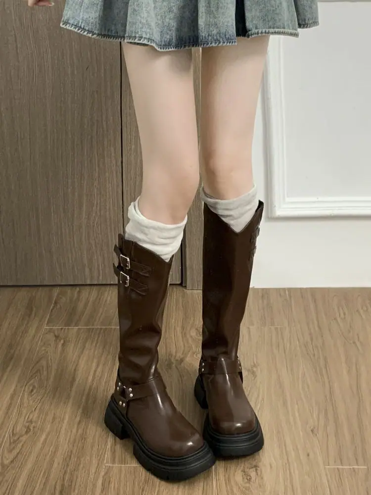 Temperamento Francés Cremallera Trasera Botas Largas Mujer 2024 Otoño/Invierno Nueva Moda Retro Botas Altas Suela Gruesa Aumento de Altura Botas de Caballero