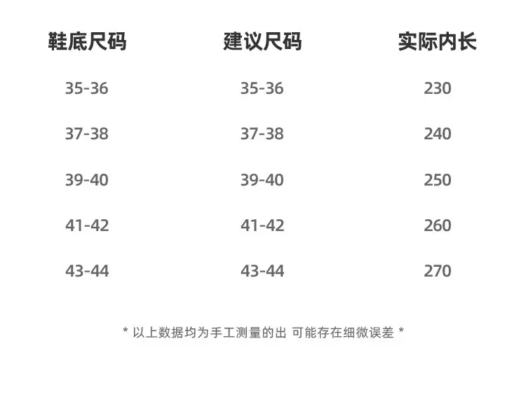 240 [suitable for 36-37-38], 250 [suitable for 39-40], 260 [suitable for 41-42], 270 [suitable for 43-44]