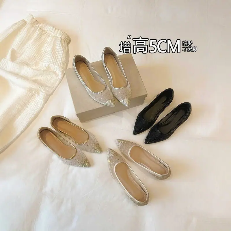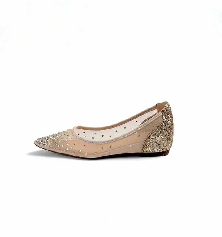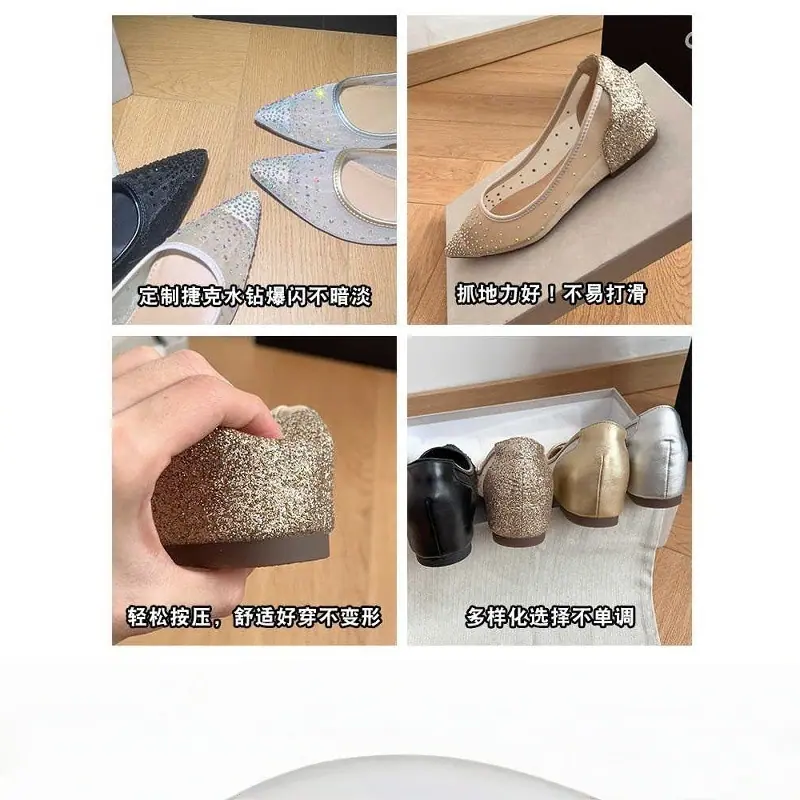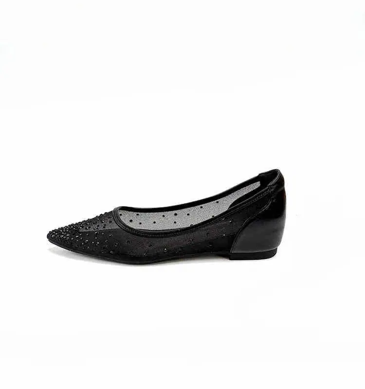 Zapatos de Malla de Punta con Plataforma Interna y Boca Baja 2025 Verano Nuevo Versátiles Sandalias Transpirables de Pedrería Zapatos Planos