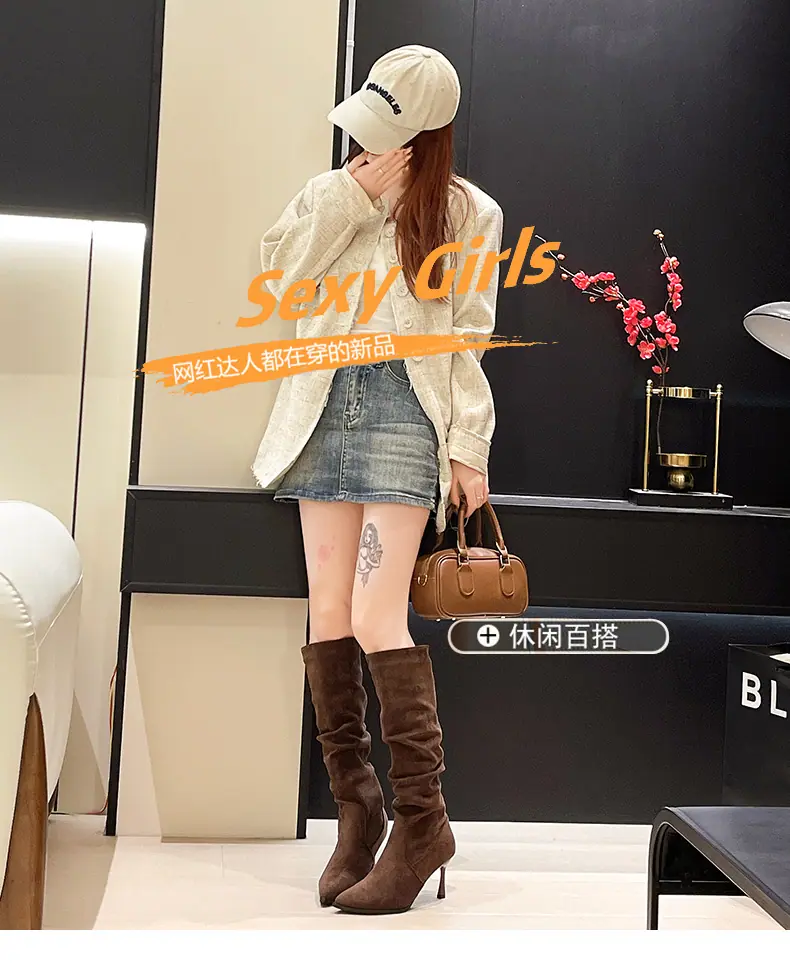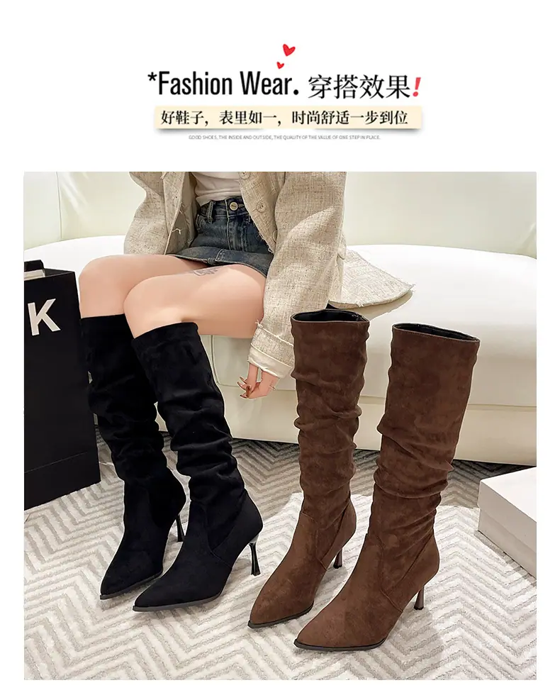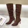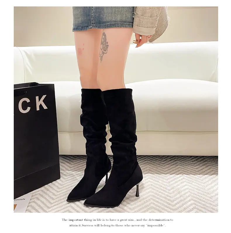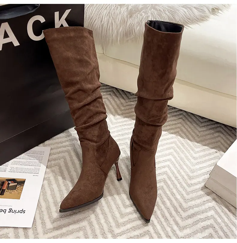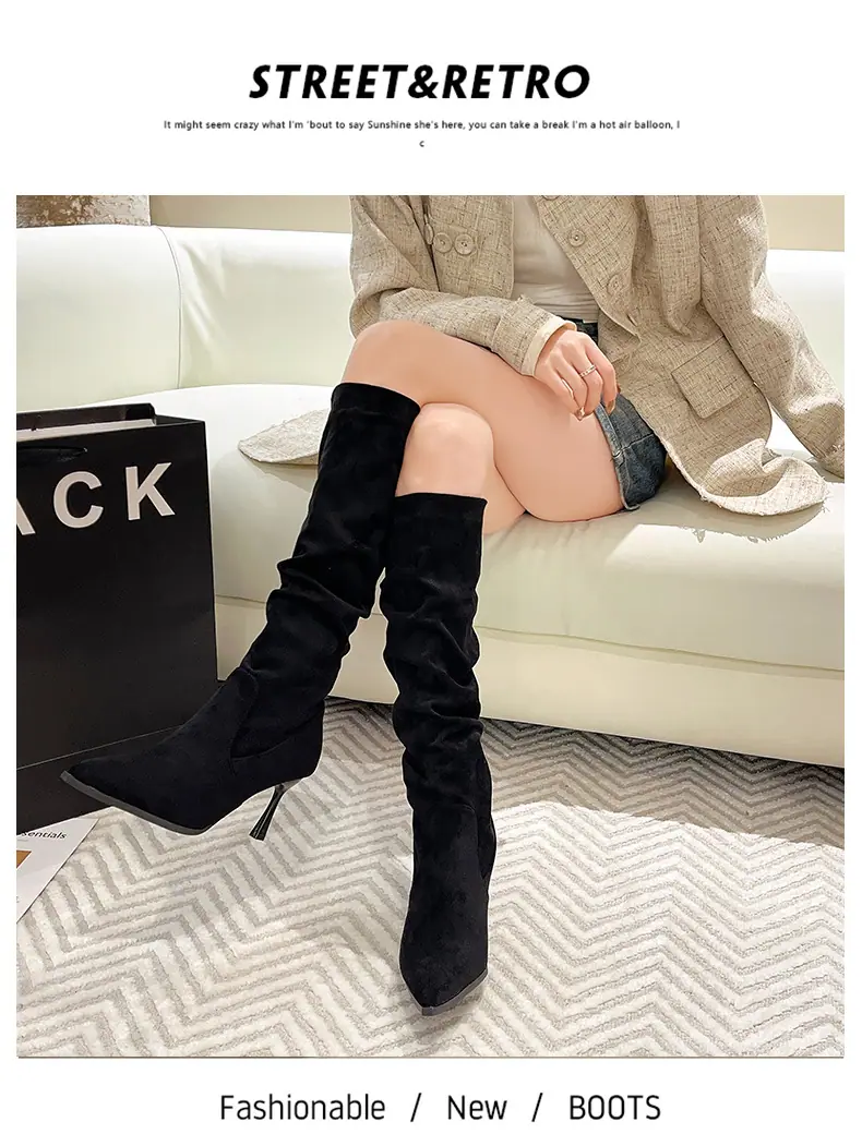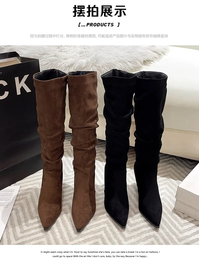 Botas slouch francesas por encima de la rodilla punta afilada tacón de aguja botas largas mujer 2025 invierno nuevo gamuza caña ancha tacón alto botas largas