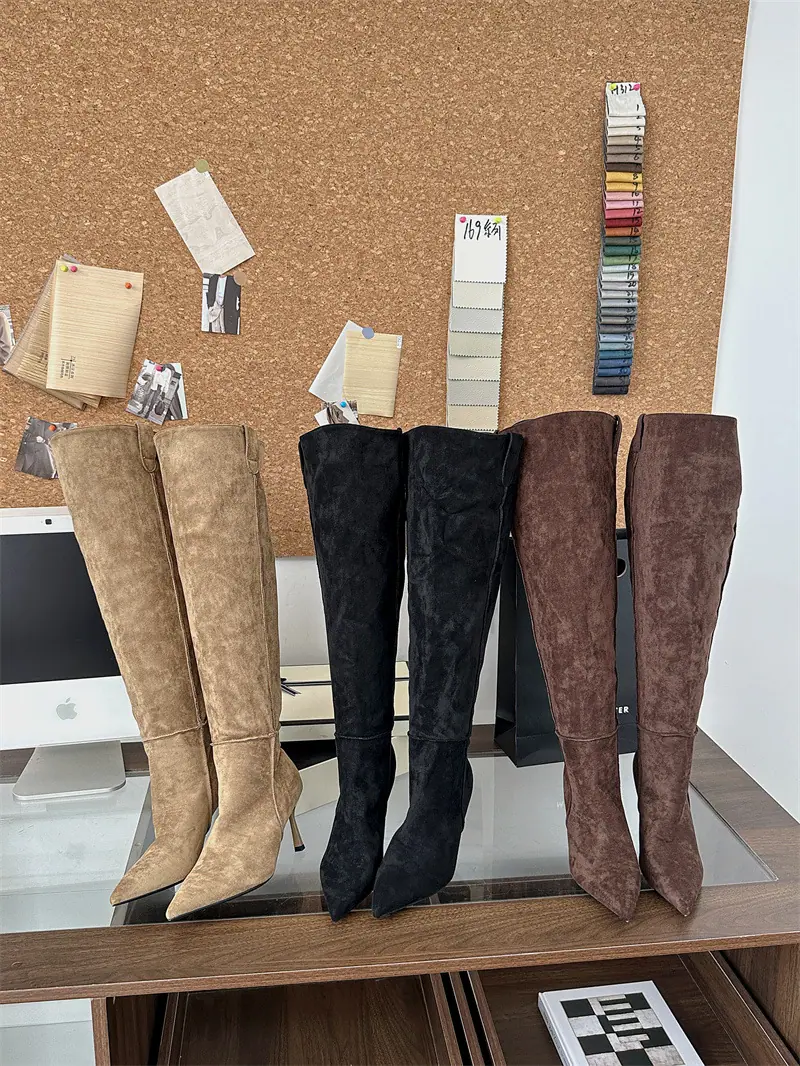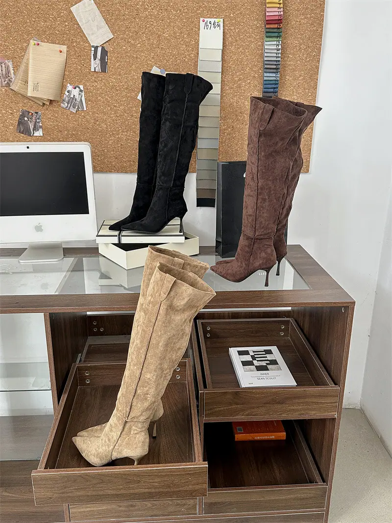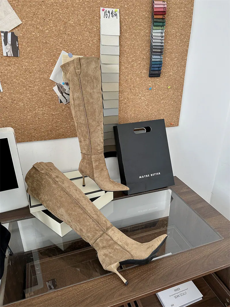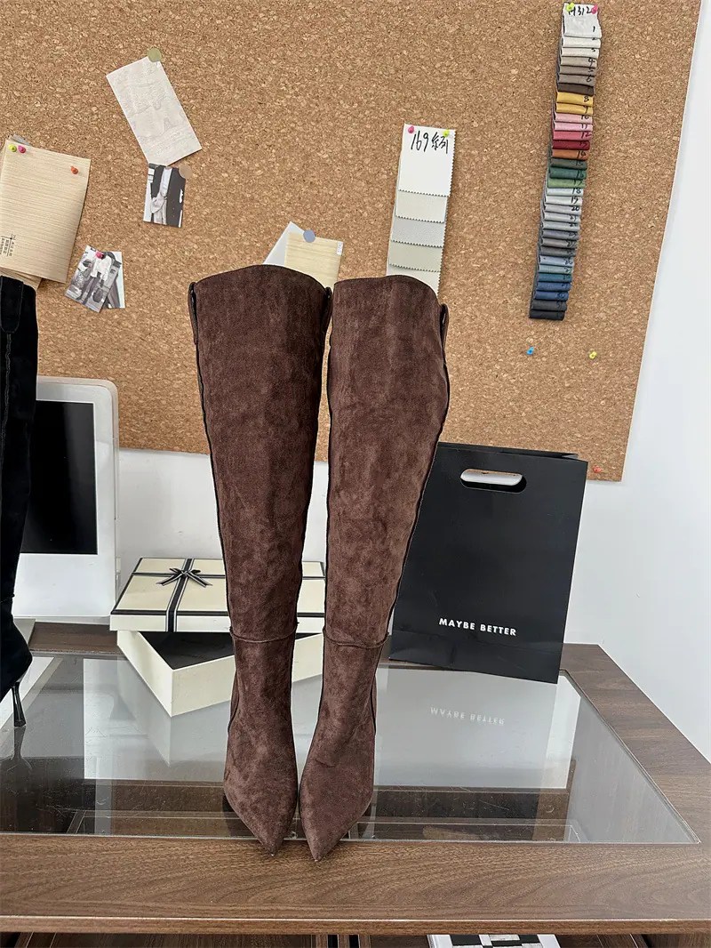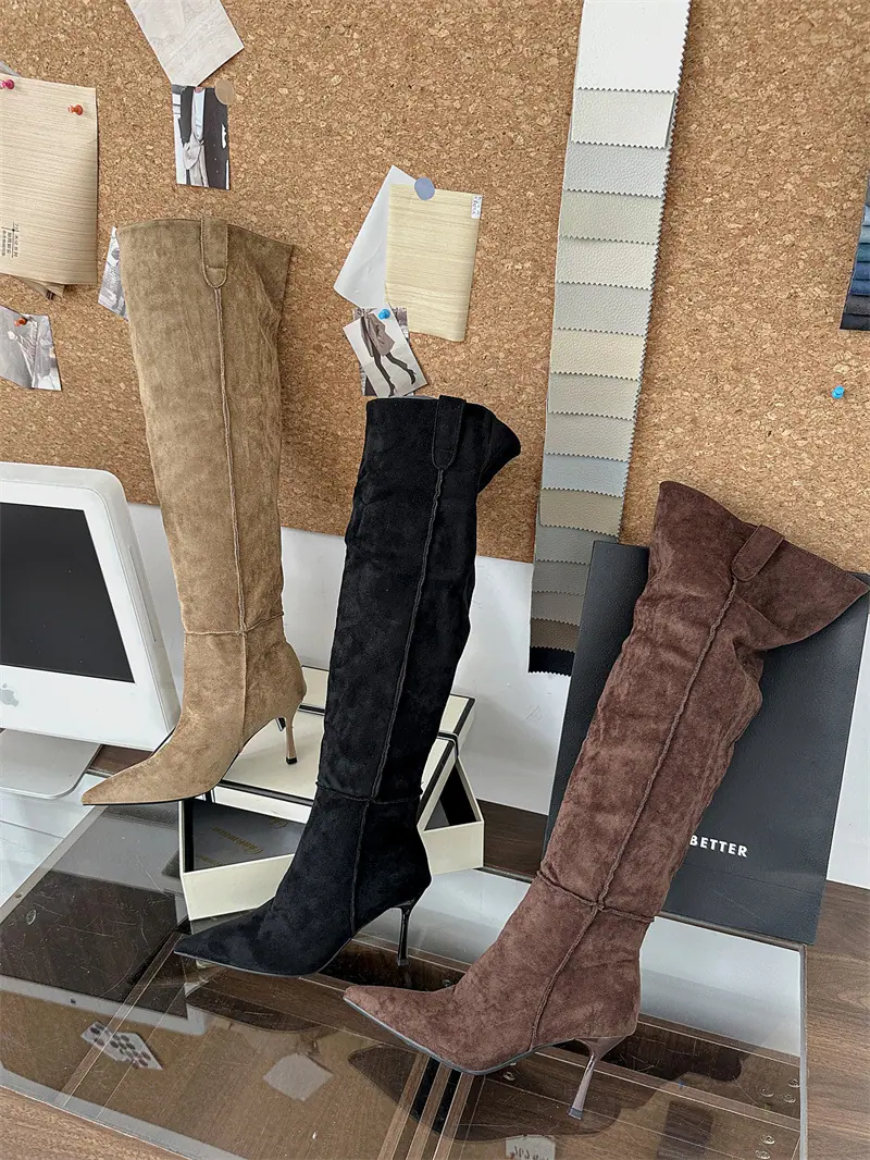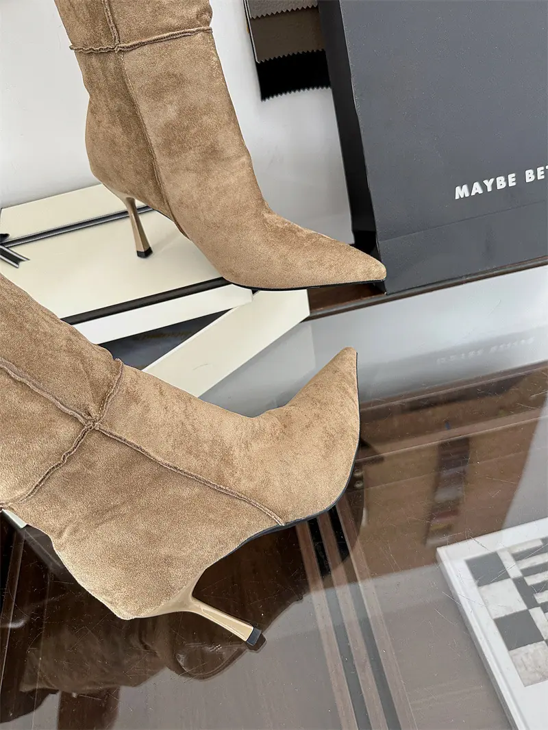 2025 Otoño/Invierno Nuevo Retro Punta Suede Temperamento Simple Moda Versátil Tacón Alto Tacón de Aguja Adelgazante Botines al Tobillo Botas Largas Mujer