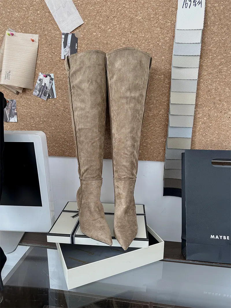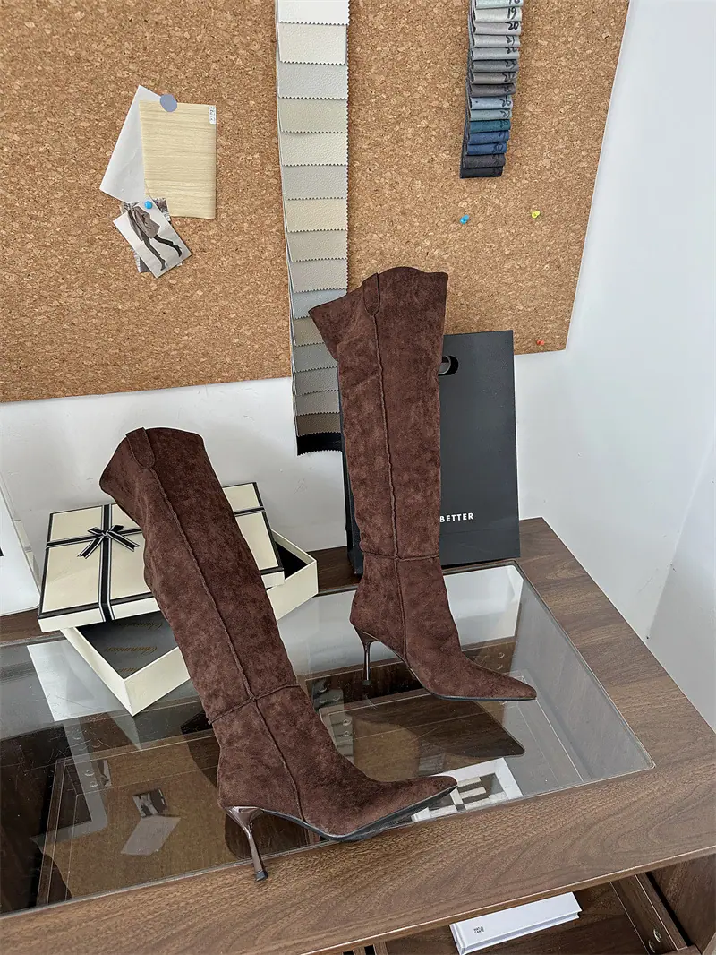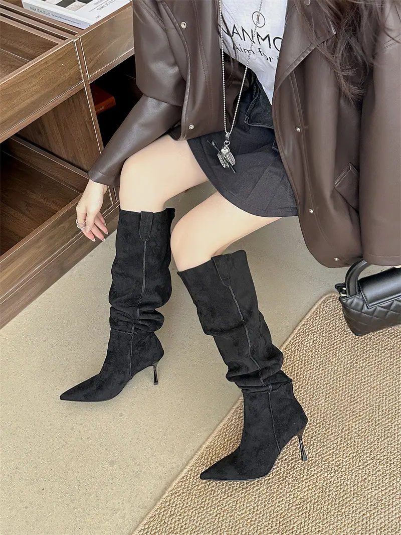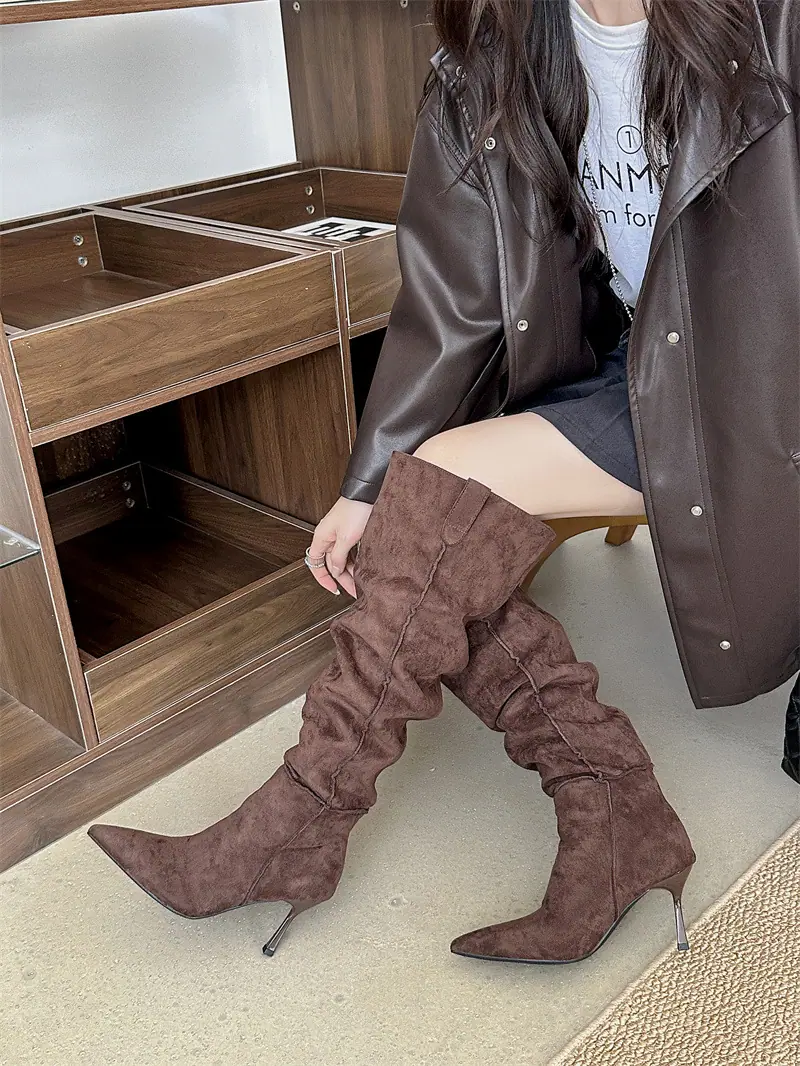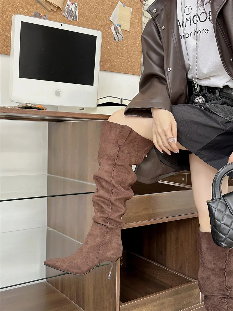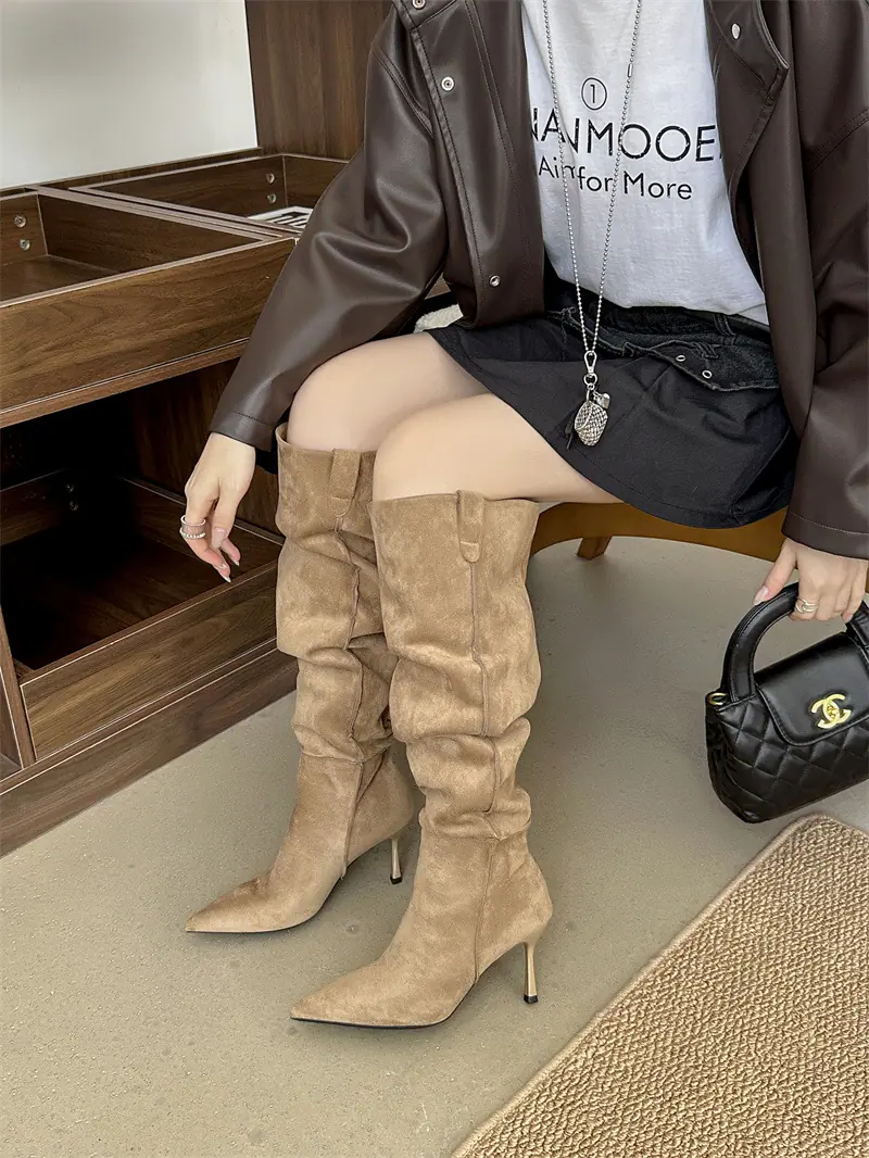 2025 Otoño/Invierno Nuevo Retro Punta Suede Temperamento Simple Moda Versátil Tacón Alto Tacón de Aguja Adelgazante Botines al Tobillo Botas Largas Mujer