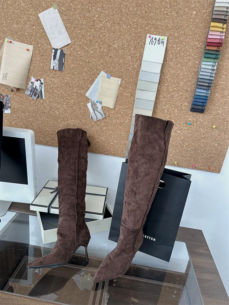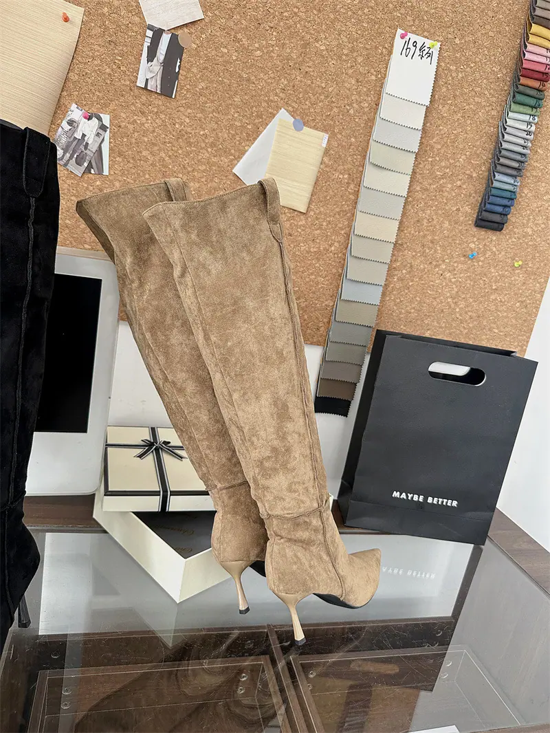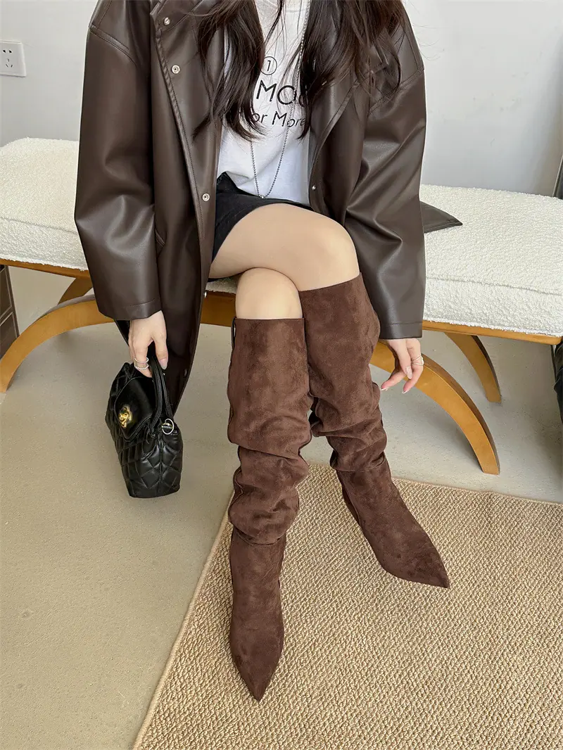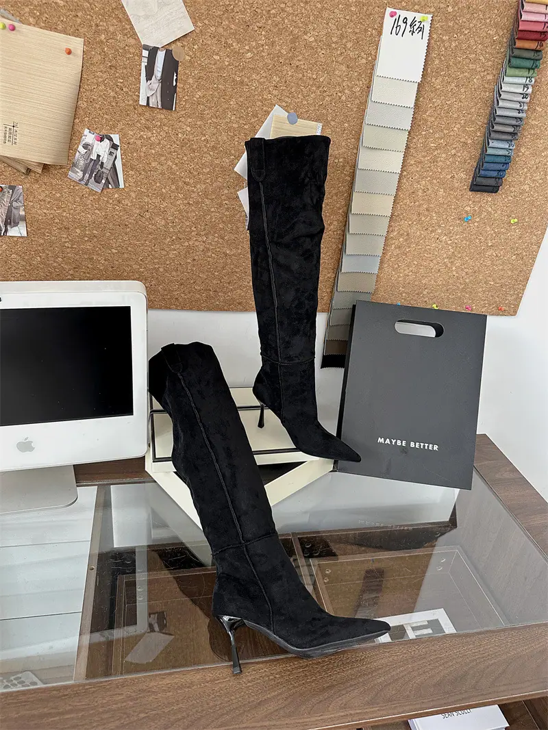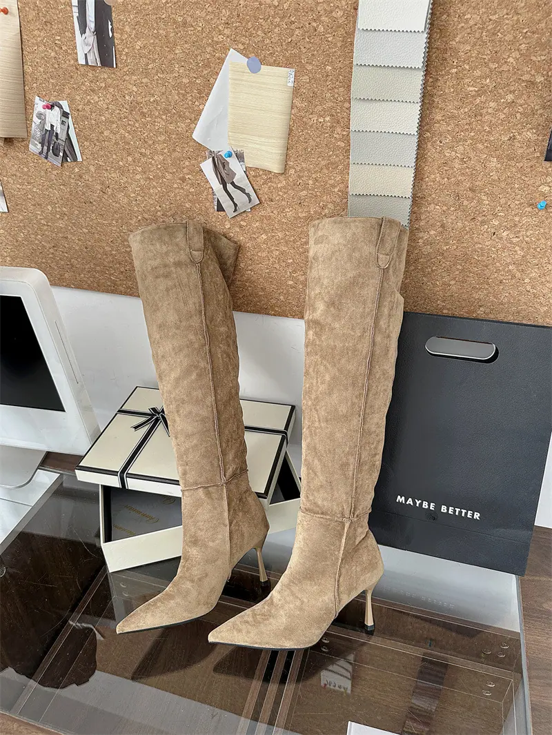 2025 Otoño/Invierno Nuevo Retro Punta Suede Temperamento Simple Moda Versátil Tacón Alto Tacón de Aguja Adelgazante Botines al Tobillo Botas Largas Mujer