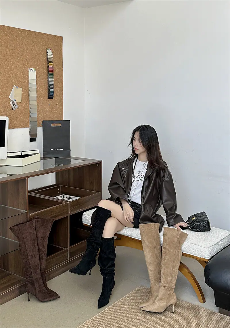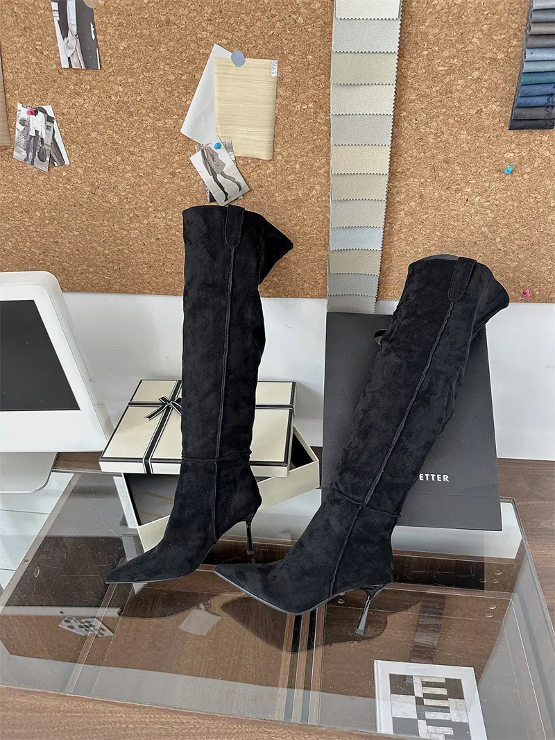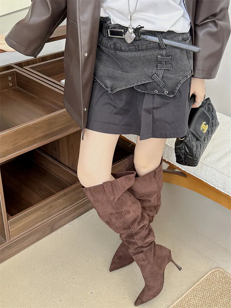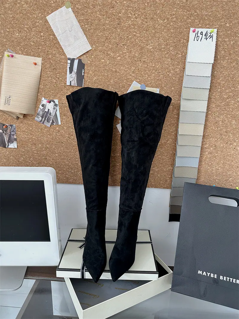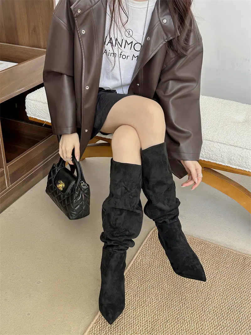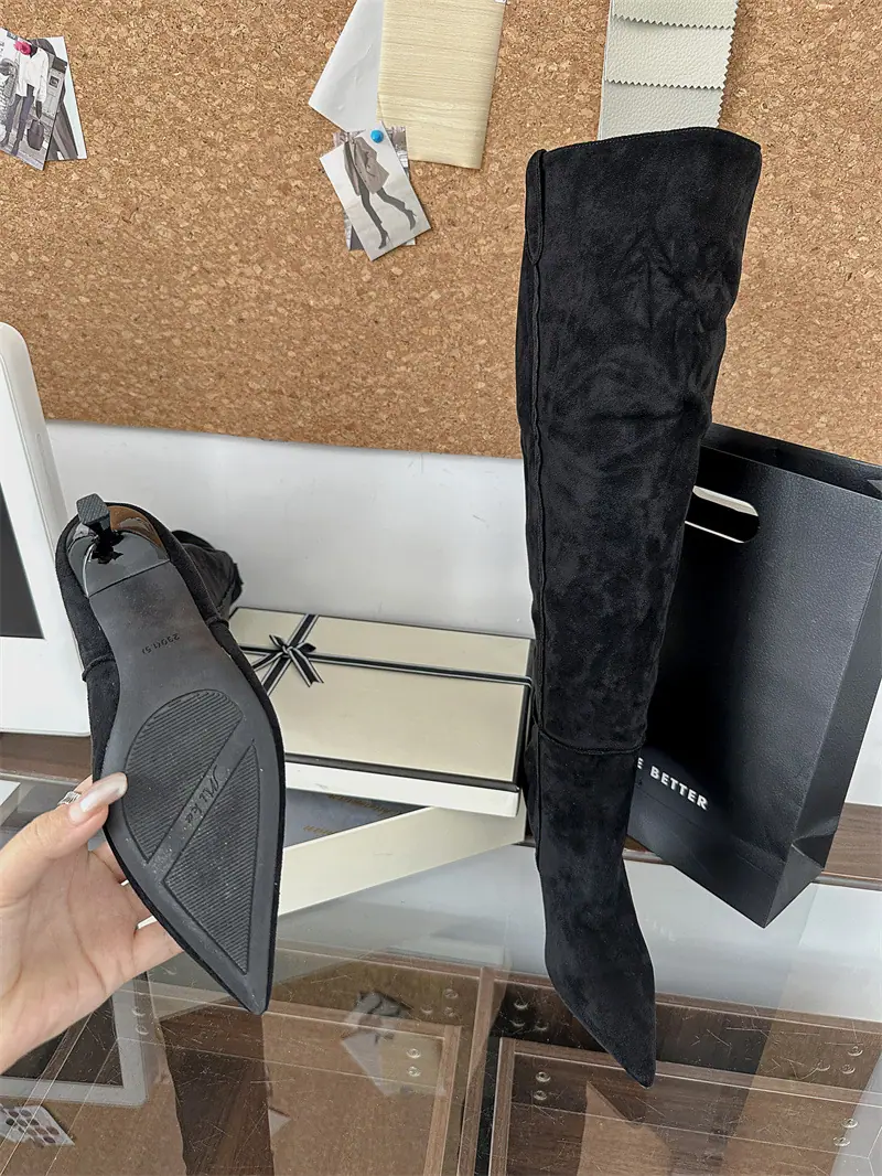2025 Otoño/Invierno Nuevo Retro Punta Suede Temperamento Simple Moda Versátil Tacón Alto Tacón de Aguja Adelgazante Botines al Tobillo Botas Largas Mujer