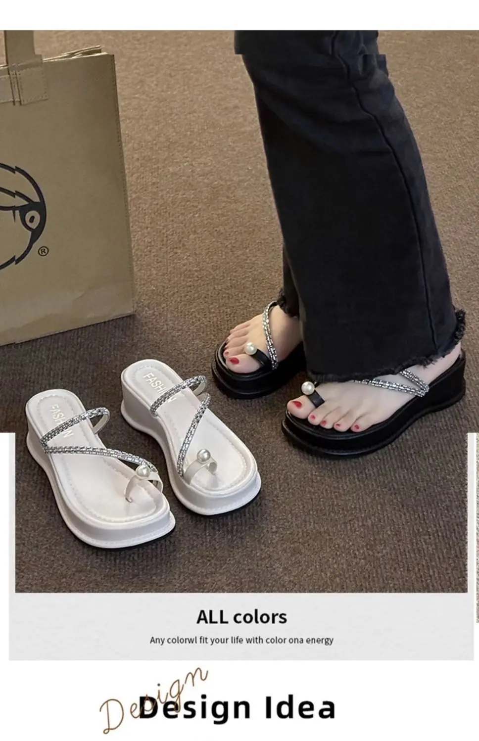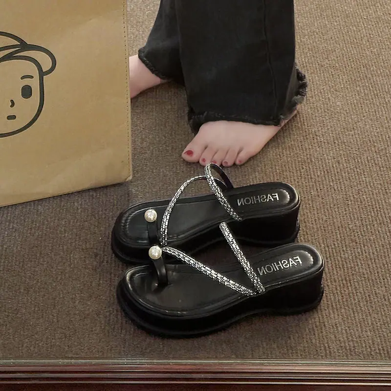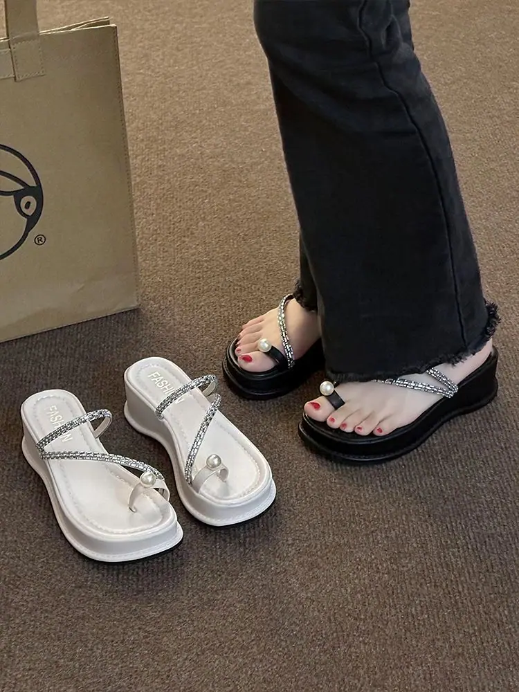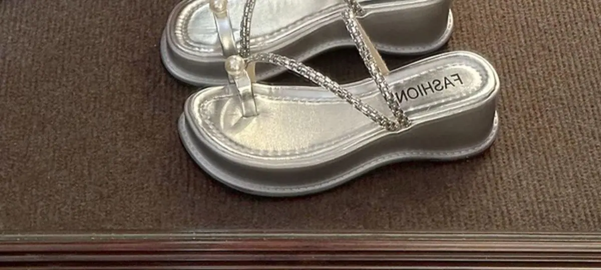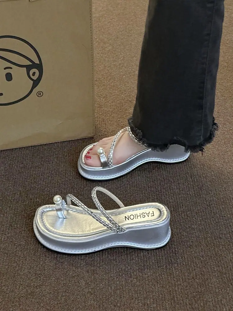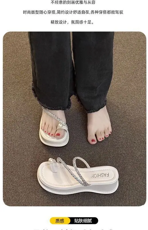 Zapatillas de noche francesas 2024 verano nuevo estilo moda exterior perlas sandalias de piso suela plana de alta gama zapatillas de una tira