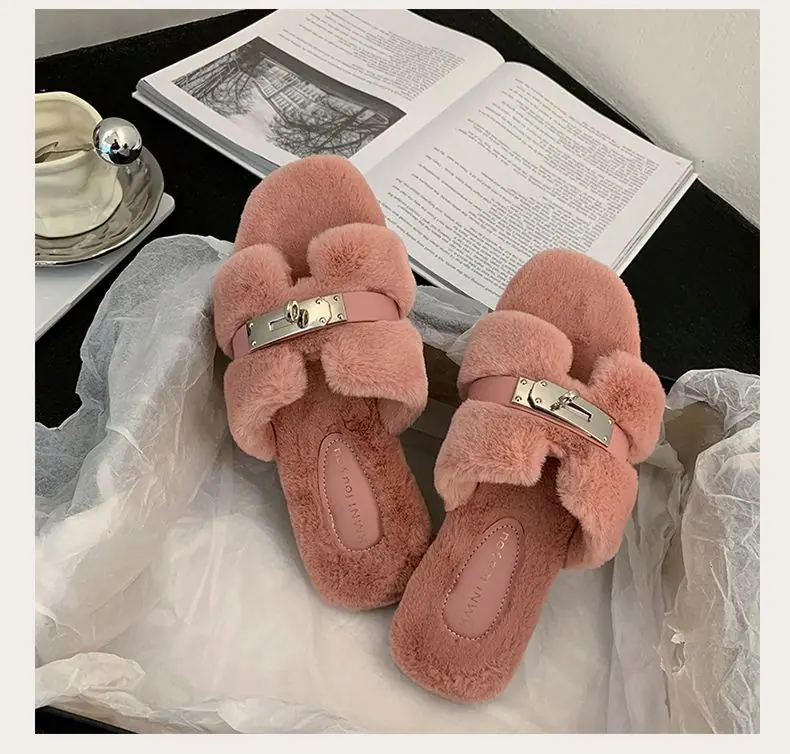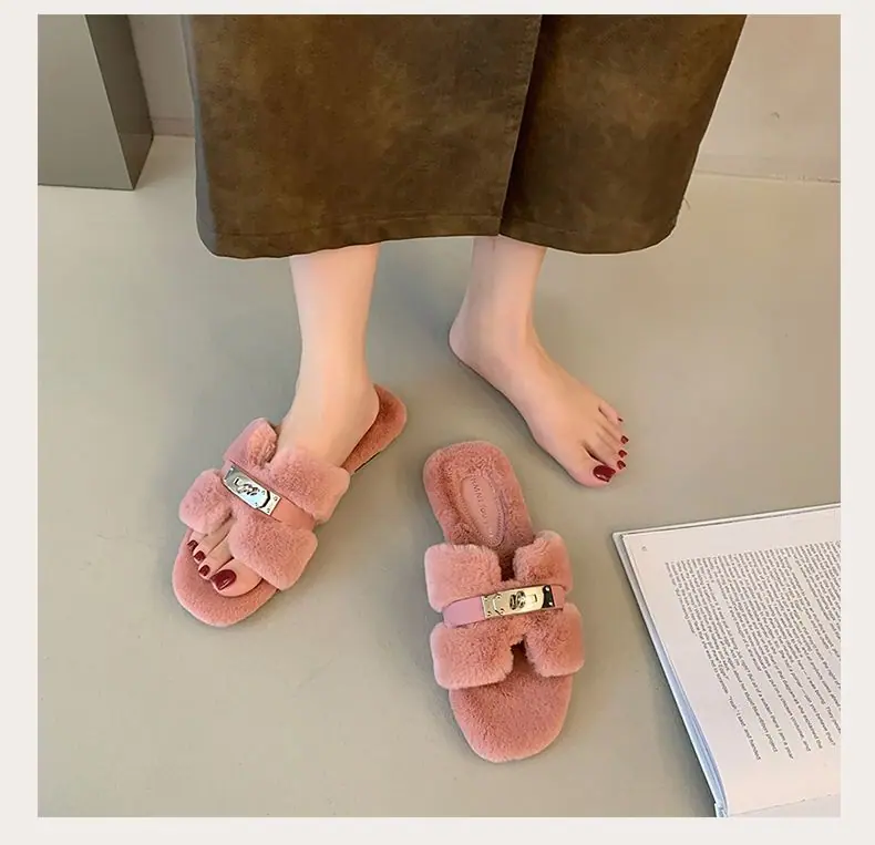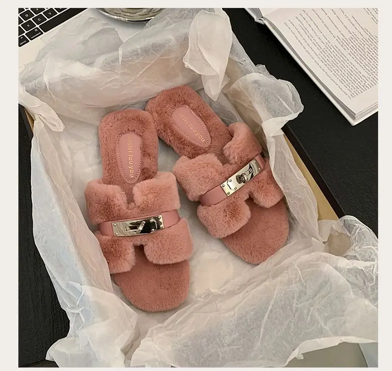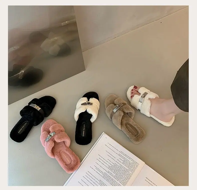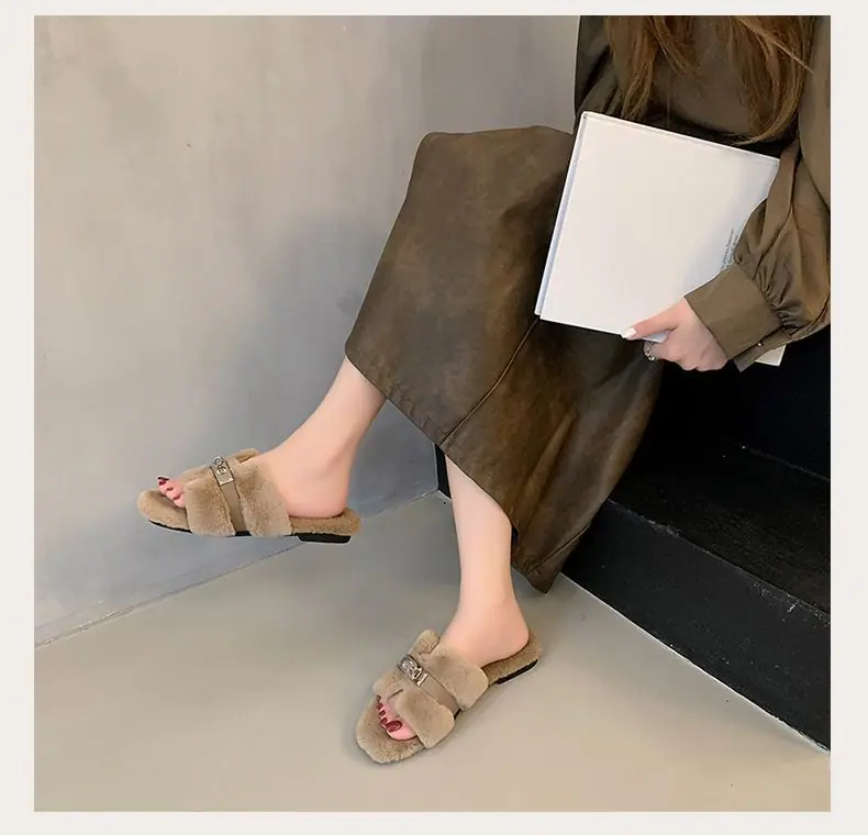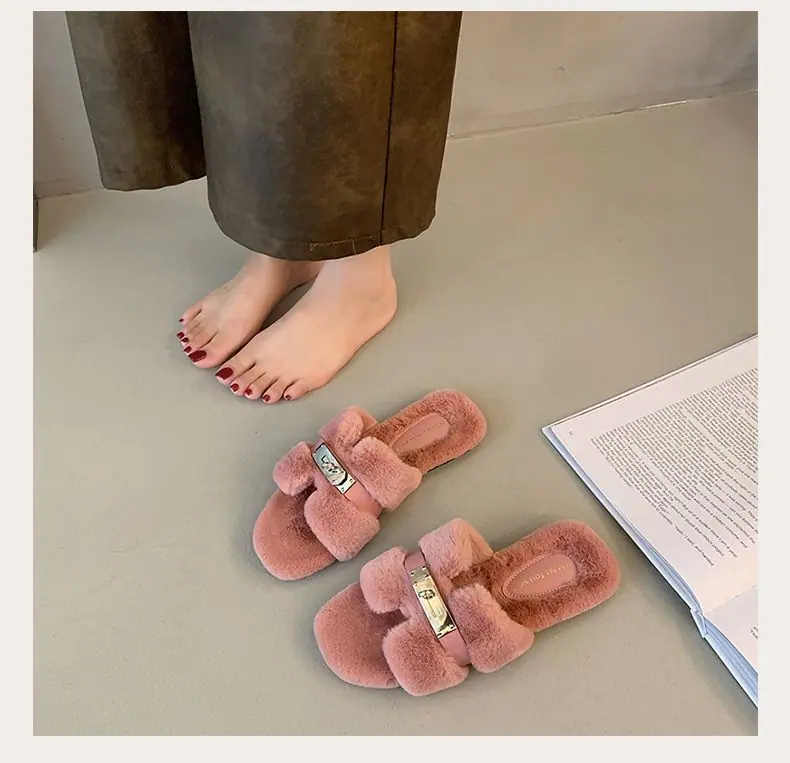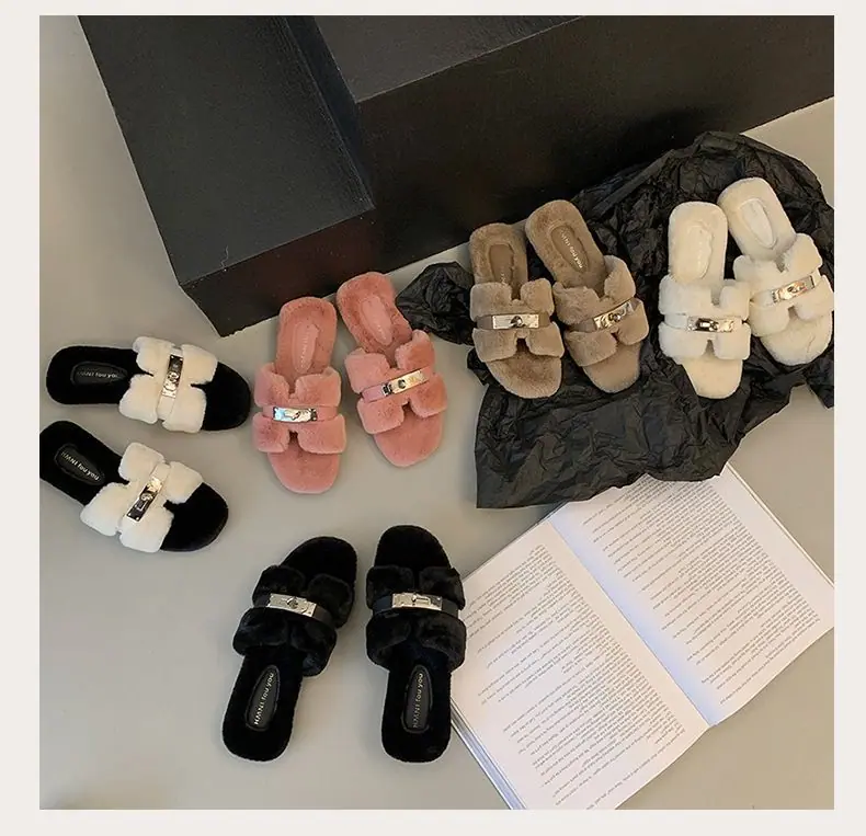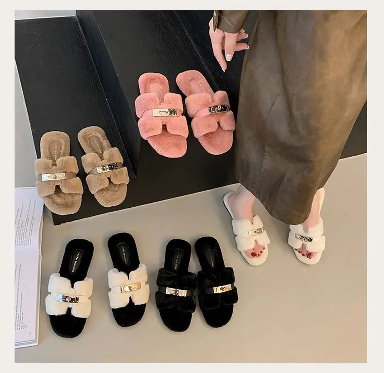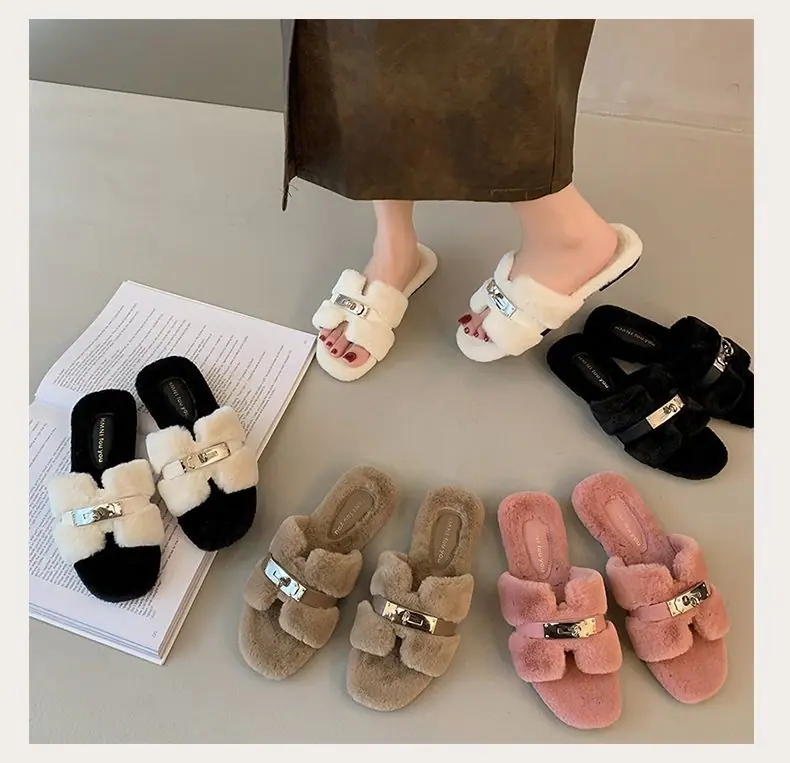 Pantuflas Esponjosas Nuevas Otoño/Invierno Pantuflas de Otoño Planas para Exterior Zapatos Suaves Mujer Estilo Coreano Cómodas Tacón Plano Celebridad Felpa Temperamento