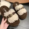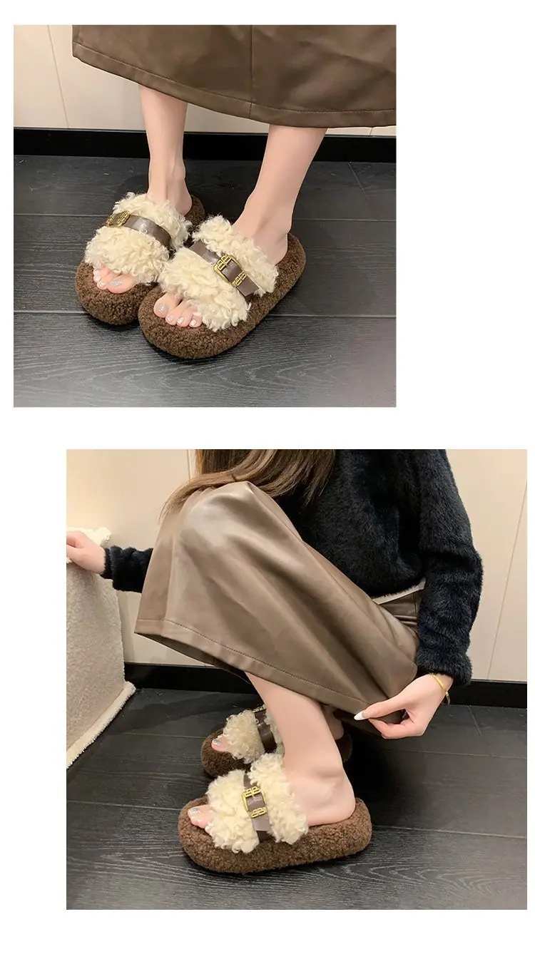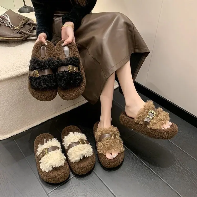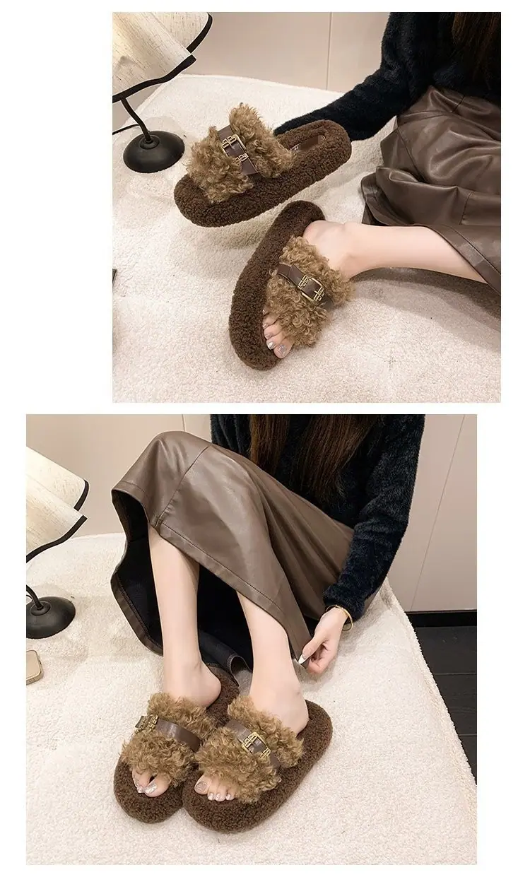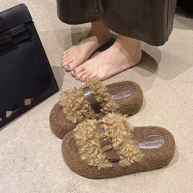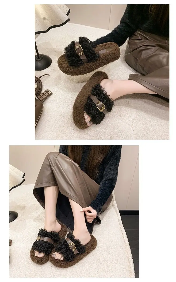 Nuevas Pantuflas de Suela Gruesa para Mujer para Salir 2025 Moda Otoño Invierno Hogar Peludas Hebilla Celebridad de Internet Pantuflas de Algodón
