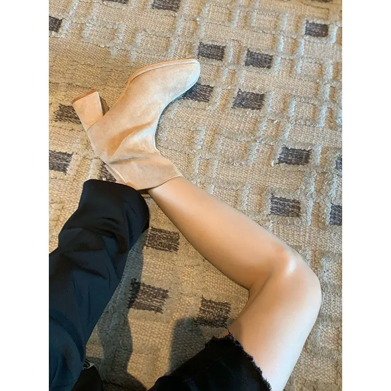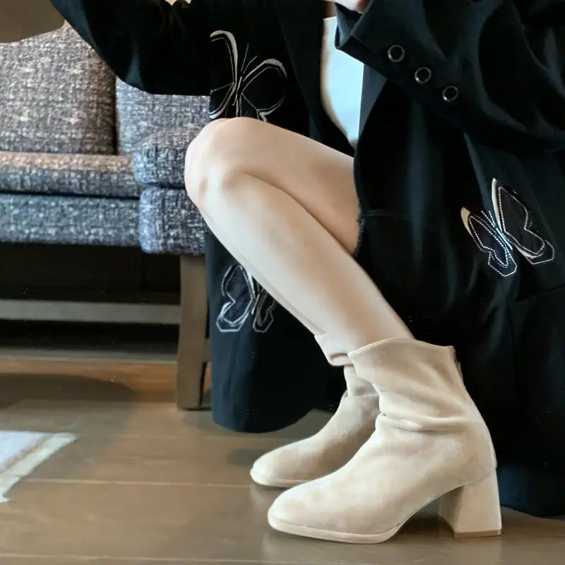Compra Botines de Tacón Alto Otoño e Invierno Gamuza Francesa Albaricoque Adelgazantes Cremallera Trasera Tacón Grueso Botas Elásticas Ajustadas al por mayor en Joom.pro