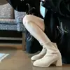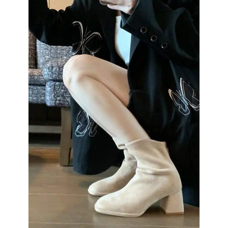 Botines de Tacón Alto Otoño e Invierno Gamuza Francesa Albaricoque Adelgazantes Cremallera Trasera Tacón Grueso Botas Elásticas Ajustadas