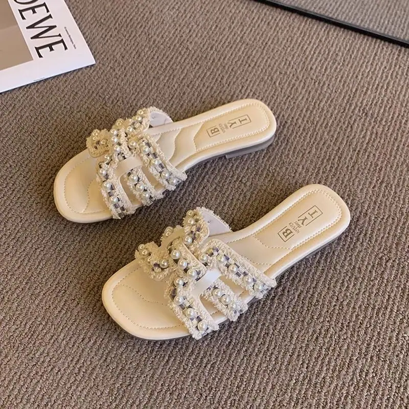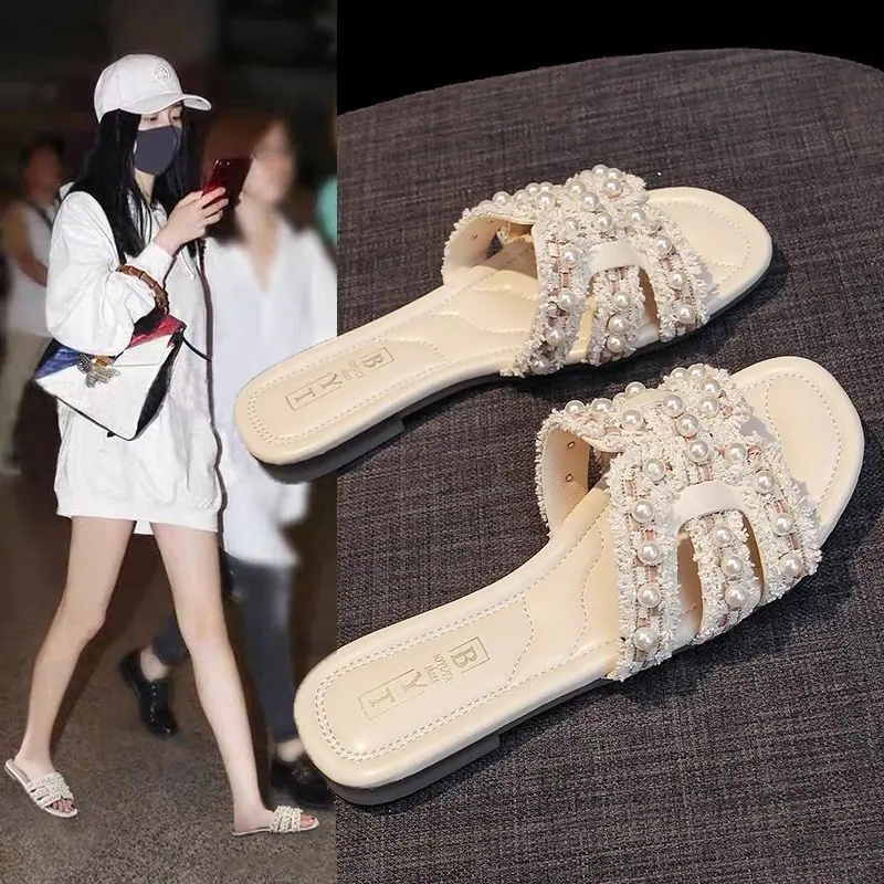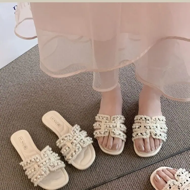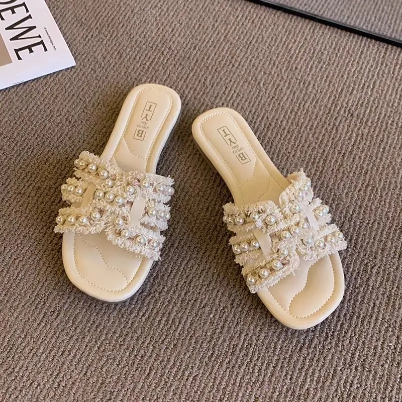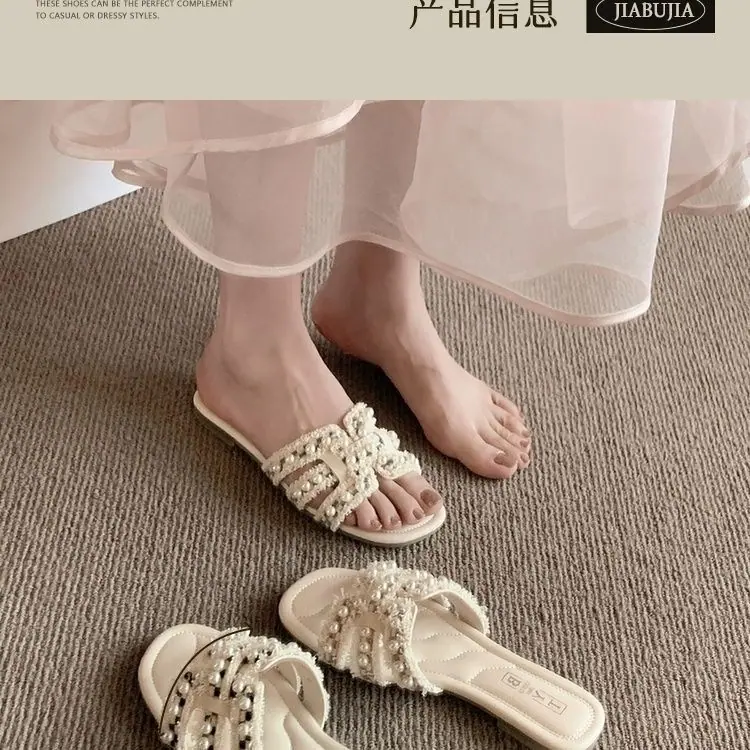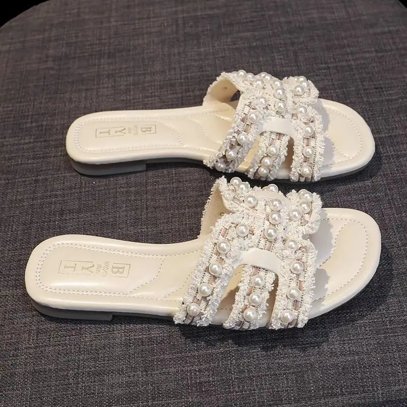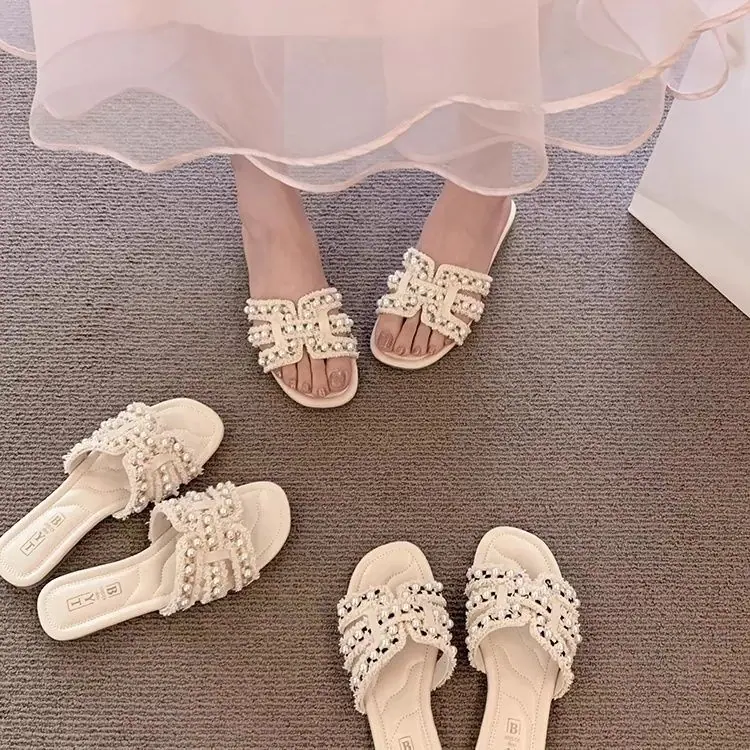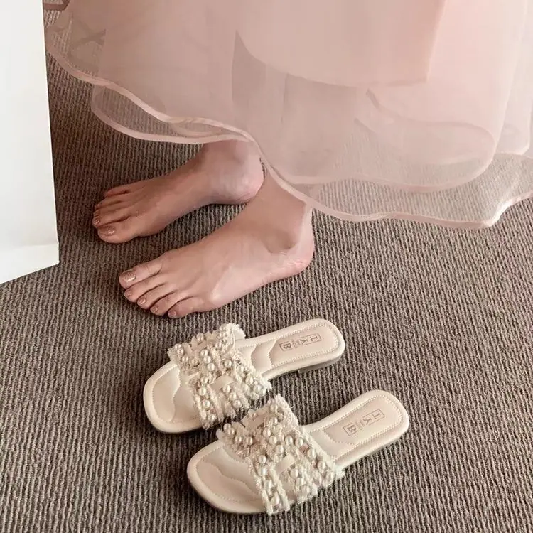 Diseño Europeo Perla Hada Chanclas de Playa Verano Nuevo Casual Hogar Pantuflas Planas