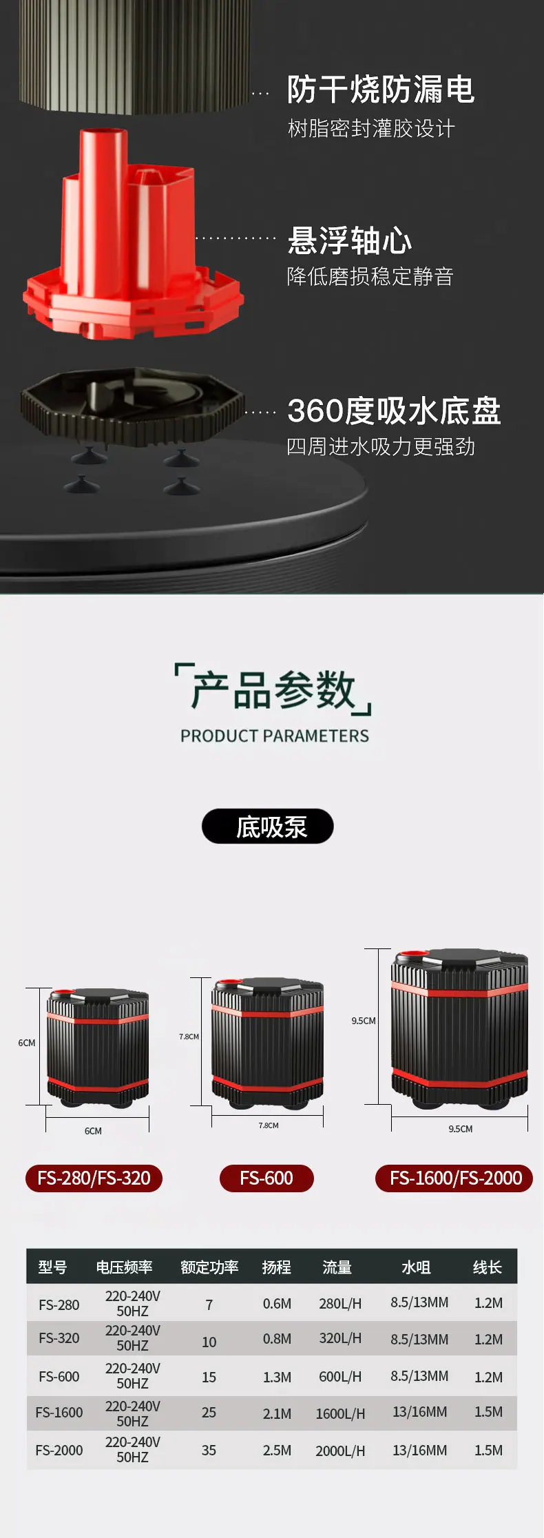 Bottom suction pump fs-280 (7w), Bottom suction pump fs-320(10w), Low suction pump fs-600 (15w), Bottom suctio...