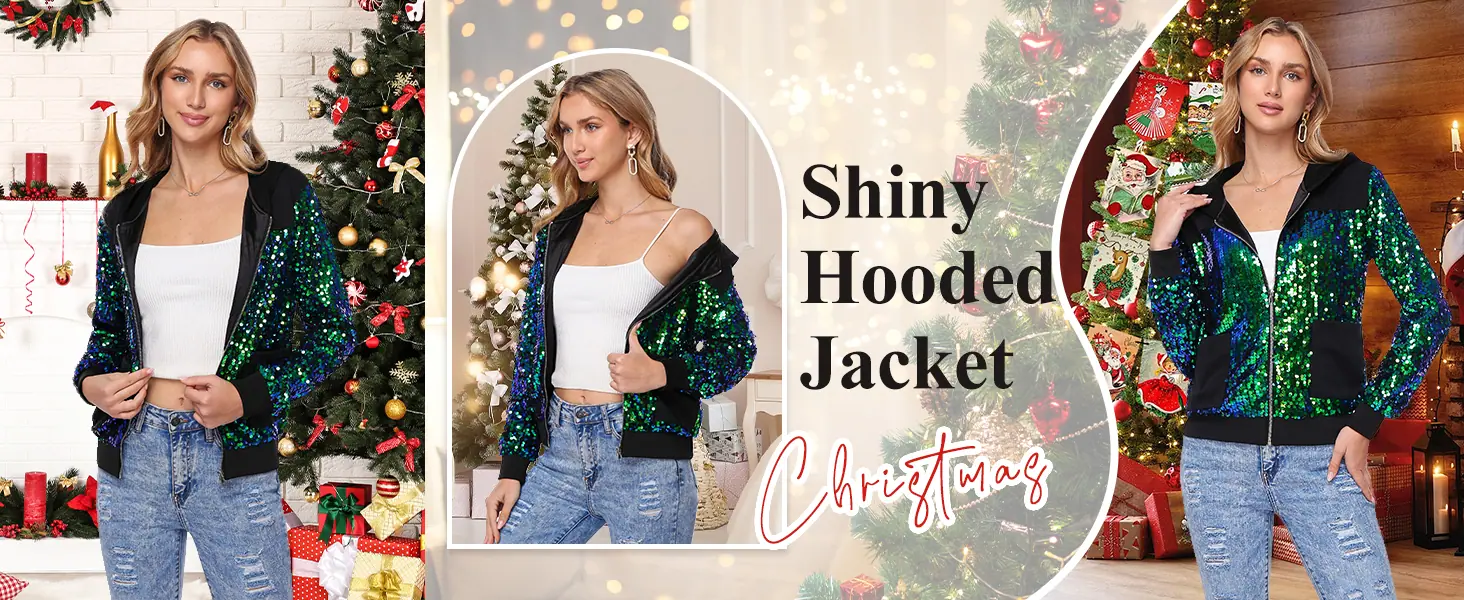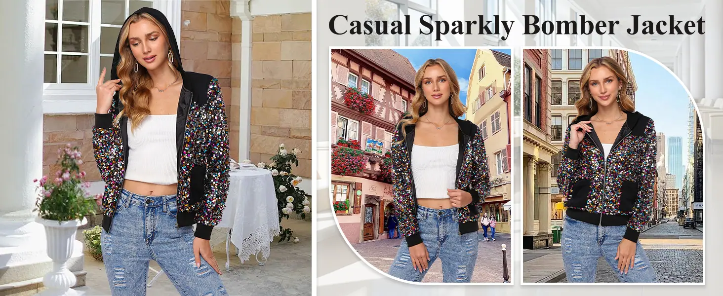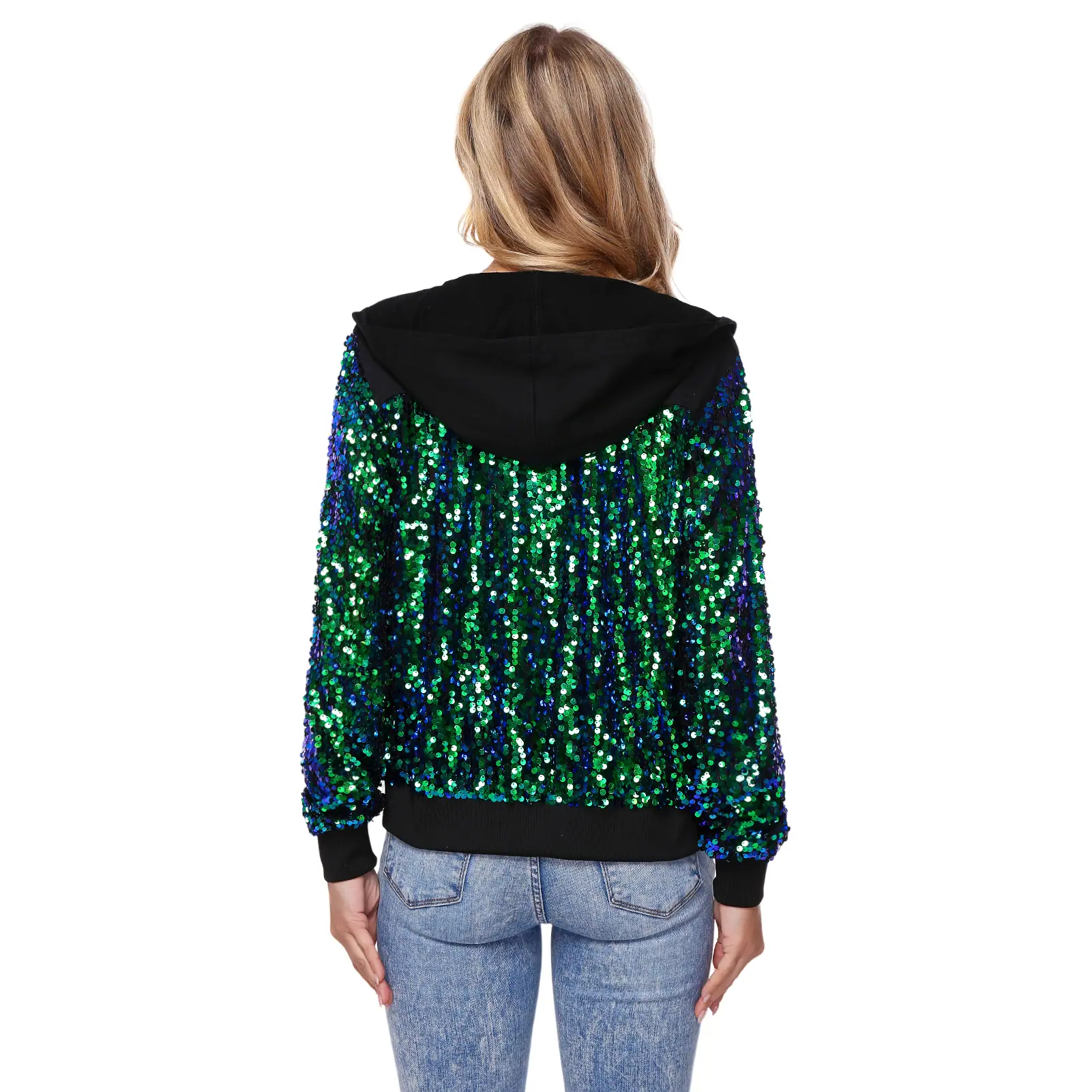 Fácil de combinar: La chamarra brillante con capucha, para un look deportivo, puedes combinarla con leggings y tenis para añadir un toque de glamour a tu entrenamiento o salida casual.. Para una fiesta o reunión social, puedes combinarlo con jeans o una falda y botas para fusionar sin esfuerzo la comodidad con un brillo llamativo, haciéndote el centro de atención..