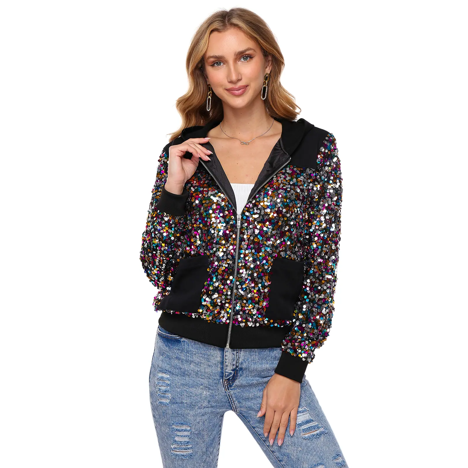 Características: La chamarra con brillo combina características prácticas con un estilo audaz, destacando por su diseño audaz de bloques de color, con bolsillos convenientes para la funcionalidad, una capucha para mayor calidez y versatilidad, y lentejuelas brillantes que aportan un toque de glamour.. El abrigo brillante de lentejuelas es una mezcla perfecta de comodidad, funcionalidad y moda llamativa.