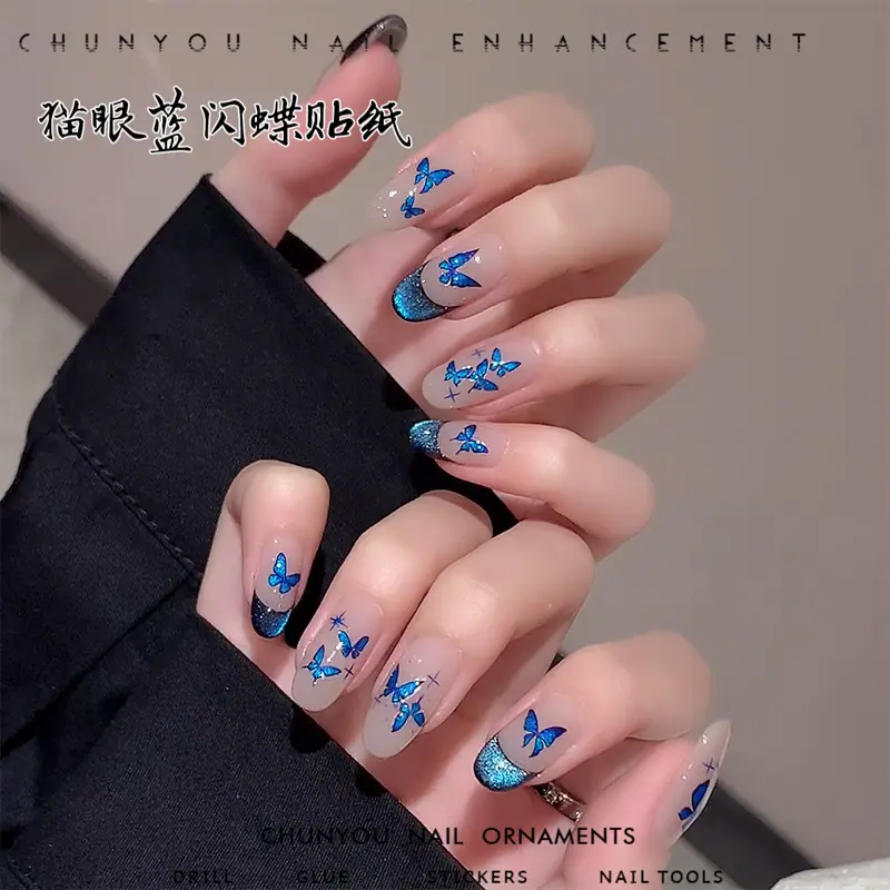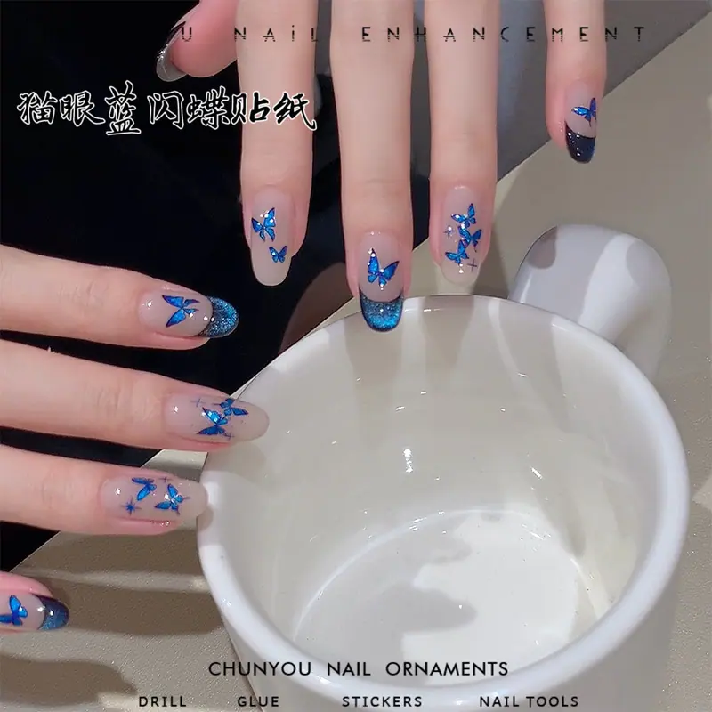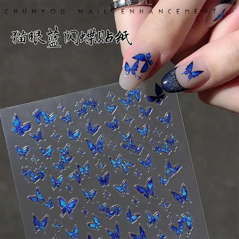 Compra Nuevas Calcomanías de Mariposas Flash Azul Bling Hada Ojo de Gato Azul Mariposa Estrellas Calcomanías Autoadhesivas Decoraciones para Arte de Uñas al por mayor en Joom.pro