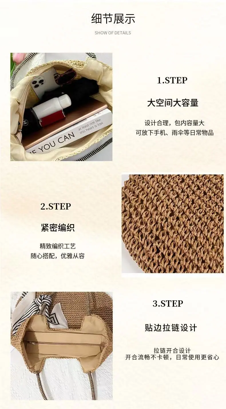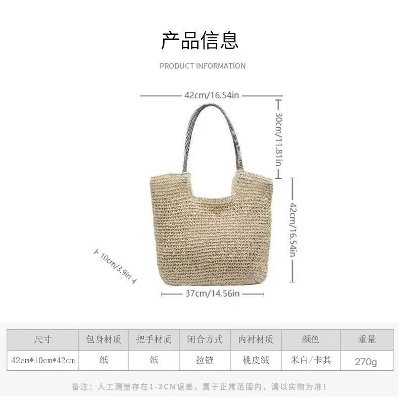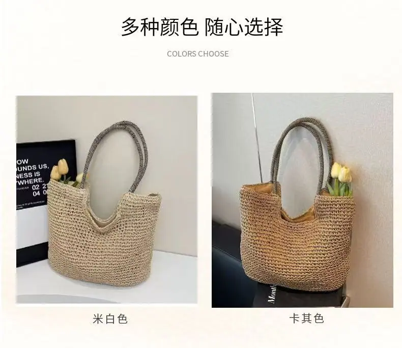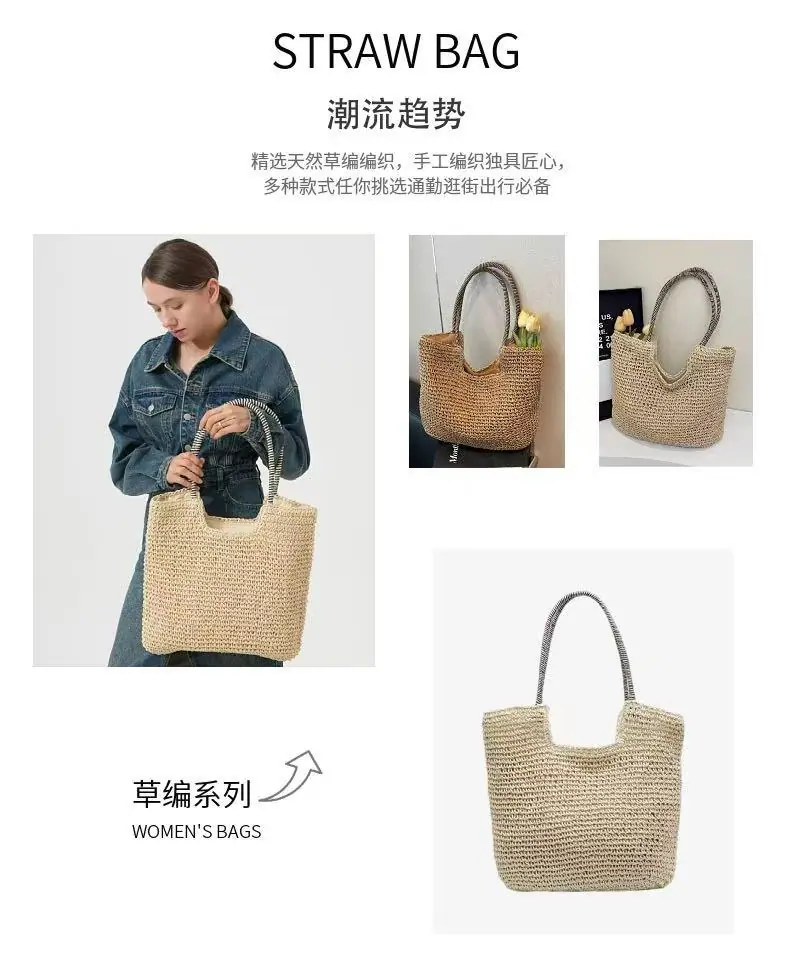Nuevo Bolso de Hombro Sencillo de Paja para Vacaciones en la Playa, Bolso Tejido a Mano, Bolso Tote de Hombro de Gran Capacidad, Bolso de Playa