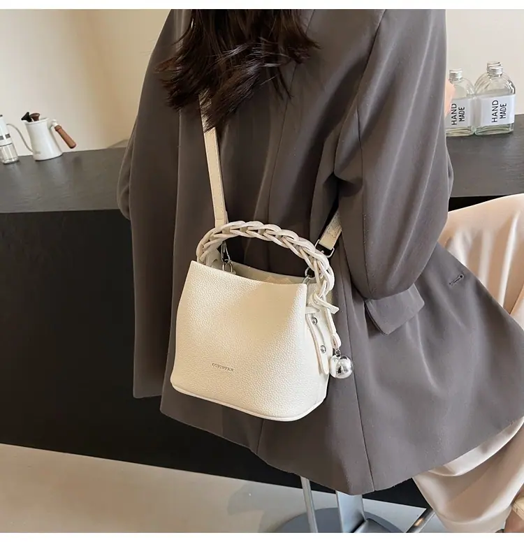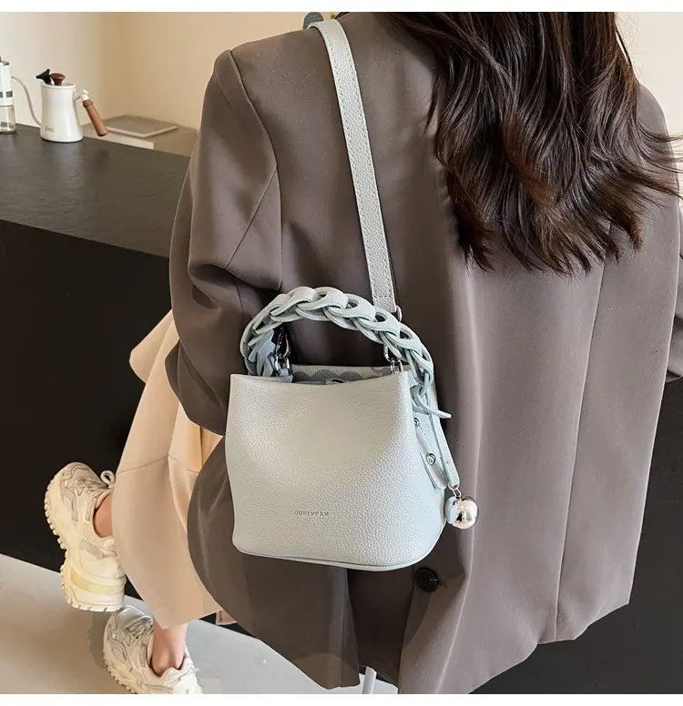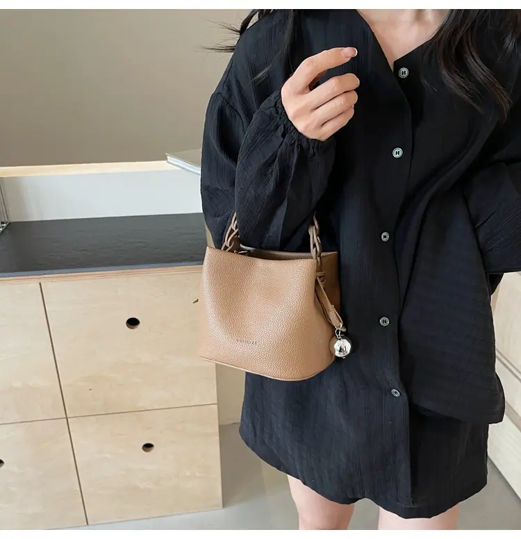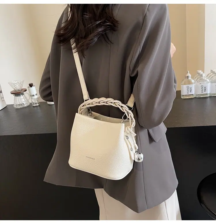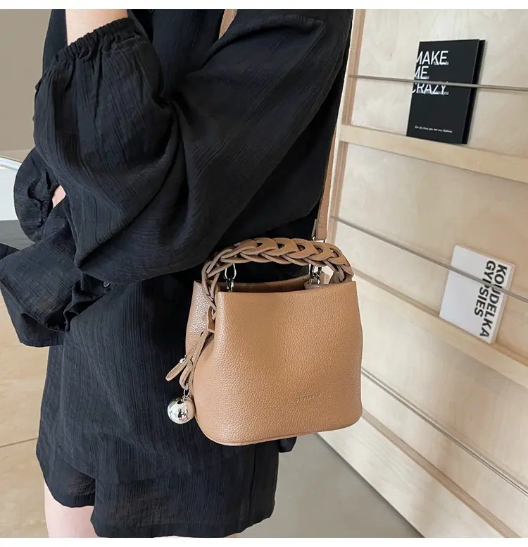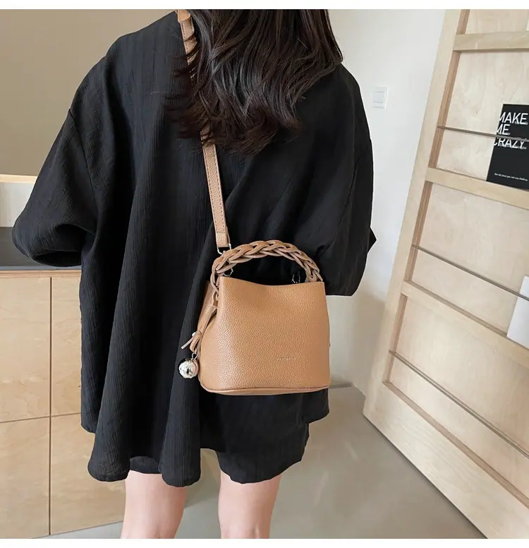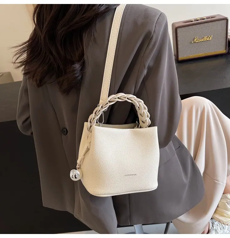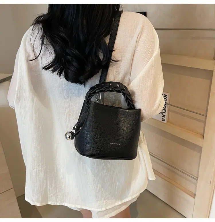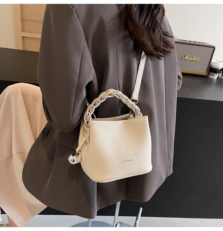 Bolso tote tipo cubo tejido transfronterizo 2025 nuevo estilo coreano cuero suave patrón lichi gran capacidad un solo hombro bandolera moderno