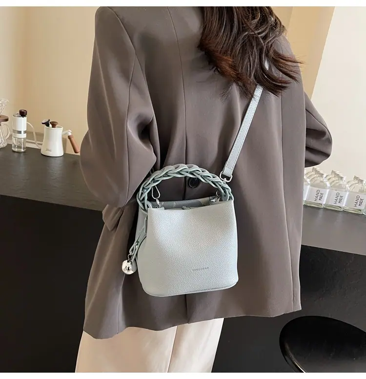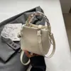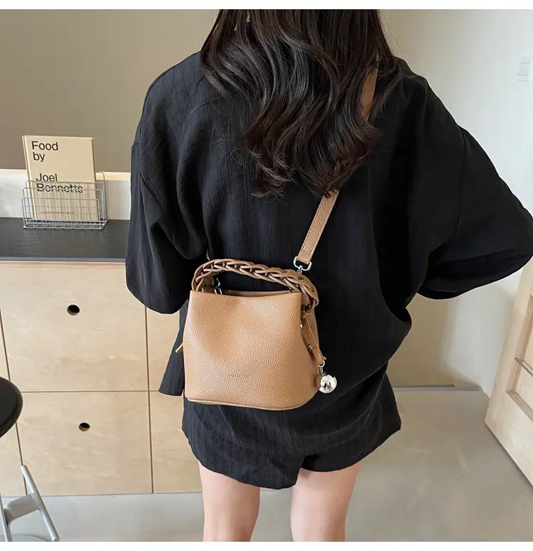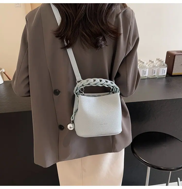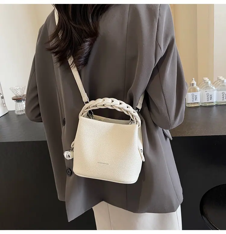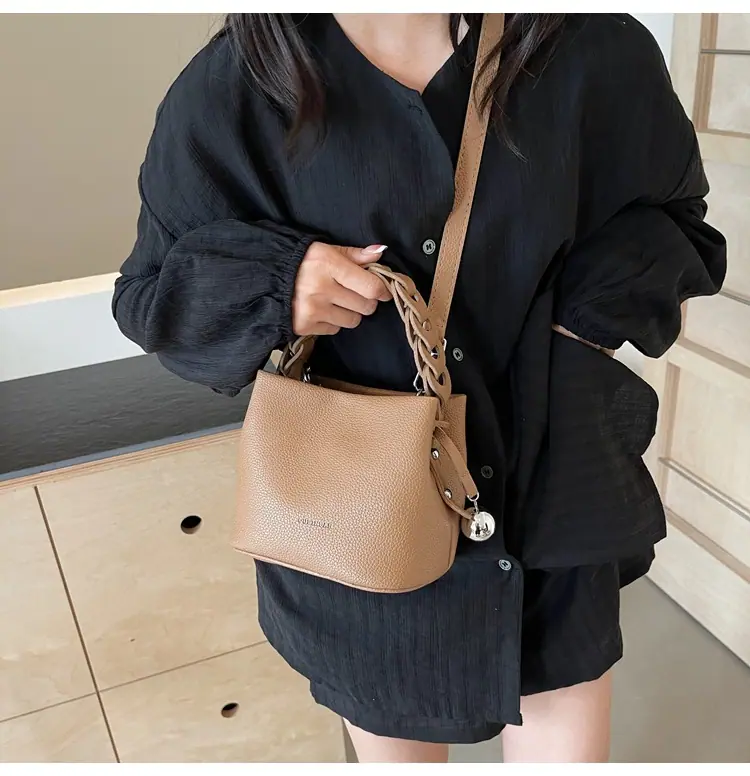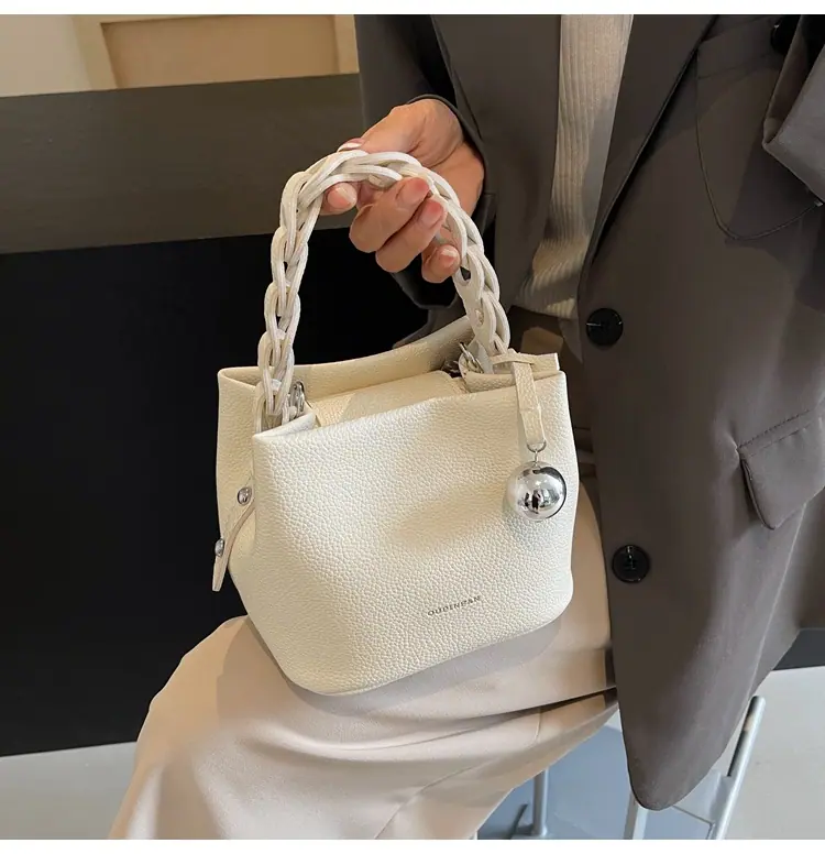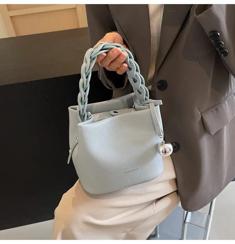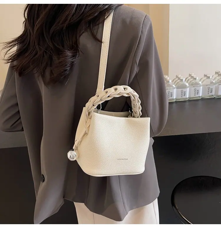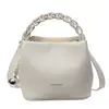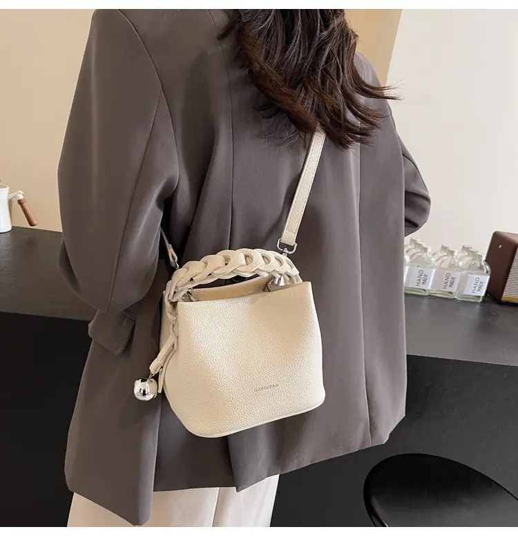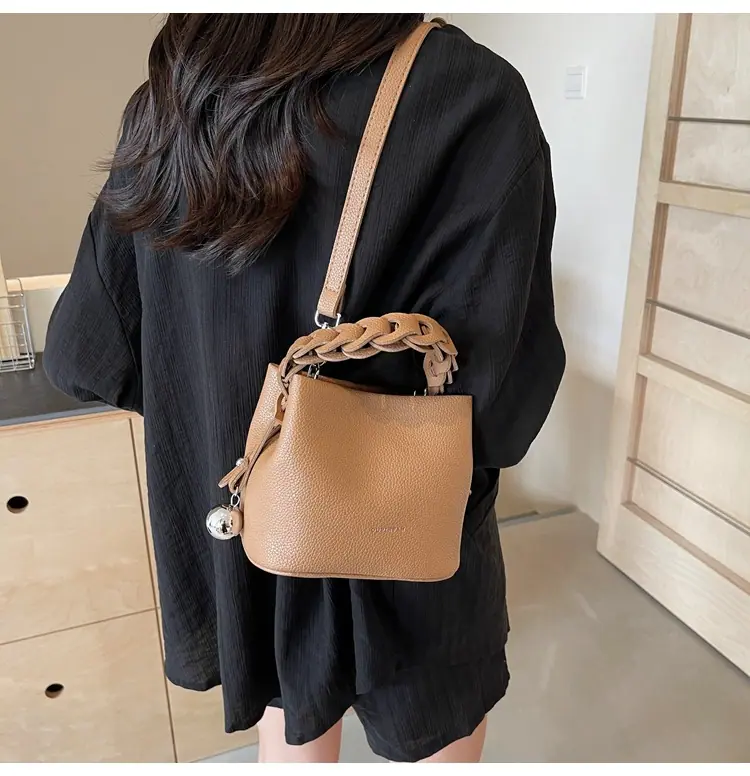 Bolso tote tipo cubo tejido transfronterizo 2025 nuevo estilo coreano cuero suave patrón lichi gran capacidad un solo hombro bandolera moderno