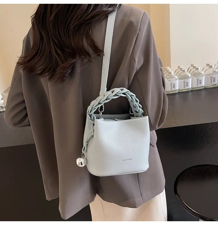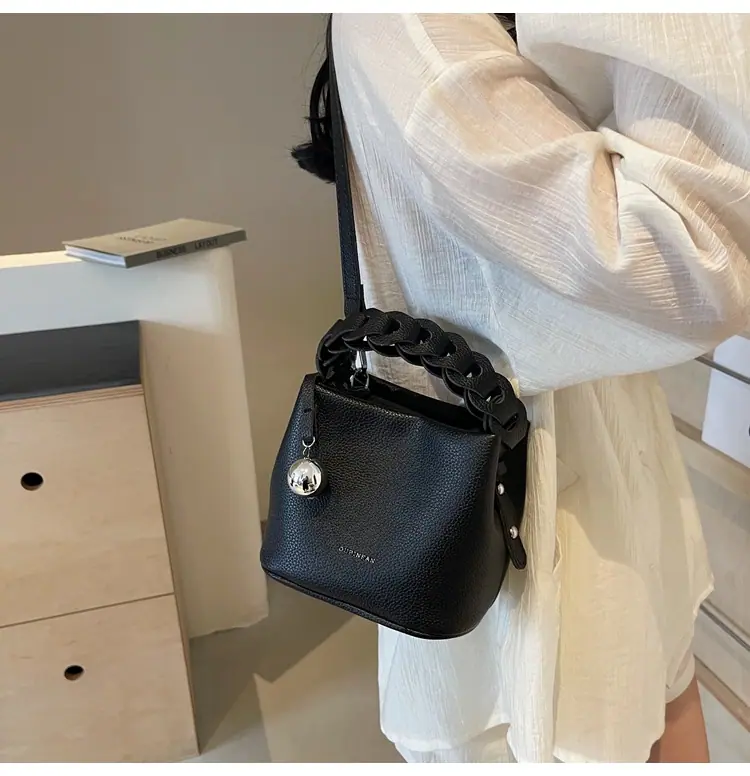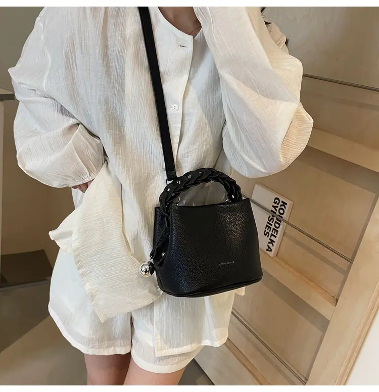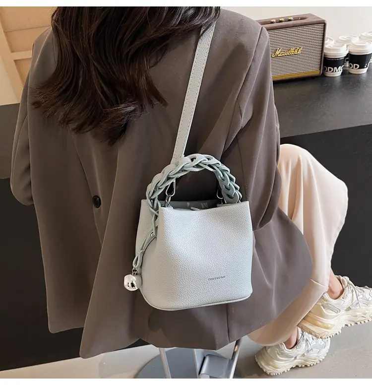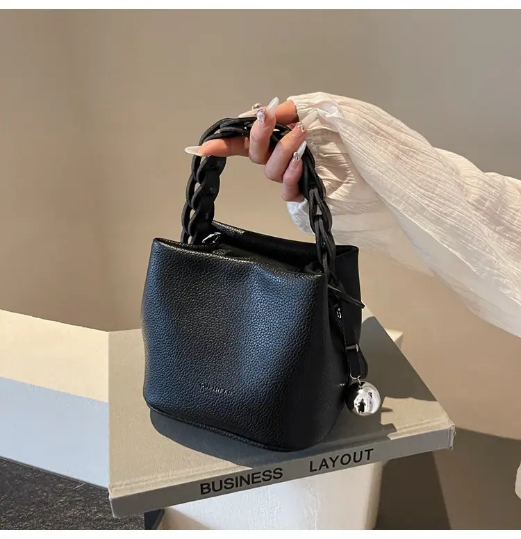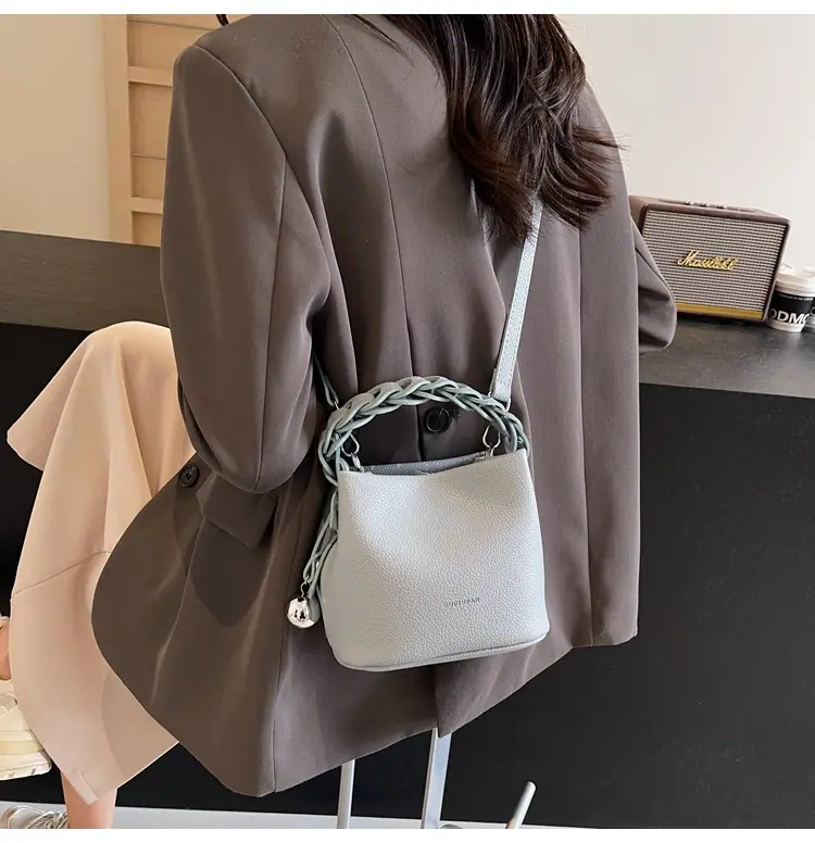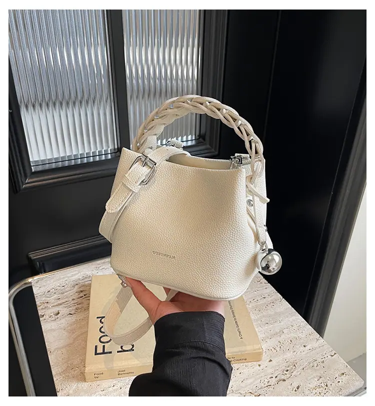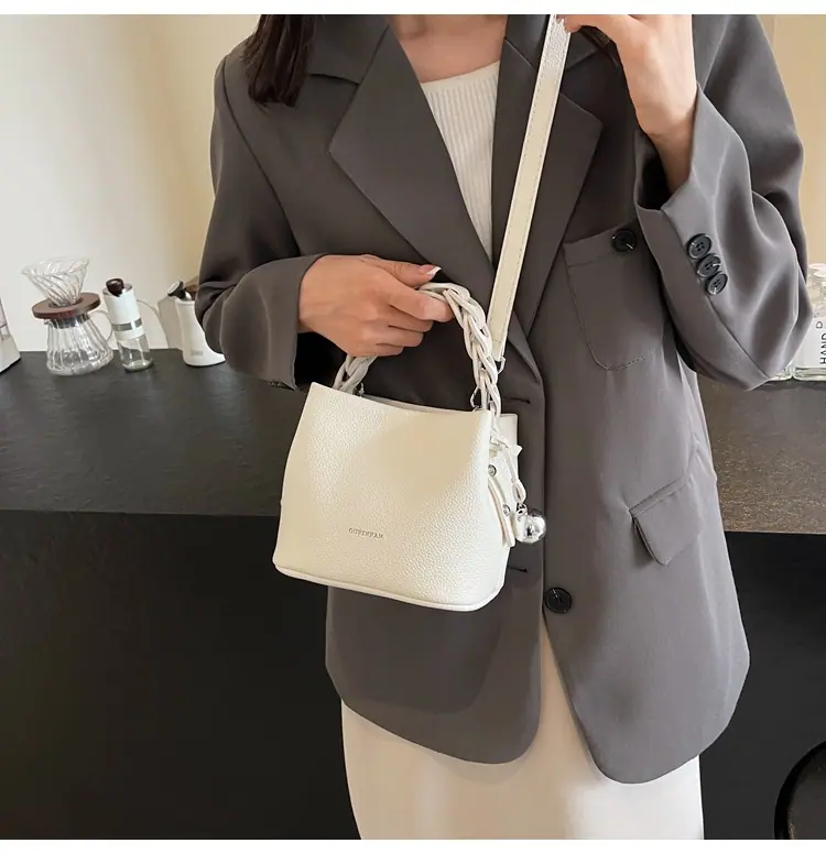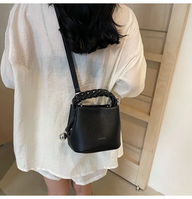 Bolso tote tipo cubo tejido transfronterizo 2025 nuevo estilo coreano cuero suave patrón lichi gran capacidad un solo hombro bandolera moderno