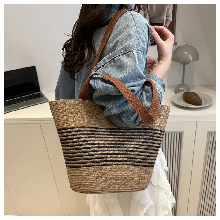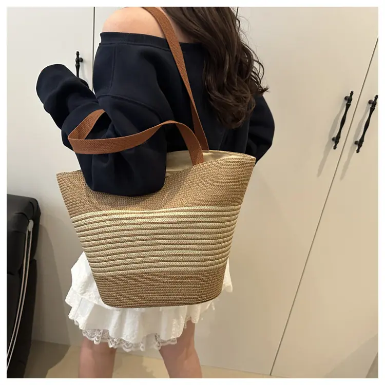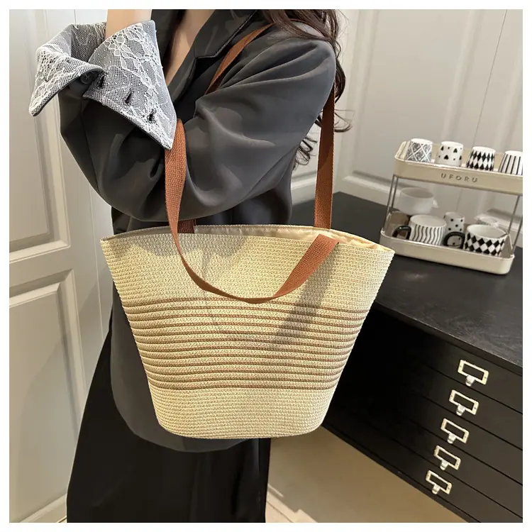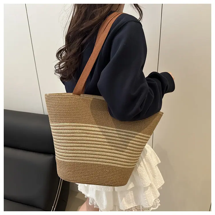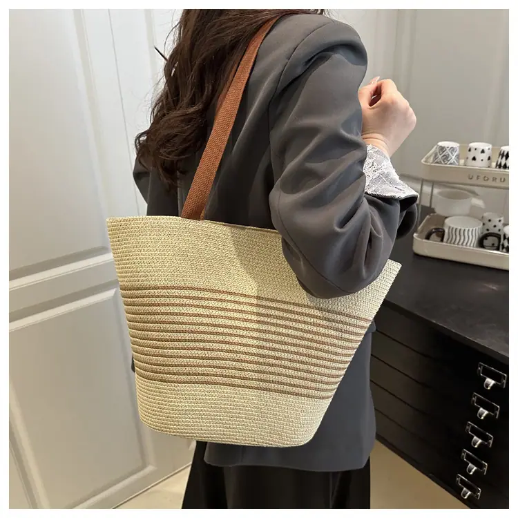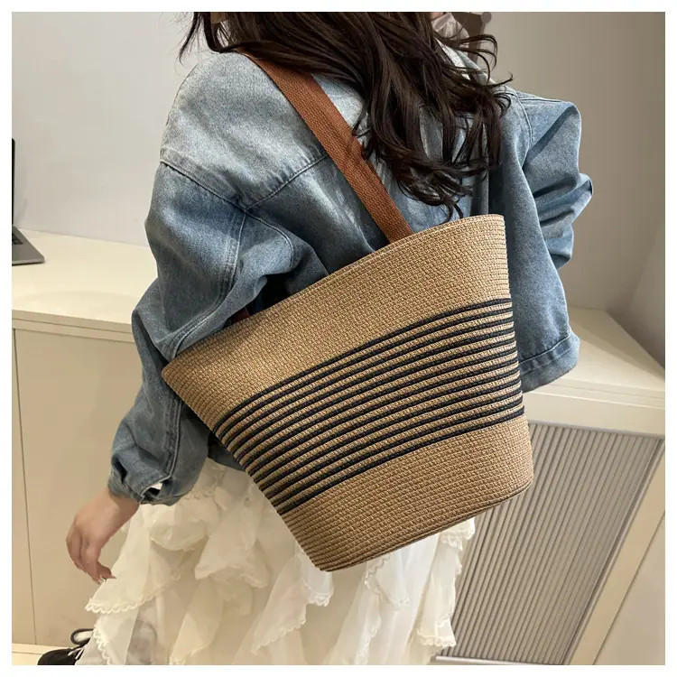 Bolso de Paja Tejida de Moda al Por Mayor Bolso de Mano de Verano para Mujer Bolso Tote Tejido de Gran Capacidad Bolso de Hombro Tejido Playa Ratán Tejido Bolso Cubo