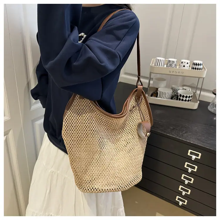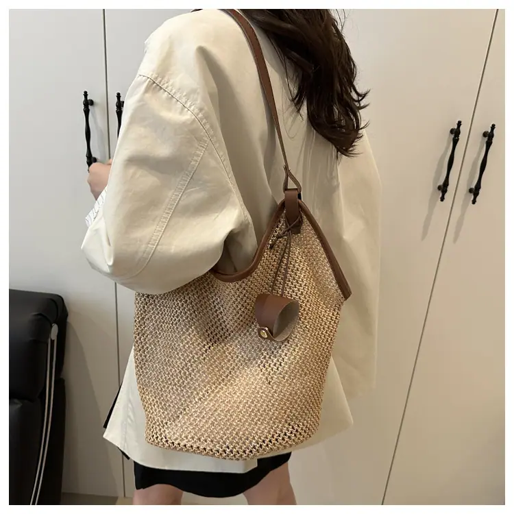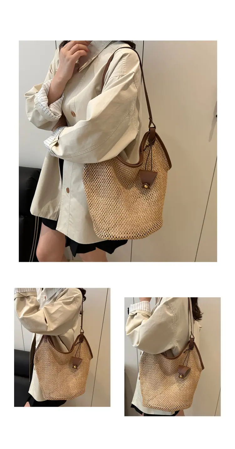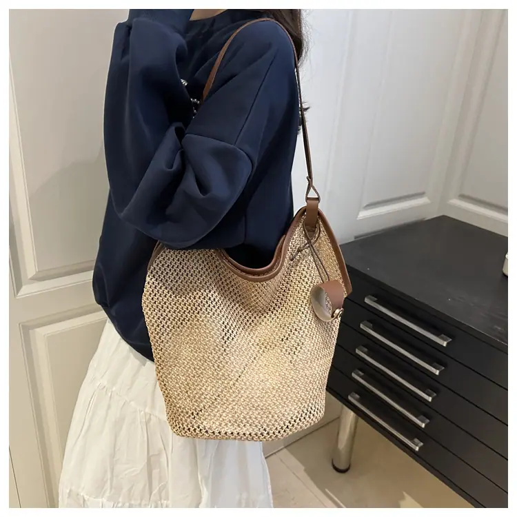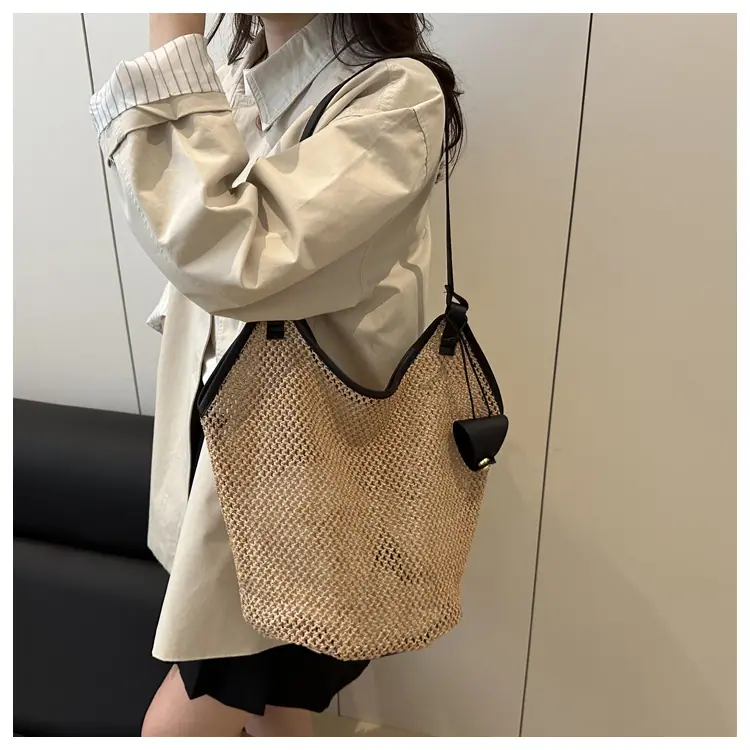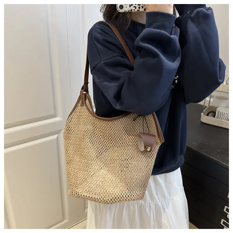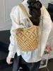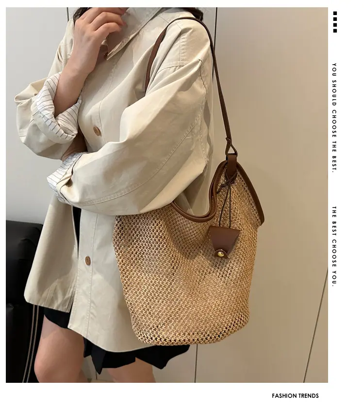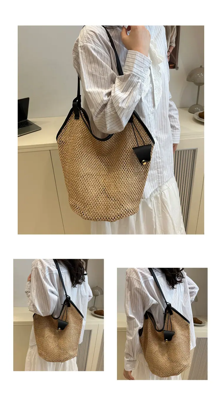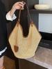 Verano 2025 Nuevo Bolso de Paja Tejida Moda Mujer Coreano Nicho Un Solo Hombro Bolso Balde Bolso de Playa para la Orilla del Mar