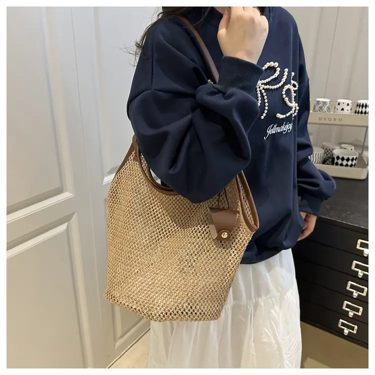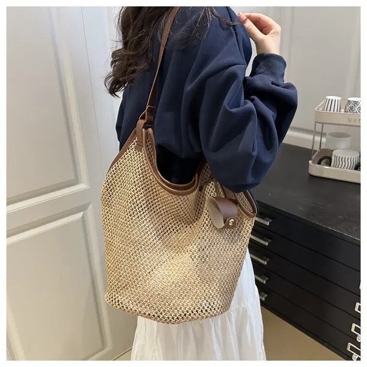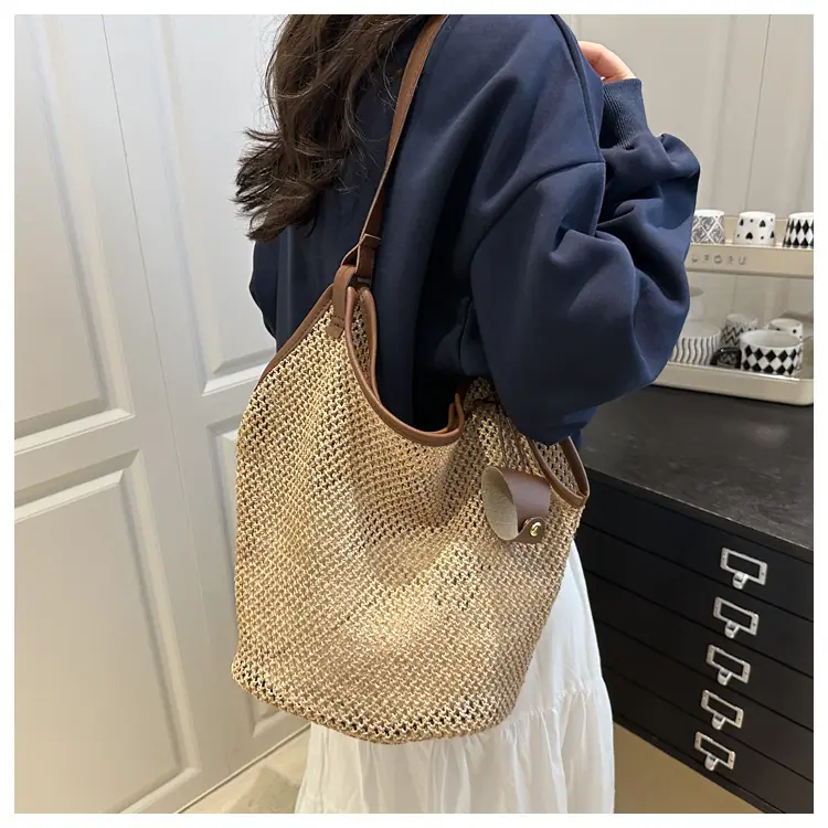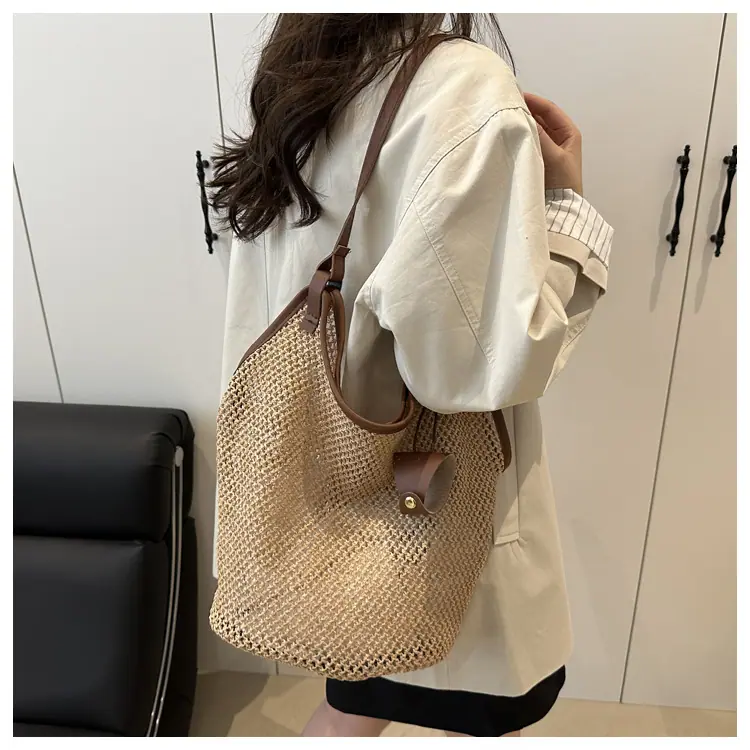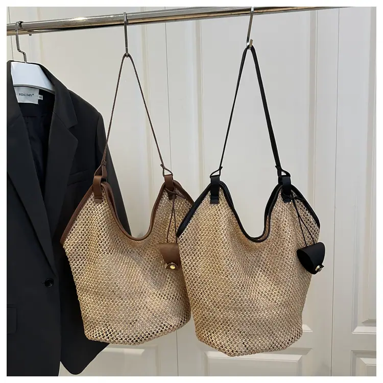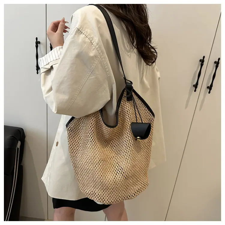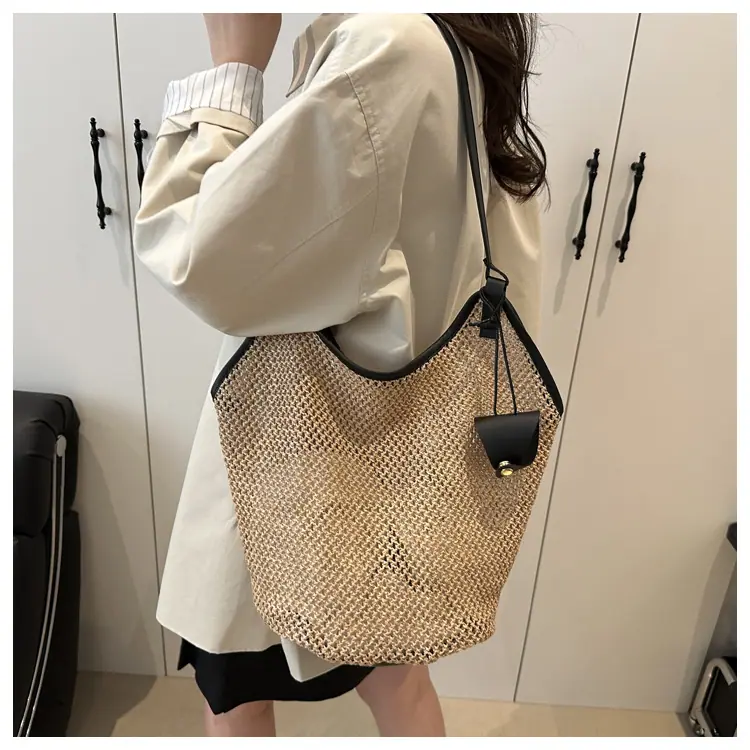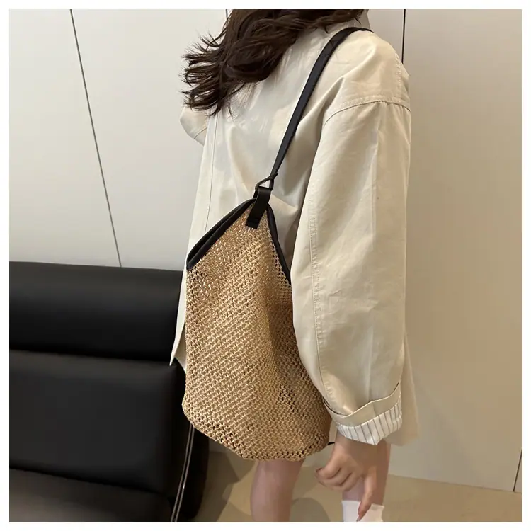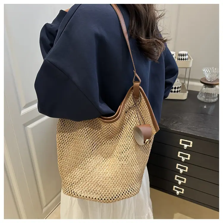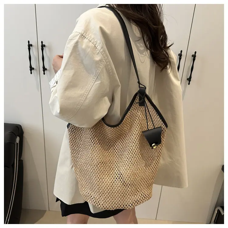 Verano 2025 Nuevo Bolso de Paja Tejida Moda Mujer Coreano Nicho Un Solo Hombro Bolso Balde Bolso de Playa para la Orilla del Mar