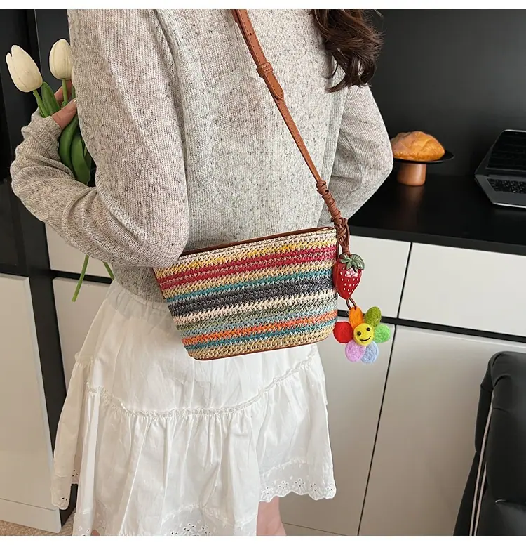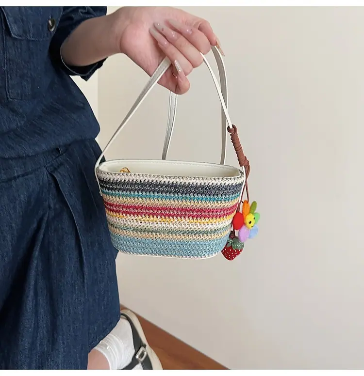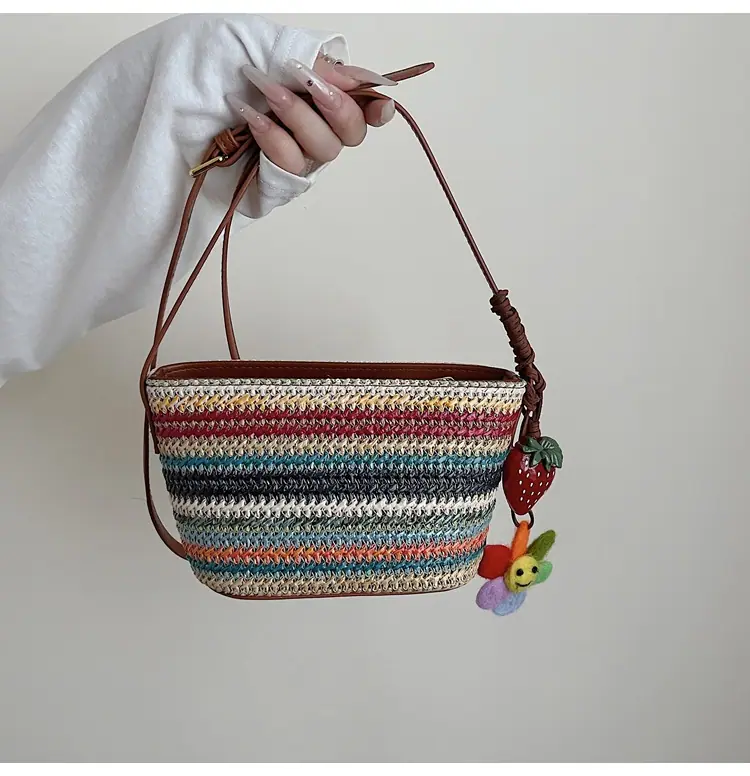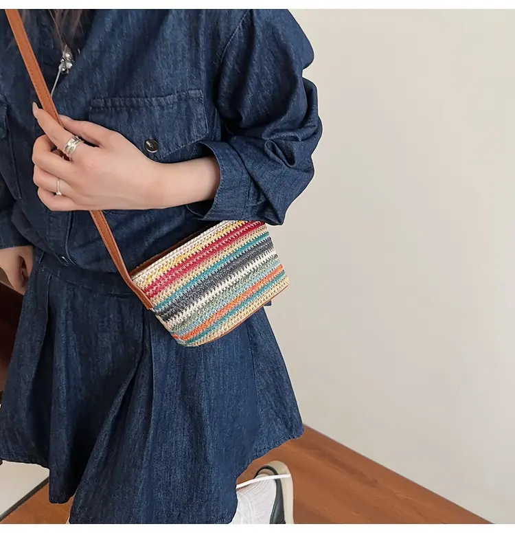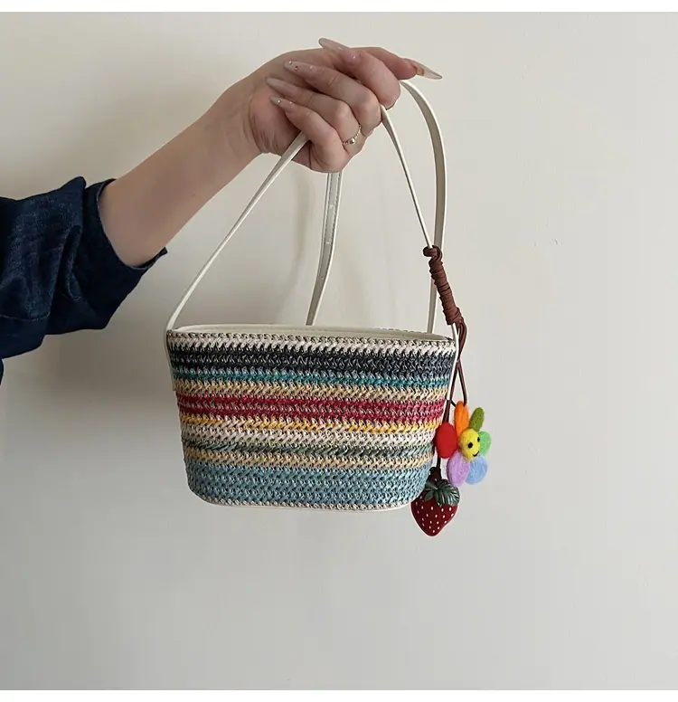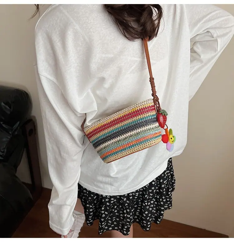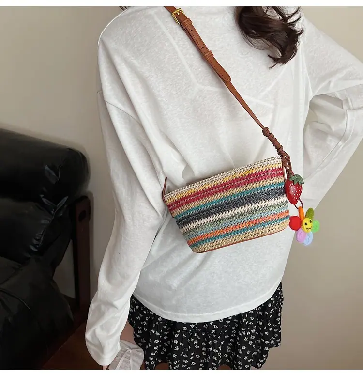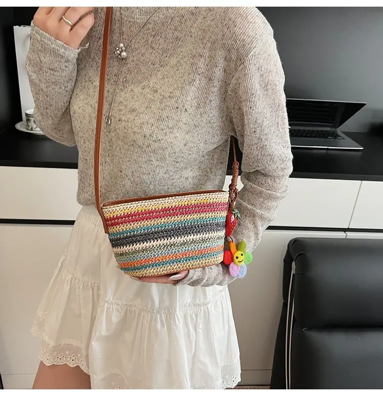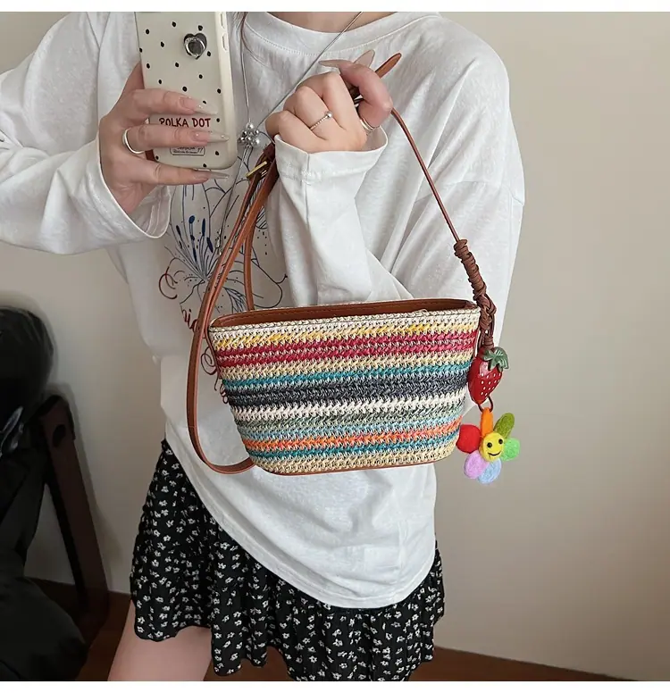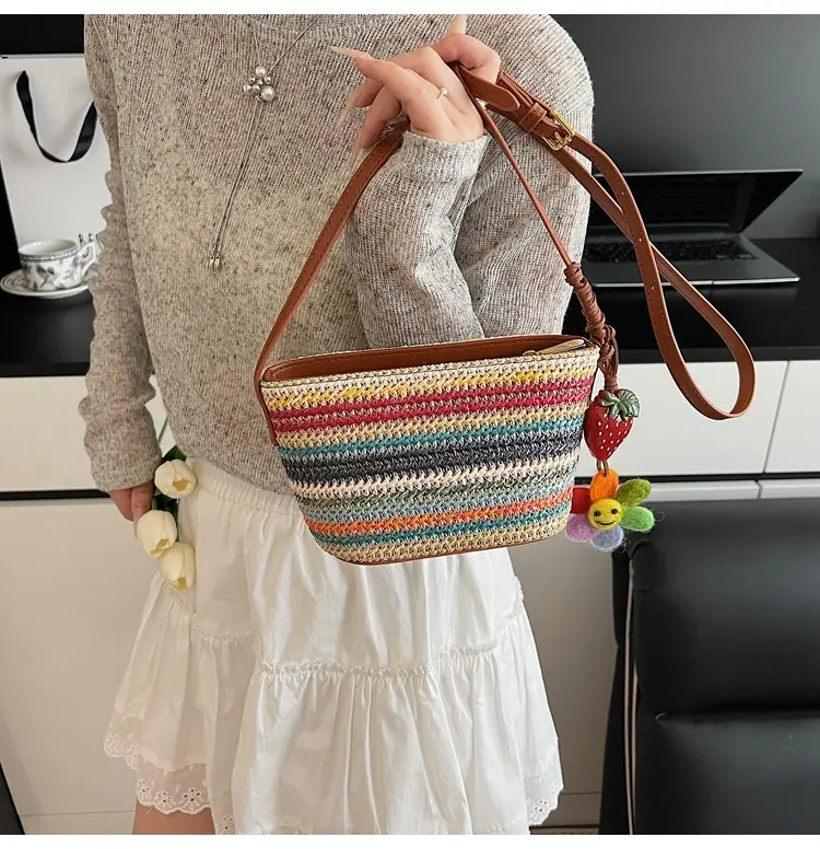 Bolso Pequeño de Paja Colorido de Playa 2025 Verano Nuevo Moderno de Un Hombro Cruzado Bajo el Brazo Bolso Cubo Tejido de Moda