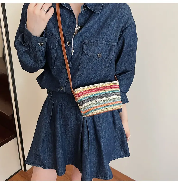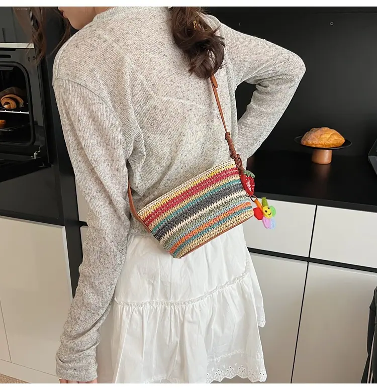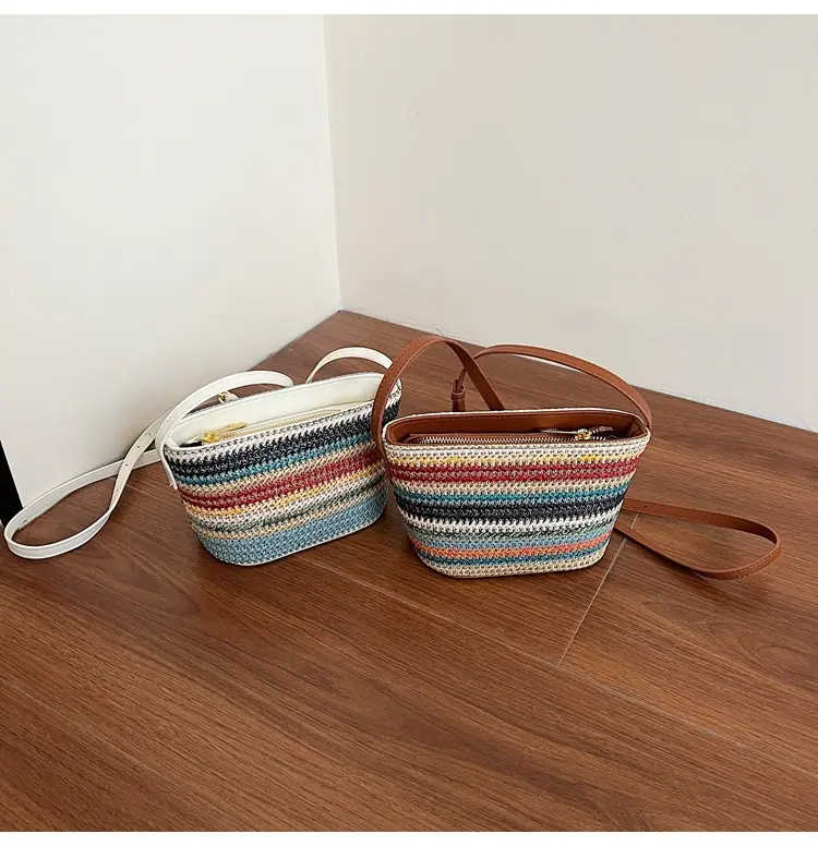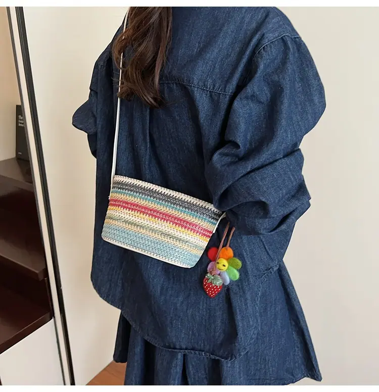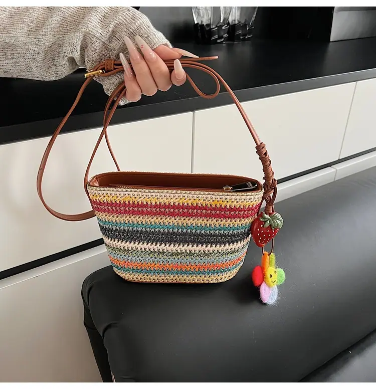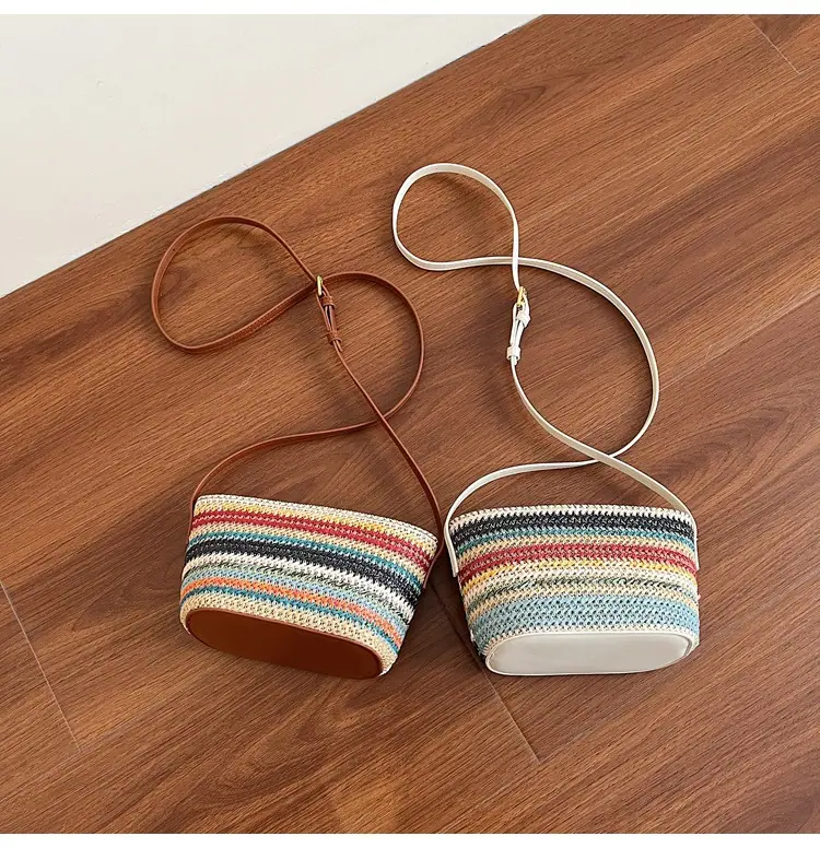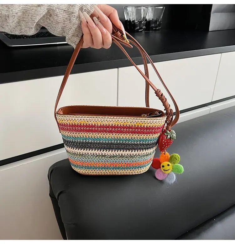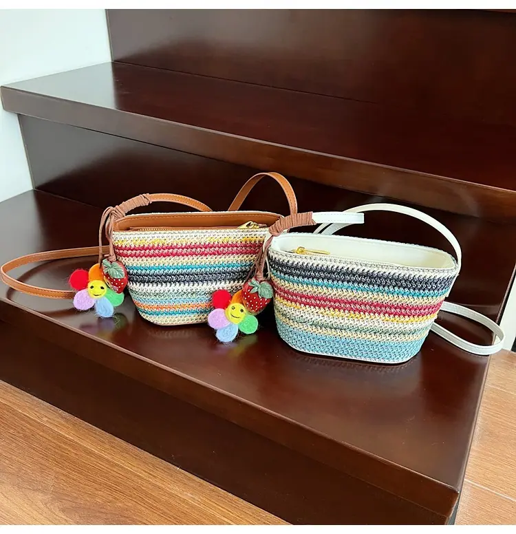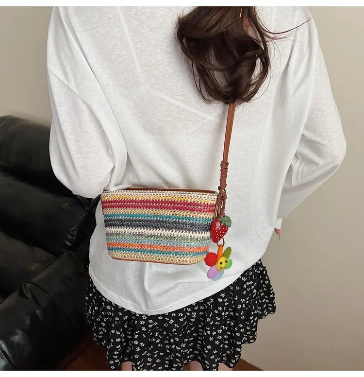 Bolso Pequeño de Paja Colorido de Playa 2025 Verano Nuevo Moderno de Un Hombro Cruzado Bajo el Brazo Bolso Cubo Tejido de Moda