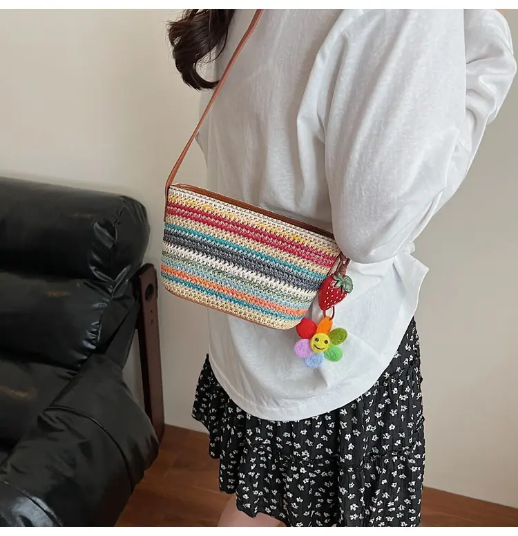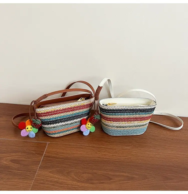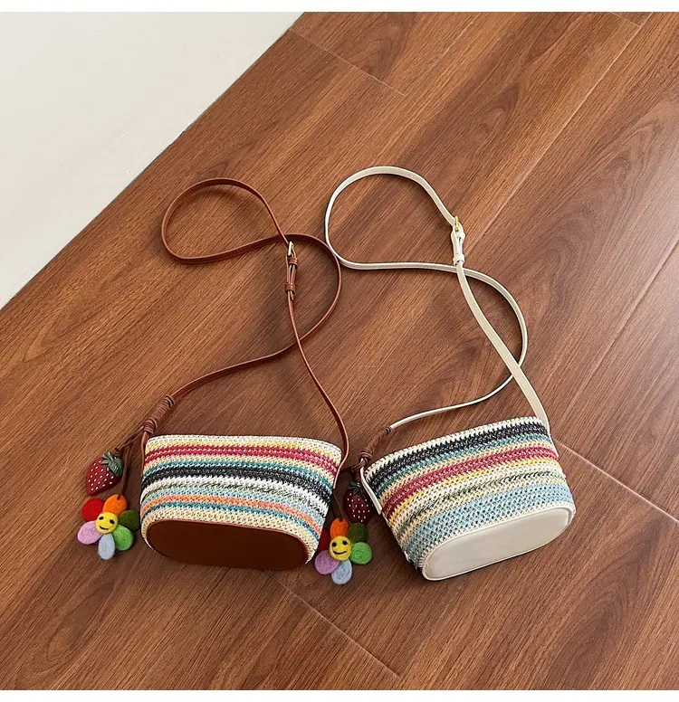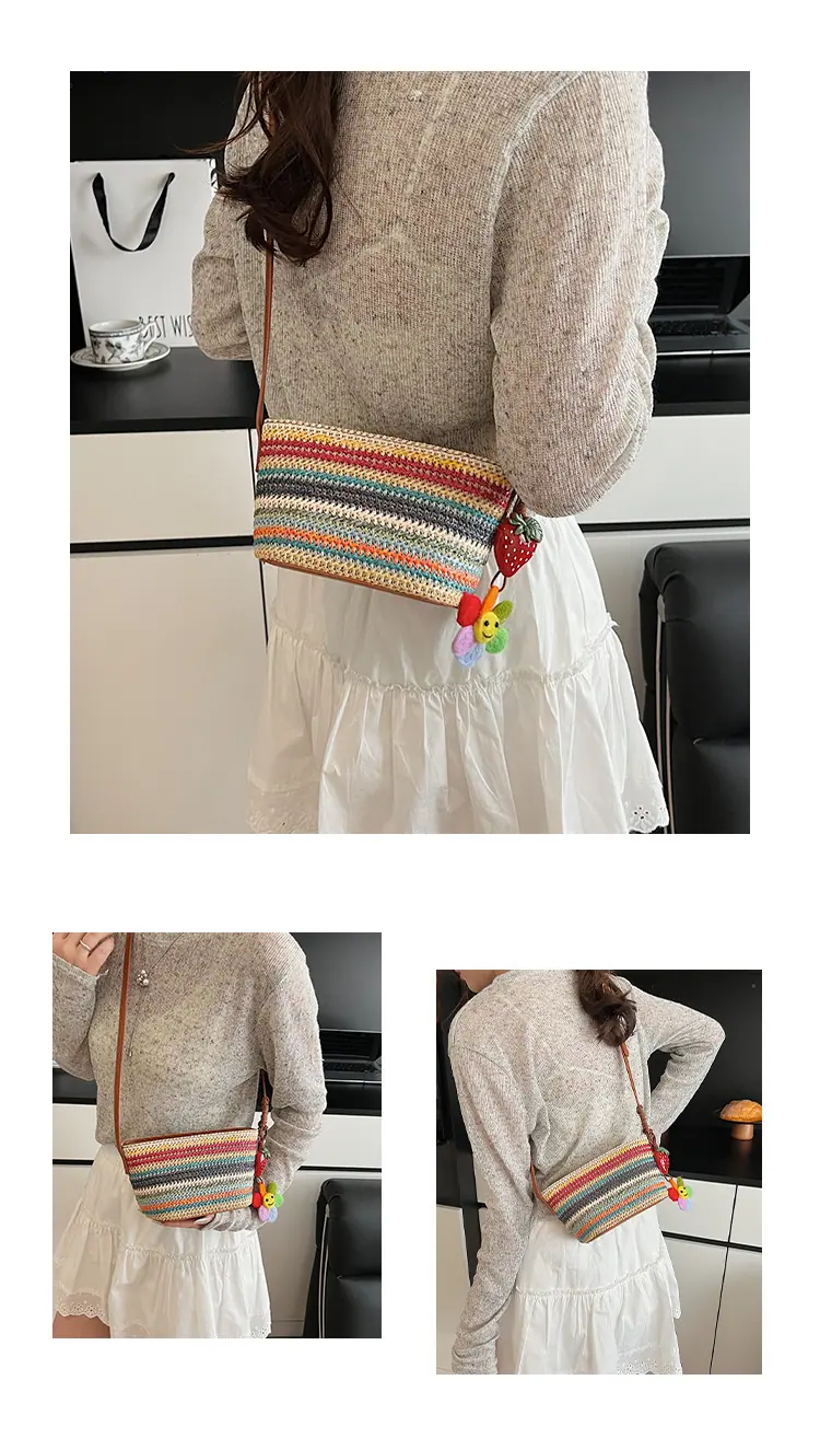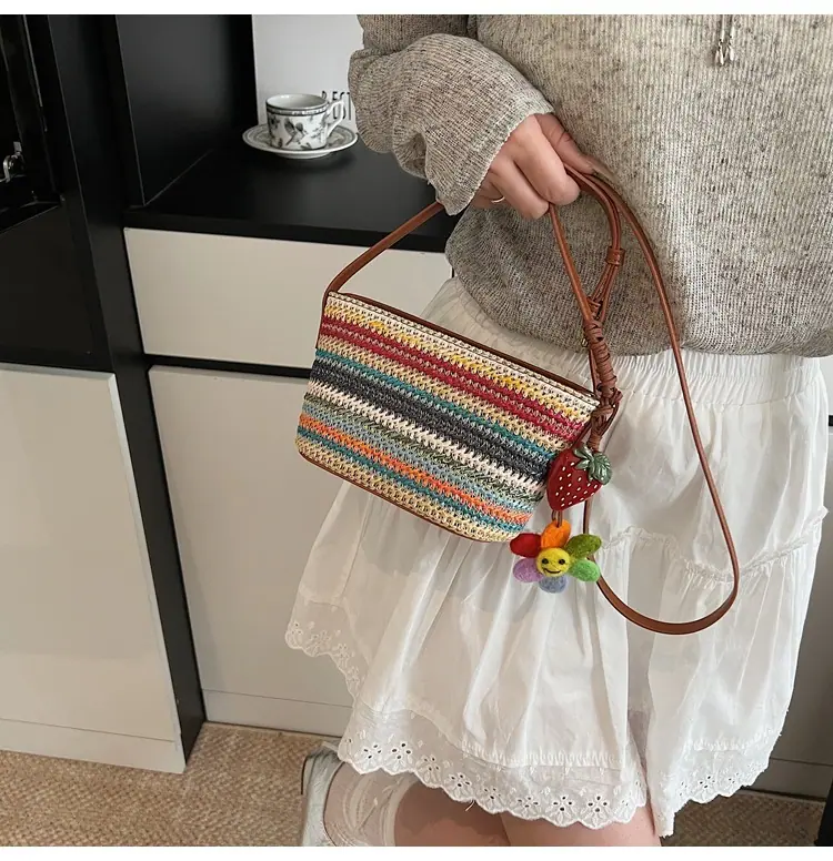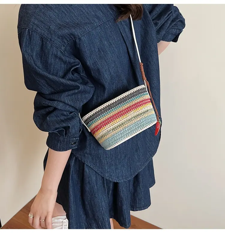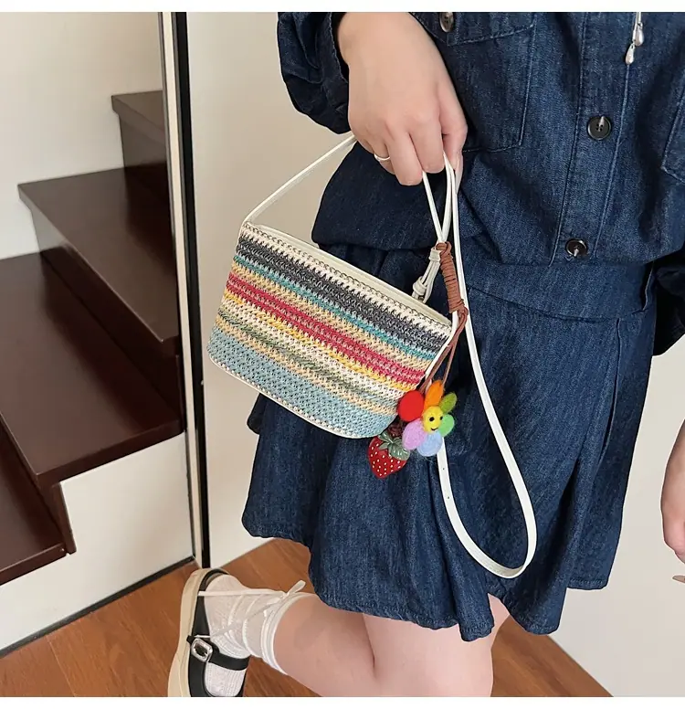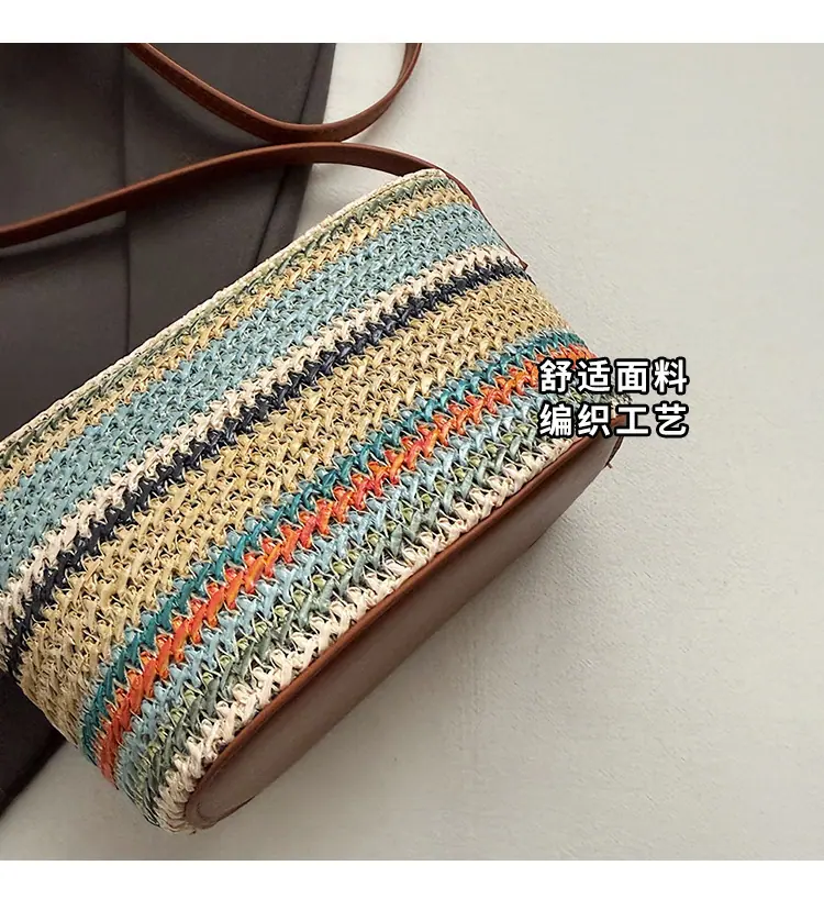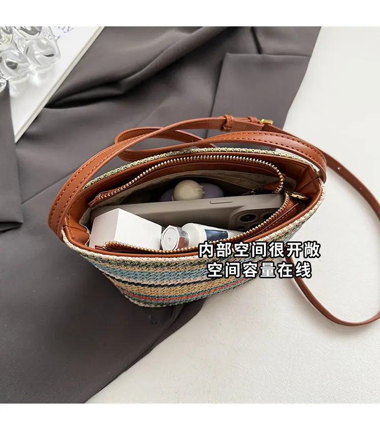 Bolso Pequeño de Paja Colorido de Playa 2025 Verano Nuevo Moderno de Un Hombro Cruzado Bajo el Brazo Bolso Cubo Tejido de Moda