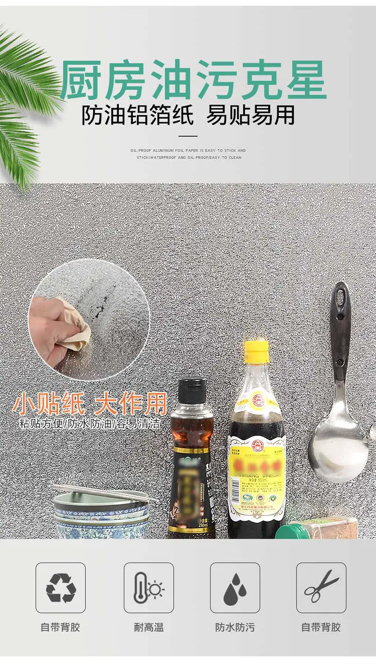Este producto es una pegatina de cocina a prueba de aceite, que es autoadhesiva, engrosada, resistente a altas temperaturas y fácil de limpiar.