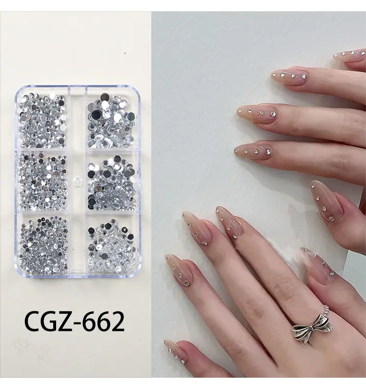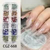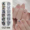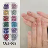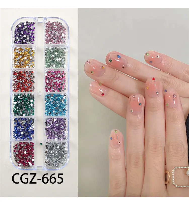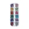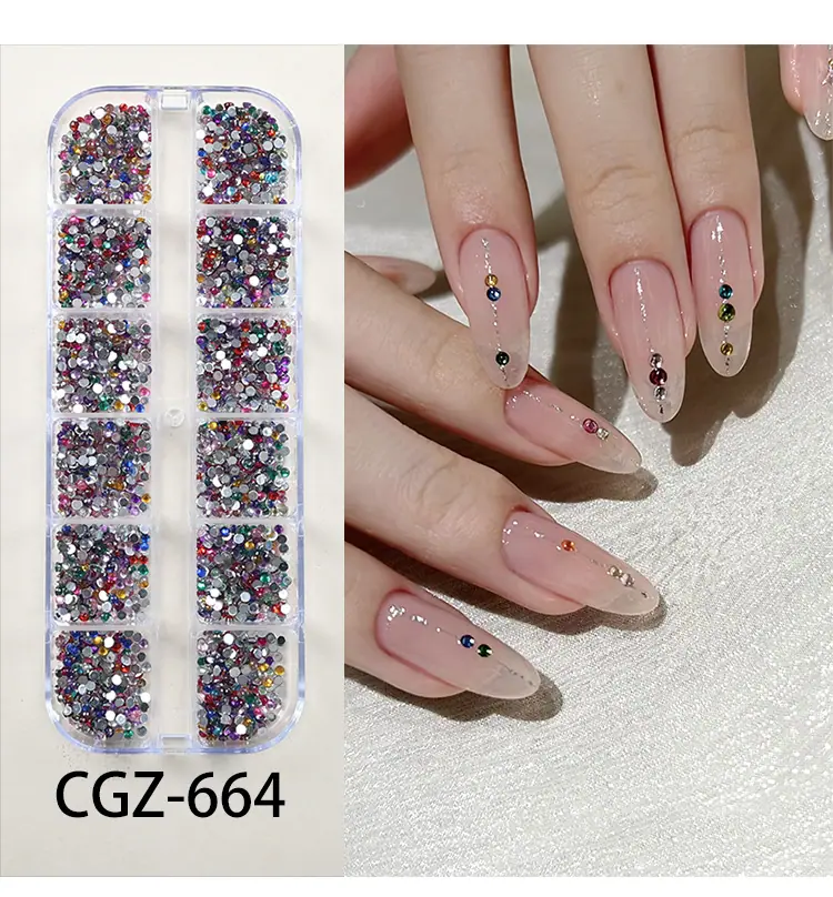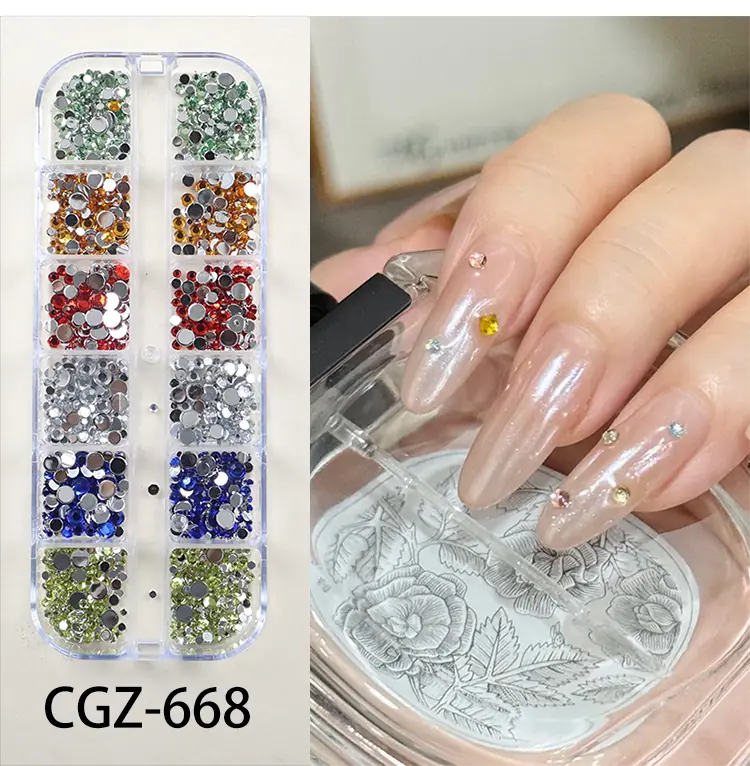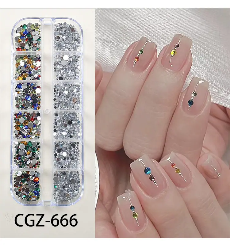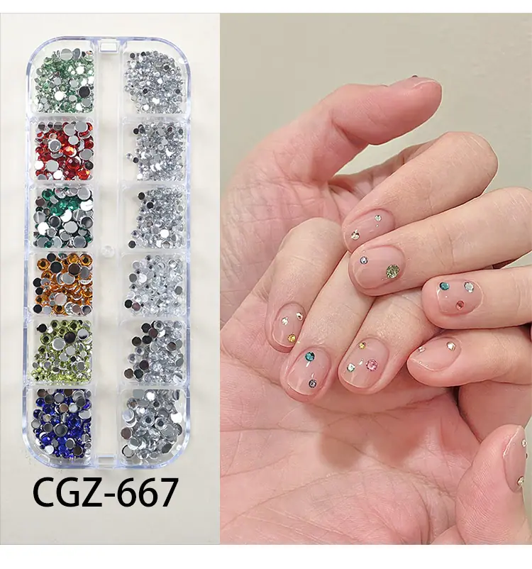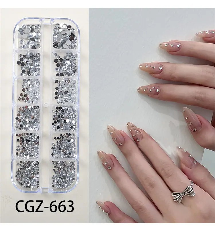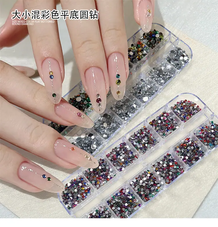2025 Transfronterizo Caja de 12 Cuadrículas Joyería para Arte de Uñas Tamaños y Colores Mixtos Super Flash Fondo Plano Diamante Redondo Pegatinas para Uñas Joyería de Diamantes
