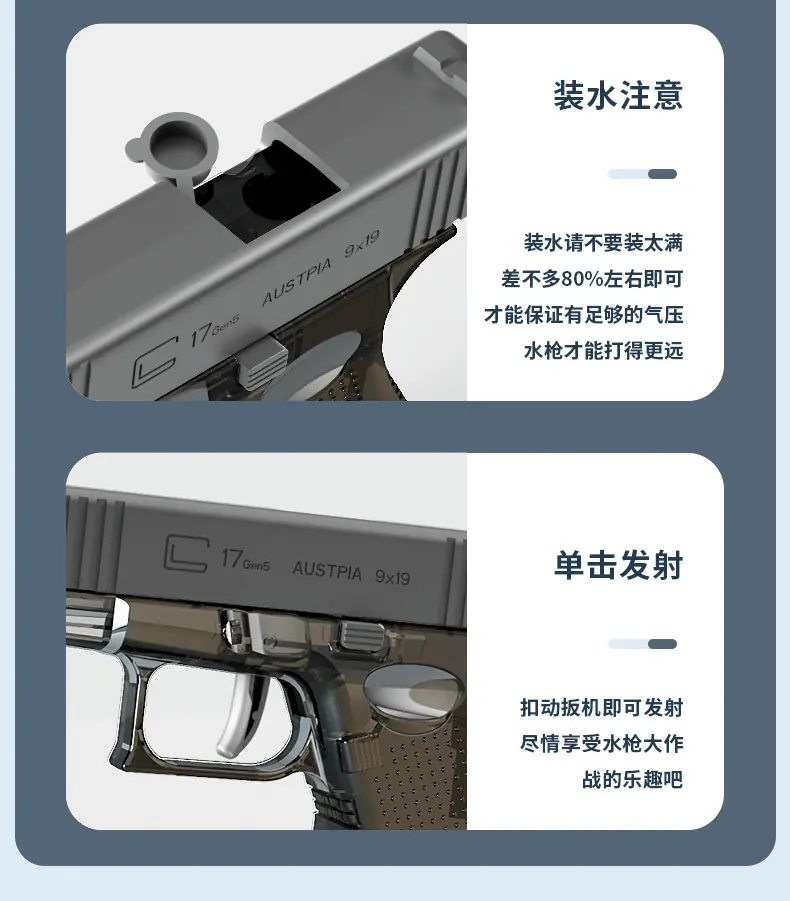 | Pistola de agua de doble cara, mirando hacia atrás | 150 ml | Blanco, azul, rosa | Bolsa de polipropileno | 16x3.8x14 | 26x15 | 300 | 70*41*62 |