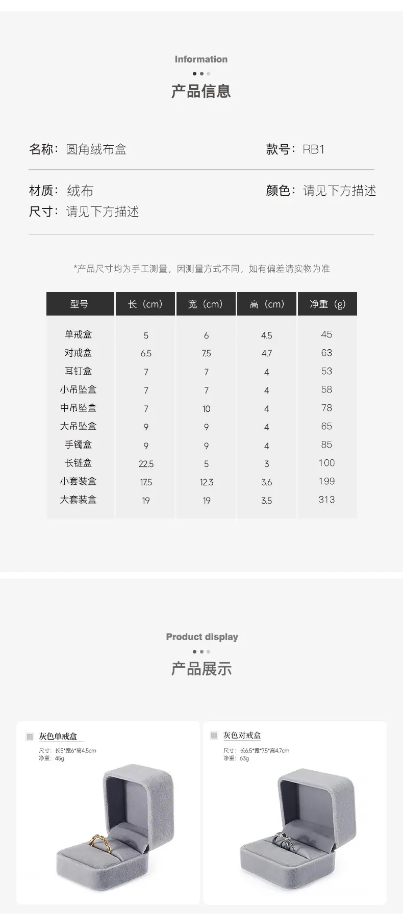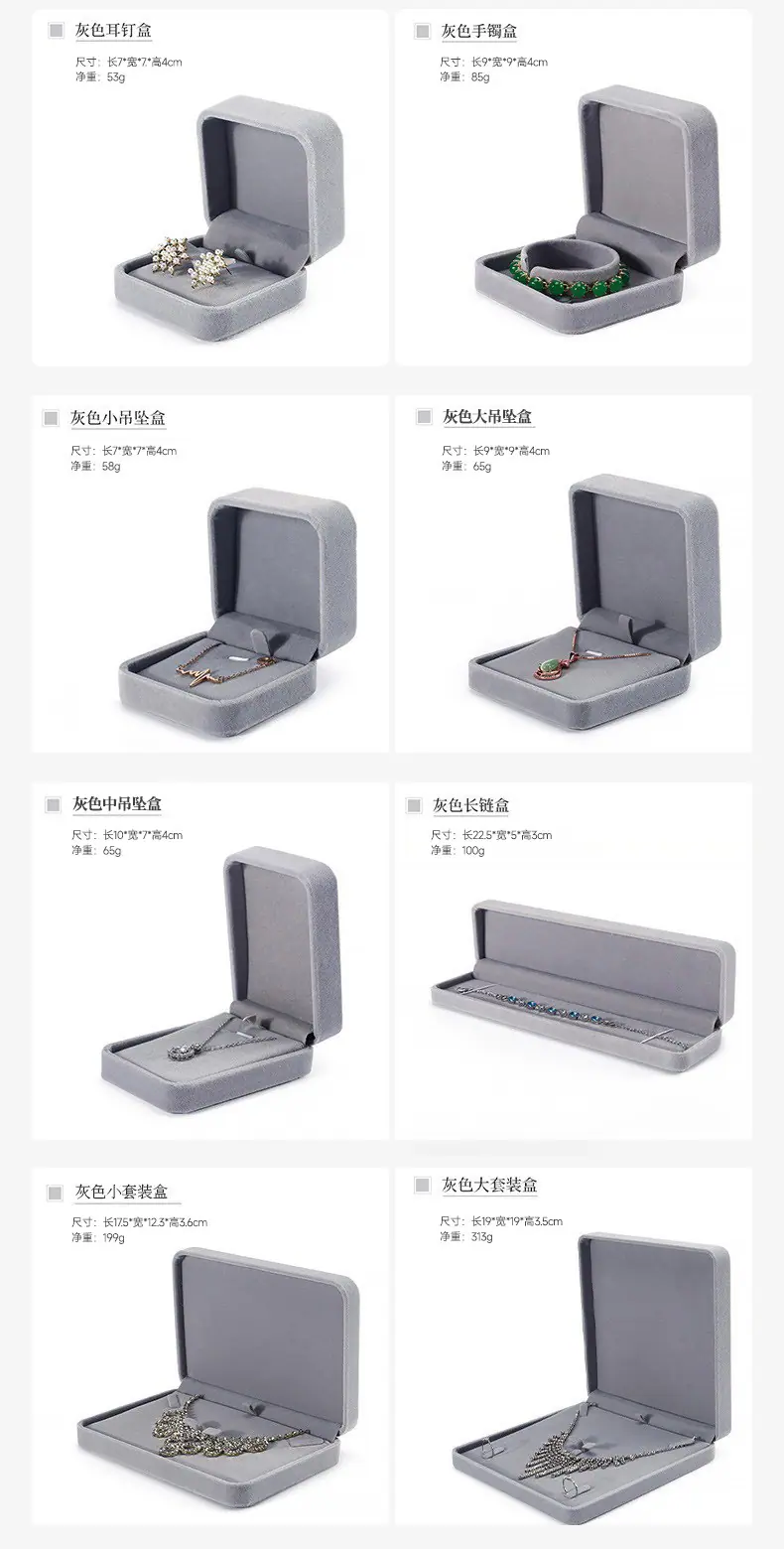 Gray; single ring box 5*6*4.5cm, Gray; ring box 6.5*7.5*4.7cm, Gray; small pendant box 7*7*4cm, Gray; medium p...