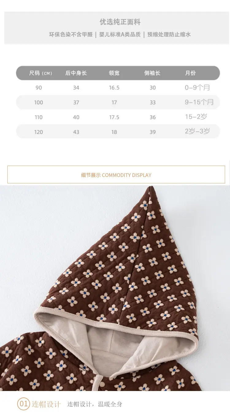 Esta capa es corta, por lo que se recomienda llevar una talla más grande en lugar de una más pequeña. Tenga en cuenta que la talla de la capa es diferente a la talla de la ropa. Si compra usted mismo, consulte la longitud central de la espalda de la tabla de tallas y compárela con la altura del bebé para elegir la talla adecuada.