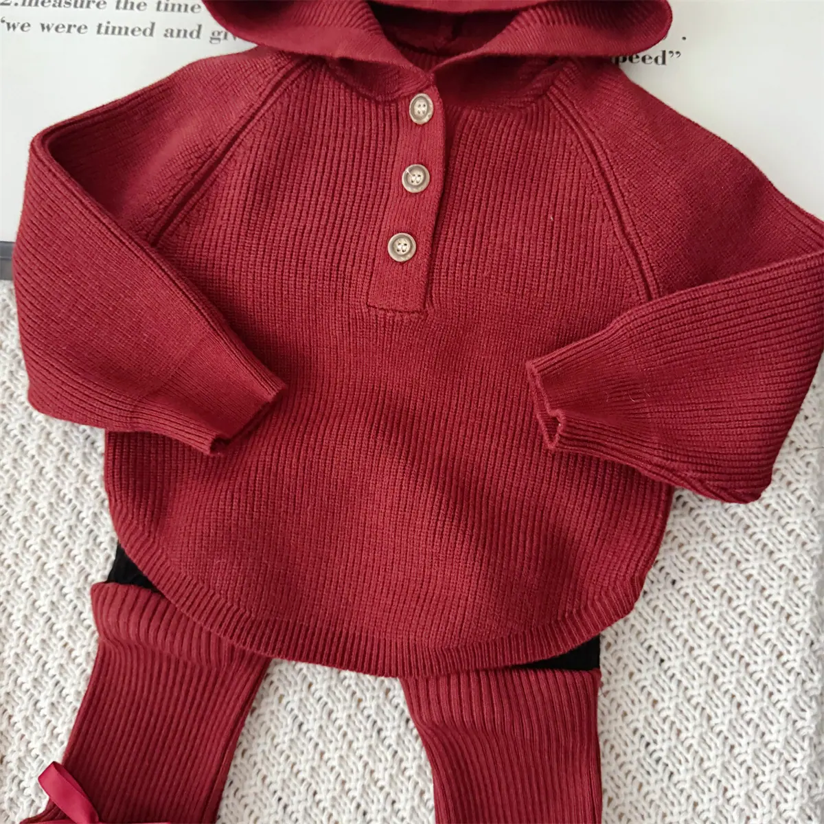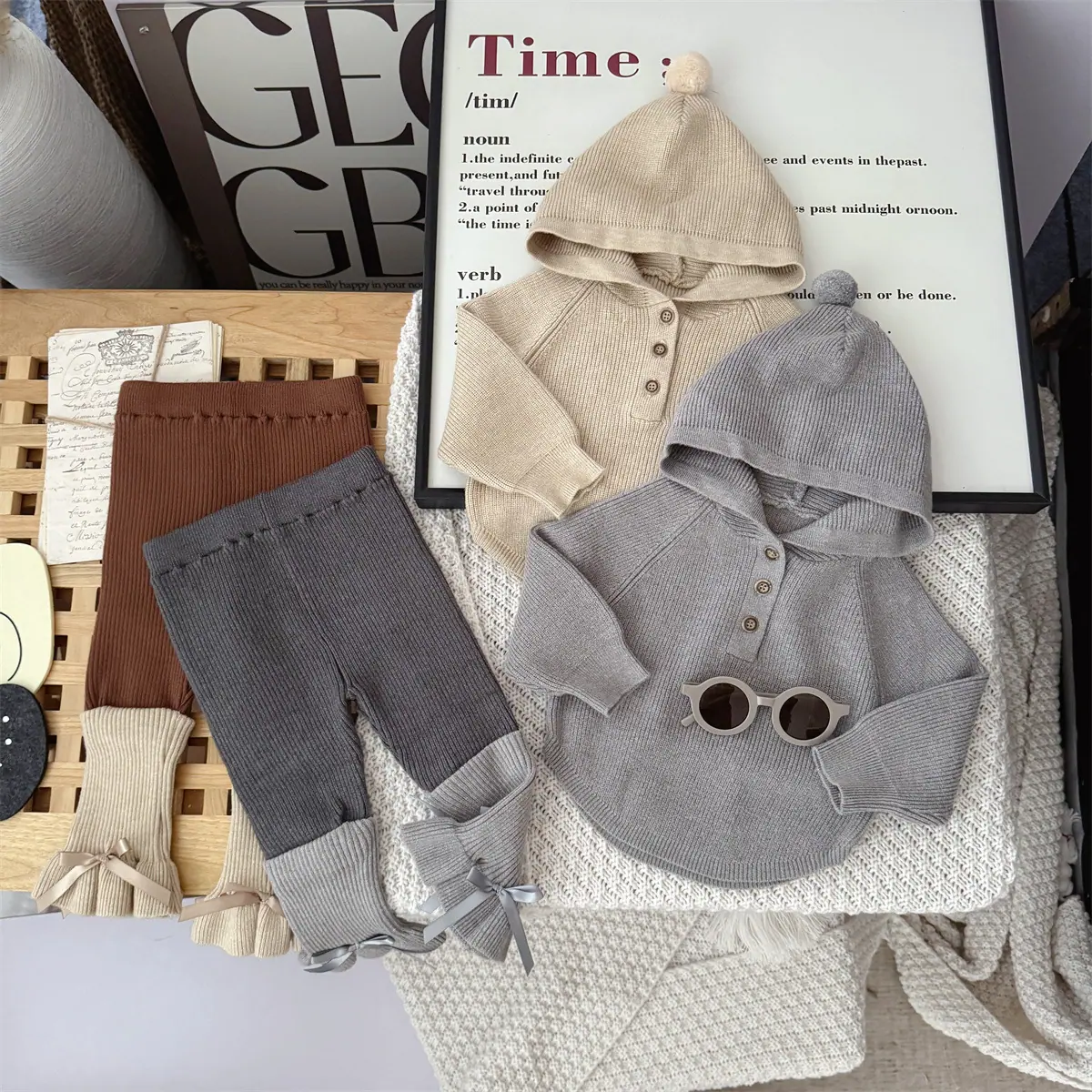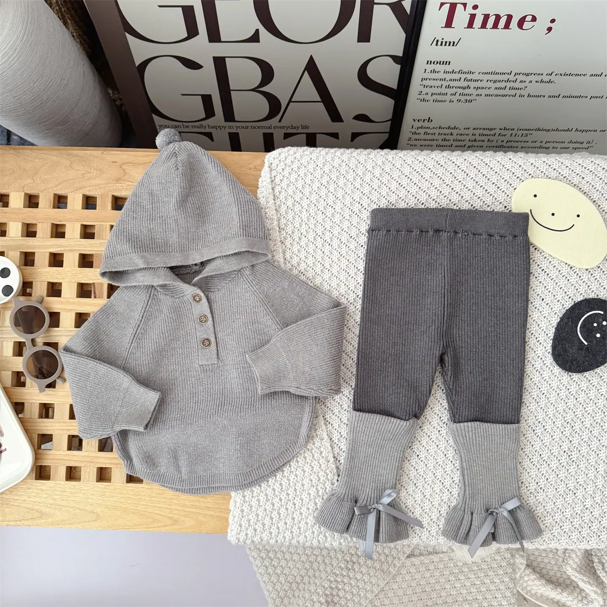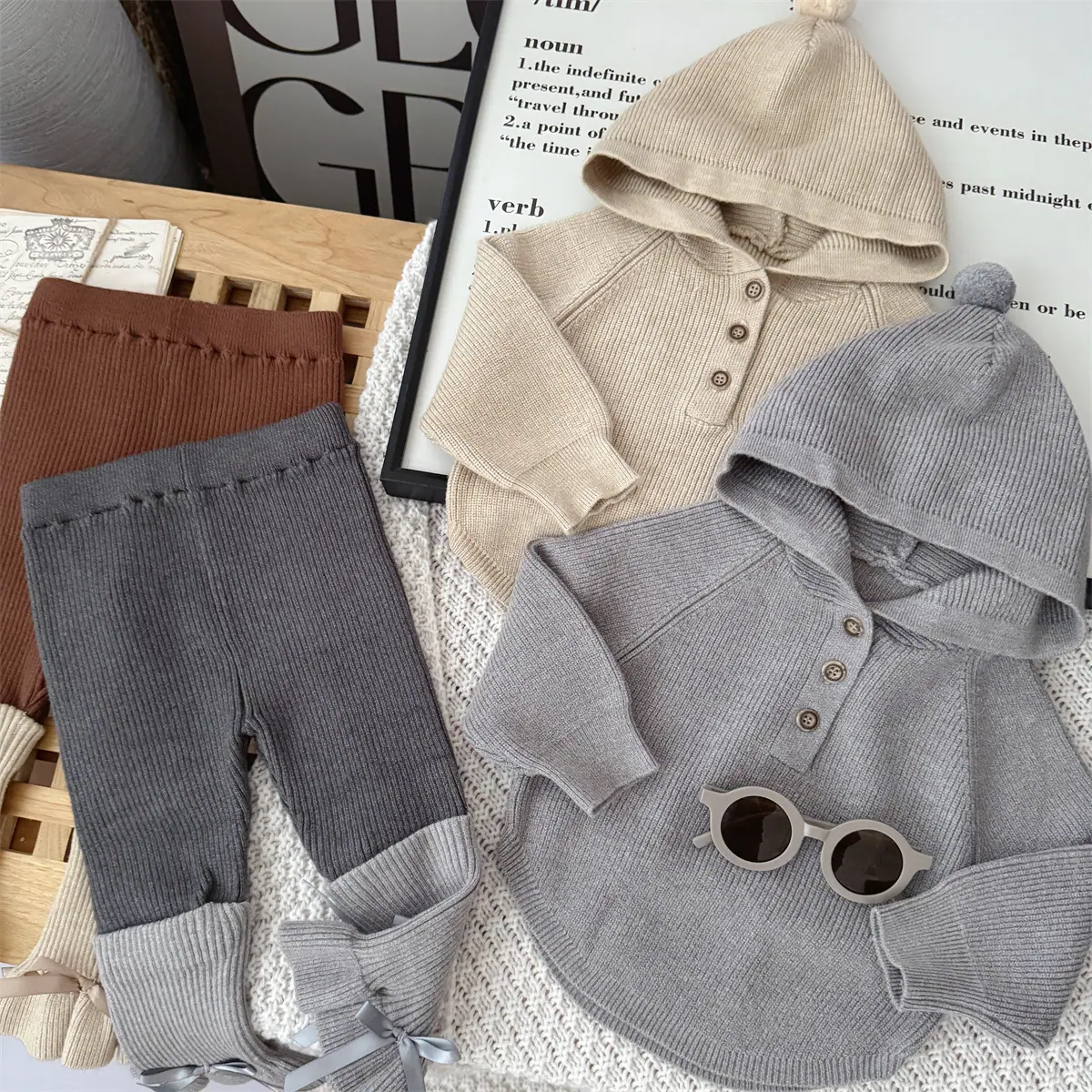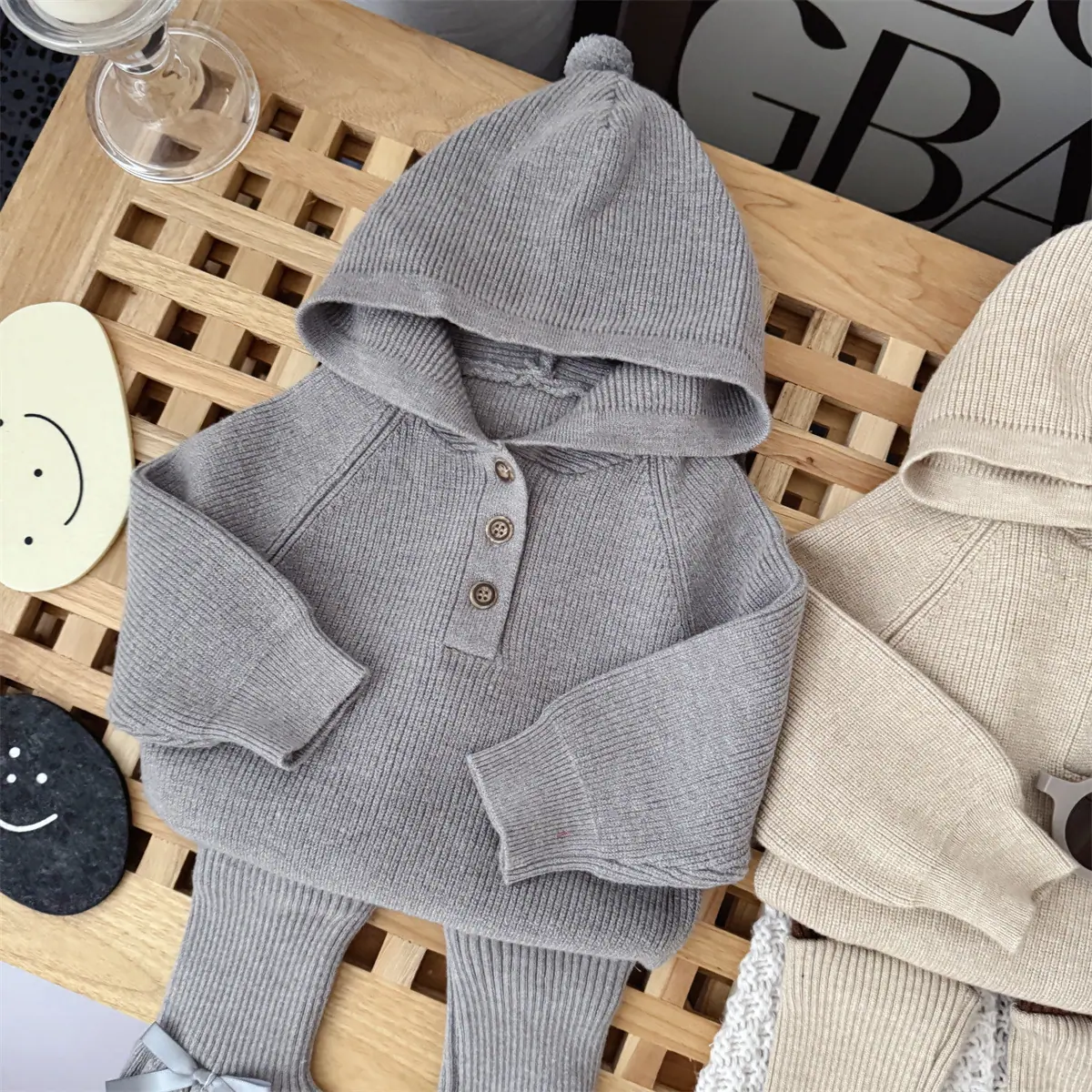Conjunto de dos piezas de suéter de lana tejida para niñas a la moda estilo coreano, otoño e invierno, gorro puntiagudo, albaricoque, top moderno + conjunto de pantalones