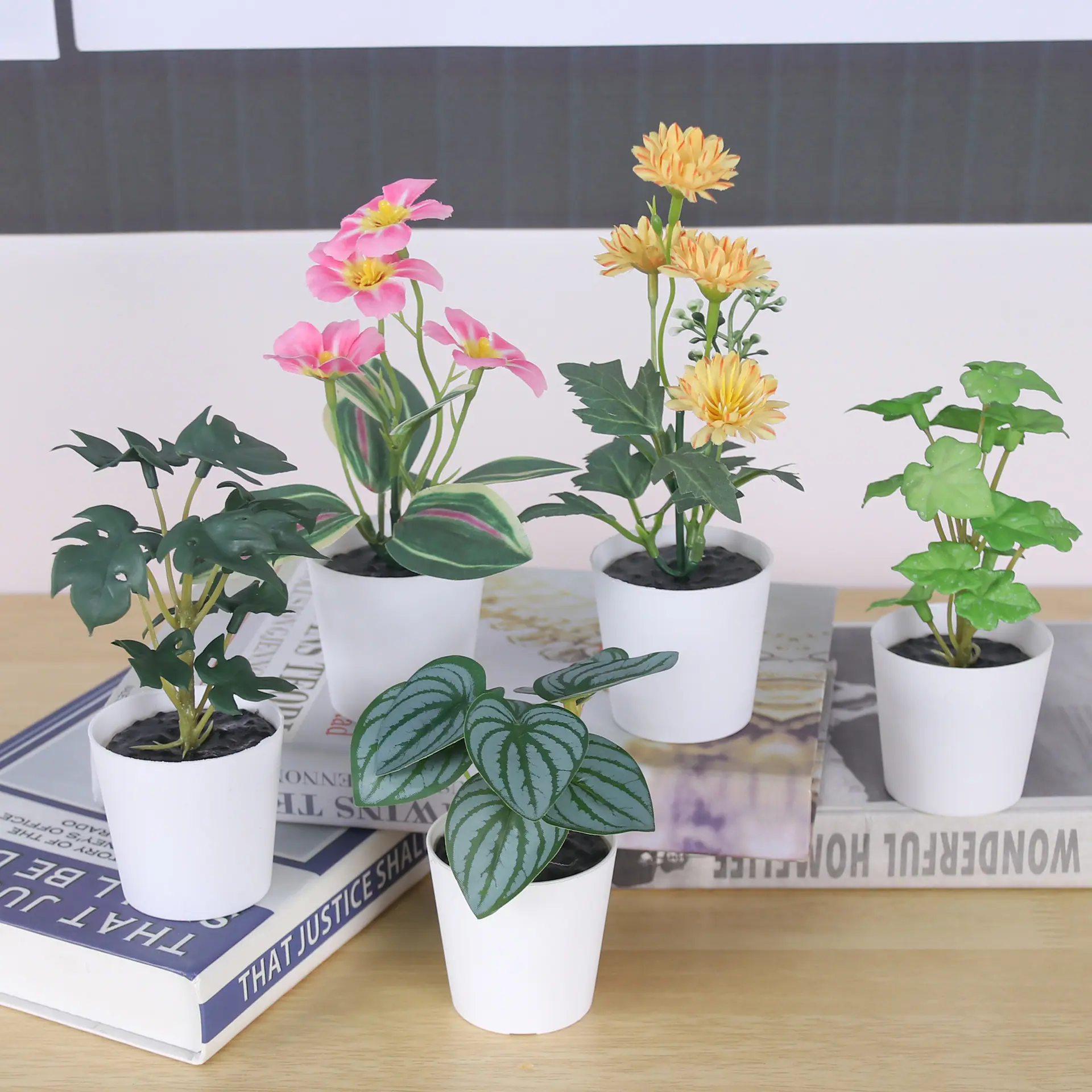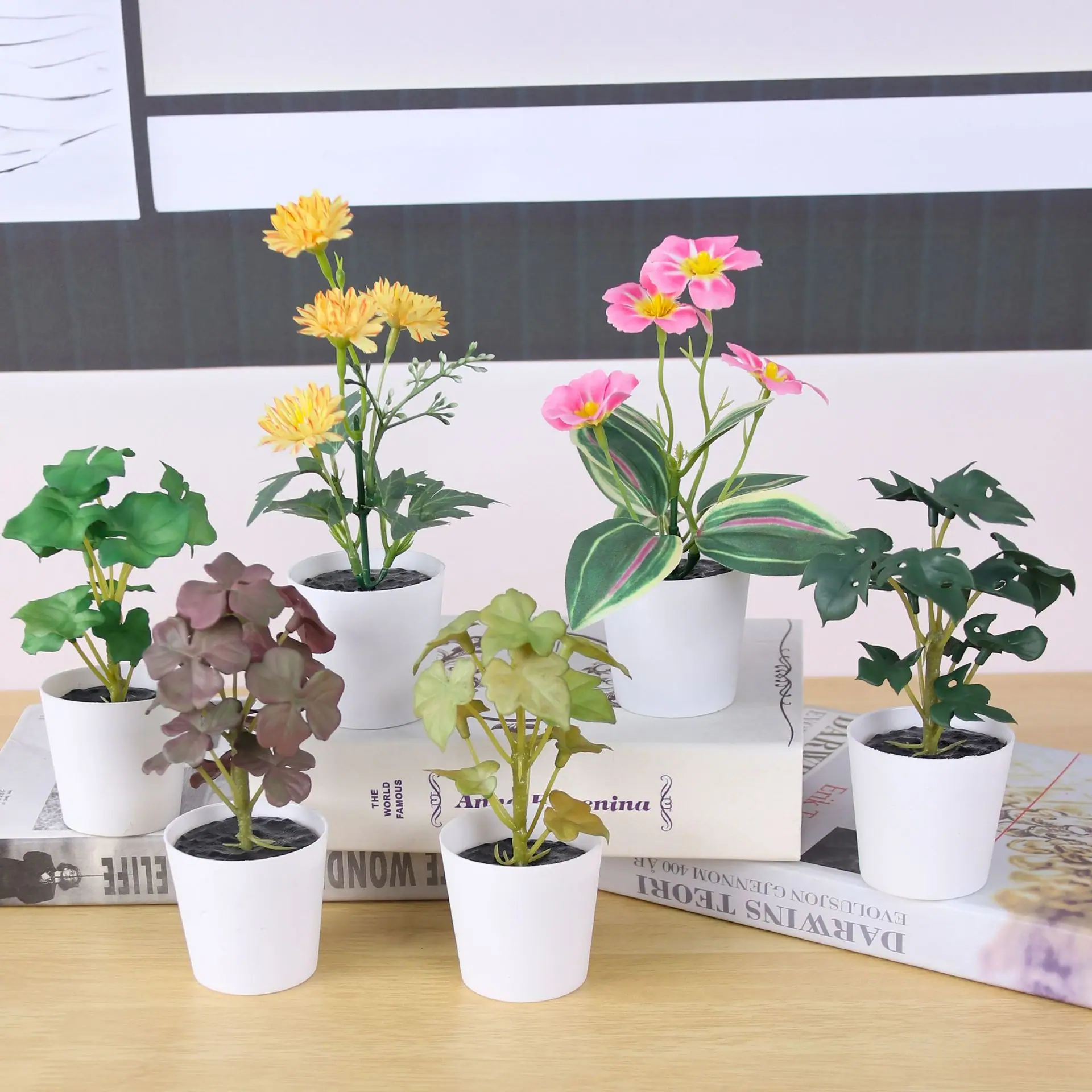 Mini planta artificial en maceta de plástico transfronteriza, combinación de regalo de escritorio, hierba de moneda de cobre de PU, planta verde, crisantemo silvestre, flor falsa, simulación de bonsái