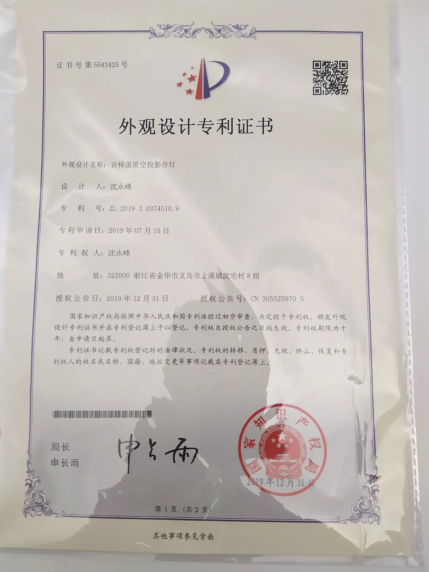 Certificado de Patente de Apariencia de Producto Adjunto