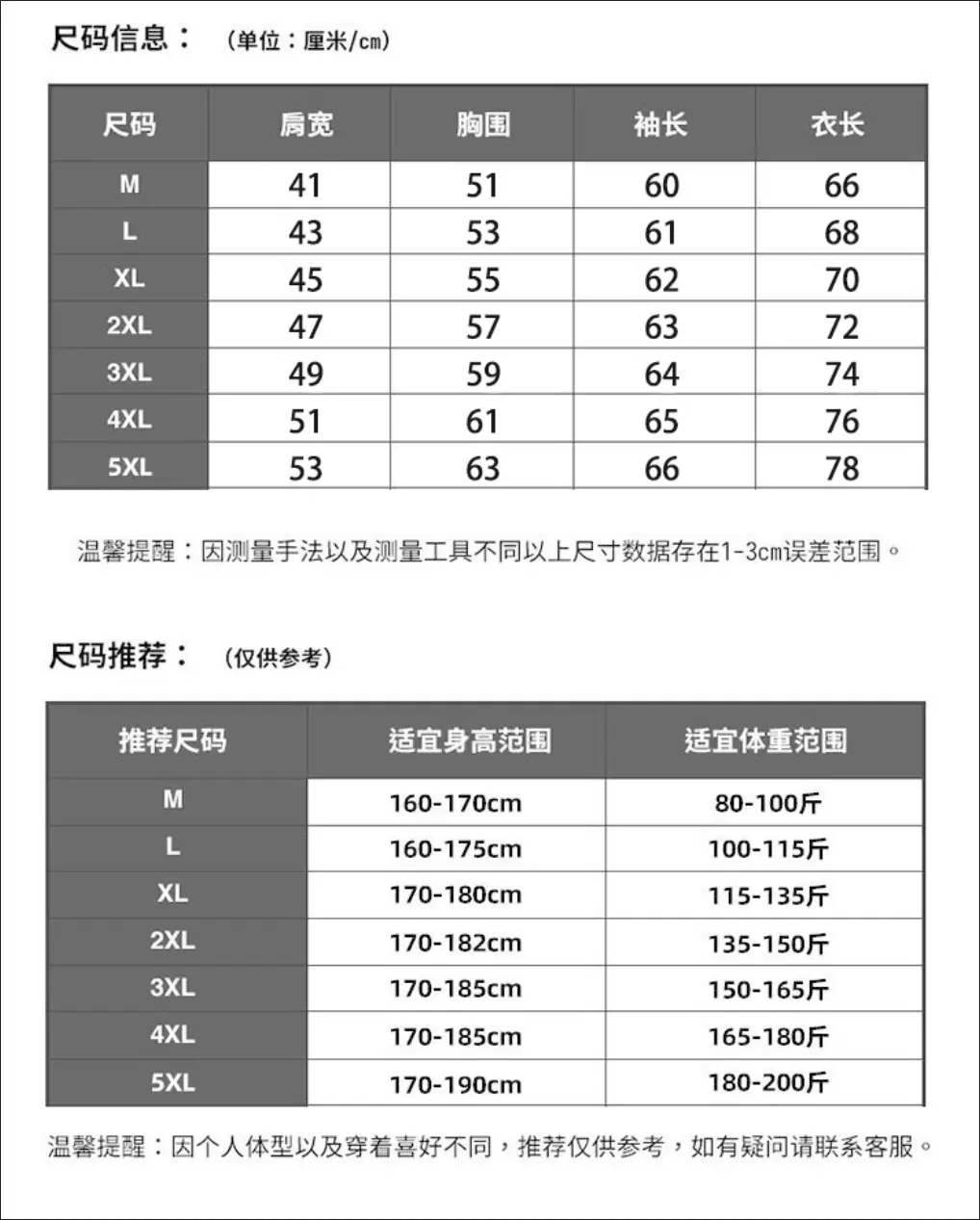 M Recommended weight: 80-100 catties, L Recommended weight: 100-115 catties, XL: 115-130 catties, 2XL recommen...