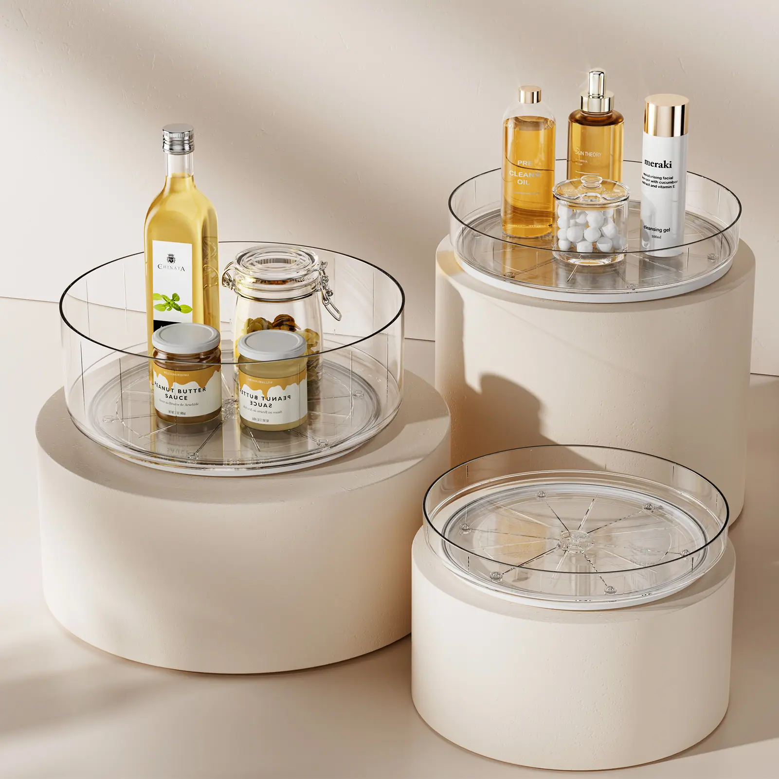 Este es un organizador giratorio de almacenamiento hecho de material PET 100%. Puede girar 360 grados, lo que lo hace conveniente para acceder a los artículos en la caja de almacenamiento.. La parte inferior tiene rayas texturizadas. Cuando se gira bajo la luz, crea un juego dinámico de luces y sombras, haciéndolo tanto hermoso como práctico.. El tamaño de un solo producto es 23X3.5 cm y pesa 340 gramos. Este producto posee patentes de producto de China, Estados Unidos y la Unión Europea.