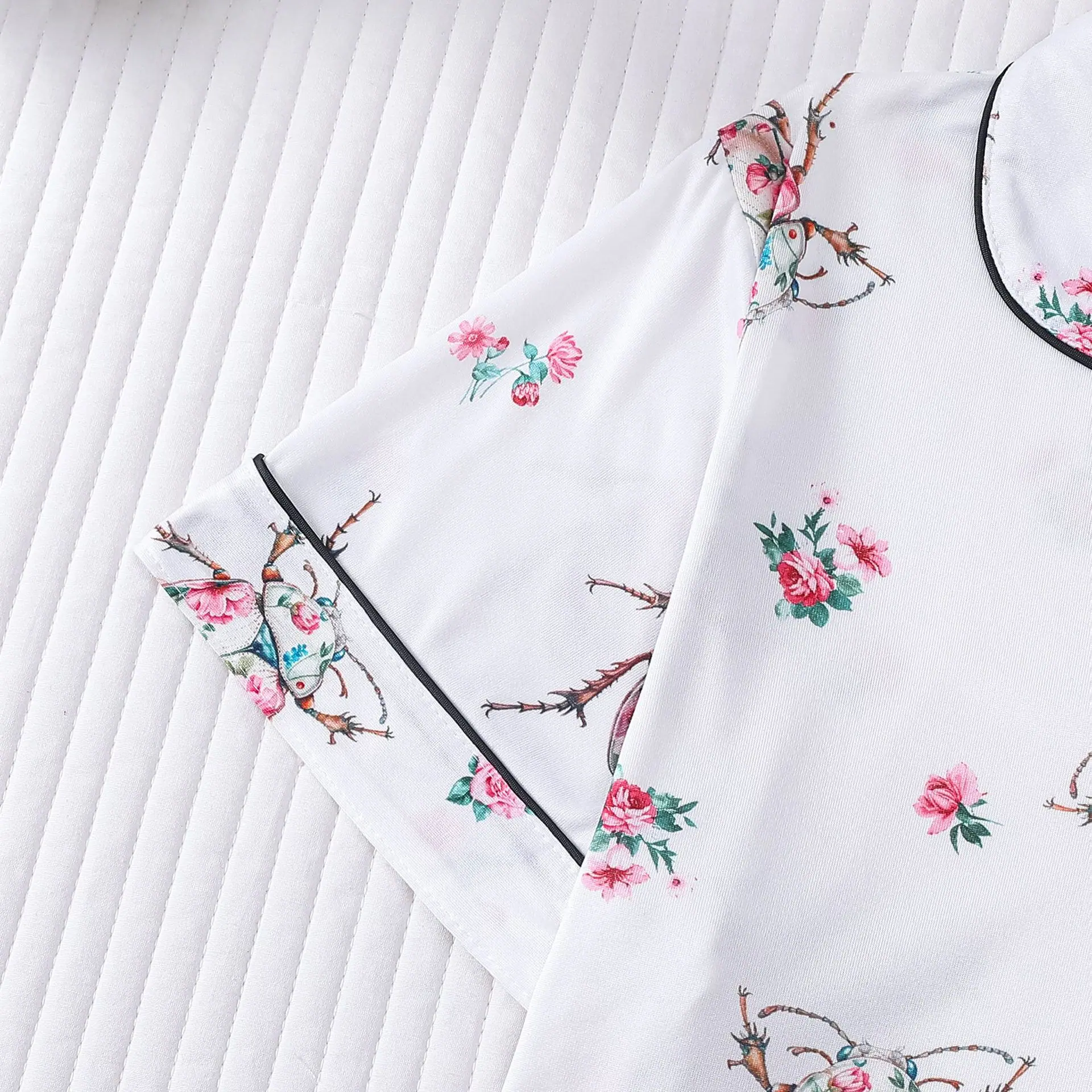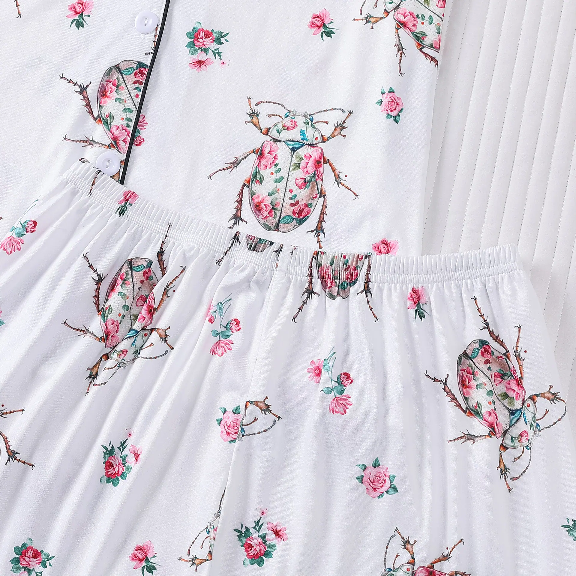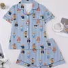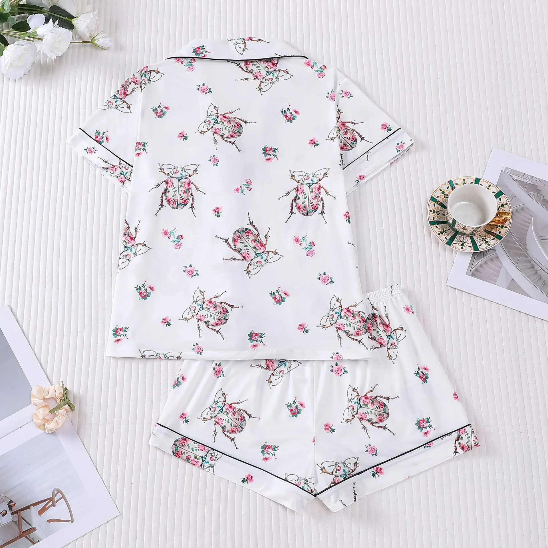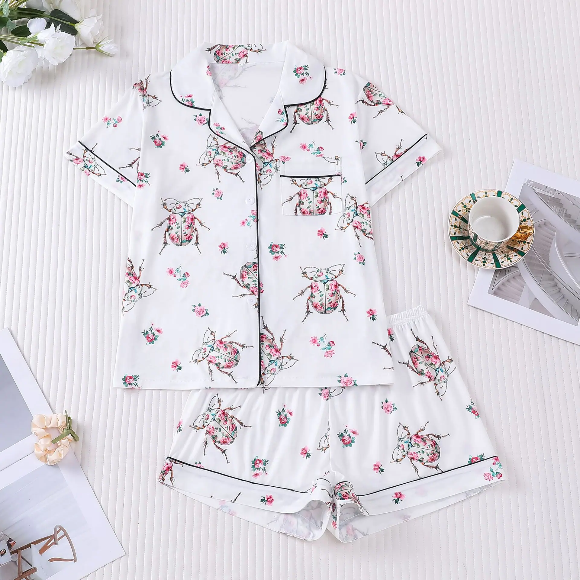 Pijama Nuevo para Mujer Estampado Cuello Mao Manga Corta Shorts Ropa de Casa Europea y Americana Cárdigan Suelto Cómodo