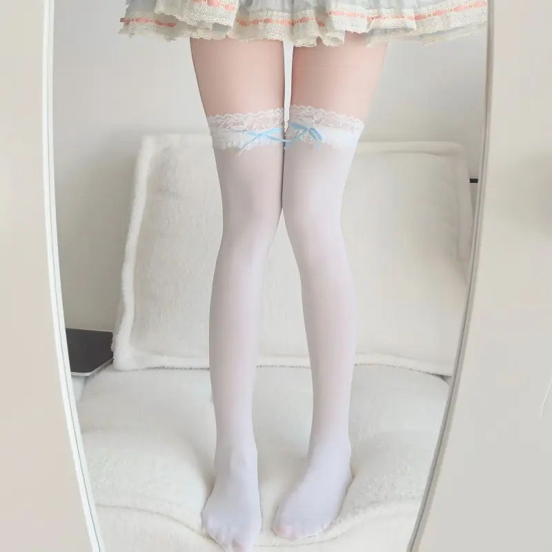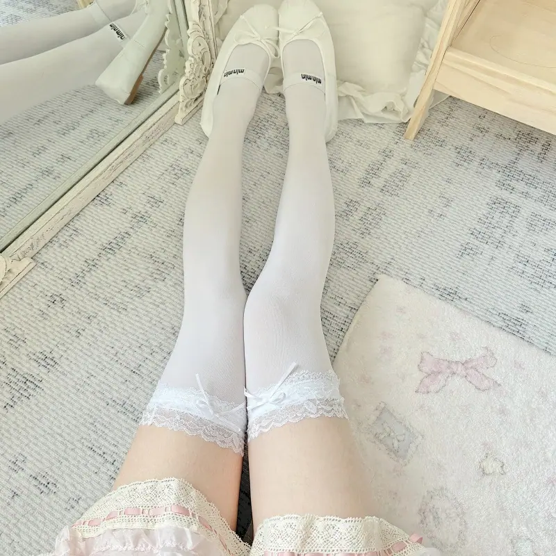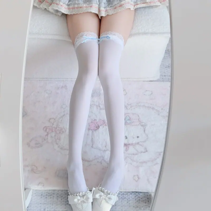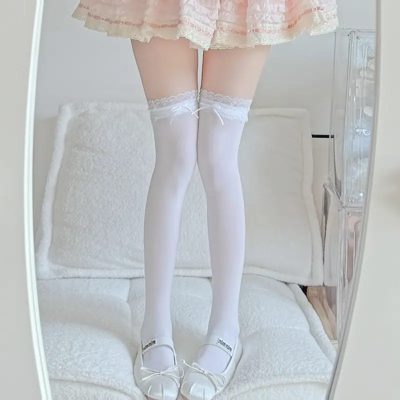 Jk calcetines altos hasta el muslo de encaje japonés con lazo, calcetines blancos versátiles de encaje para chica dulce lolita