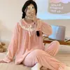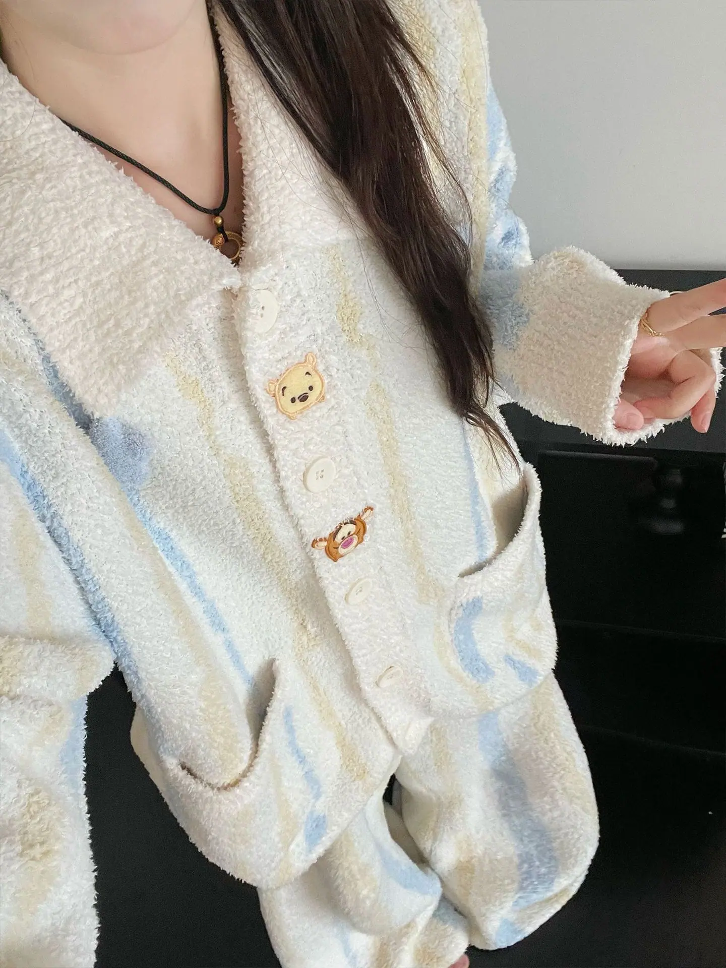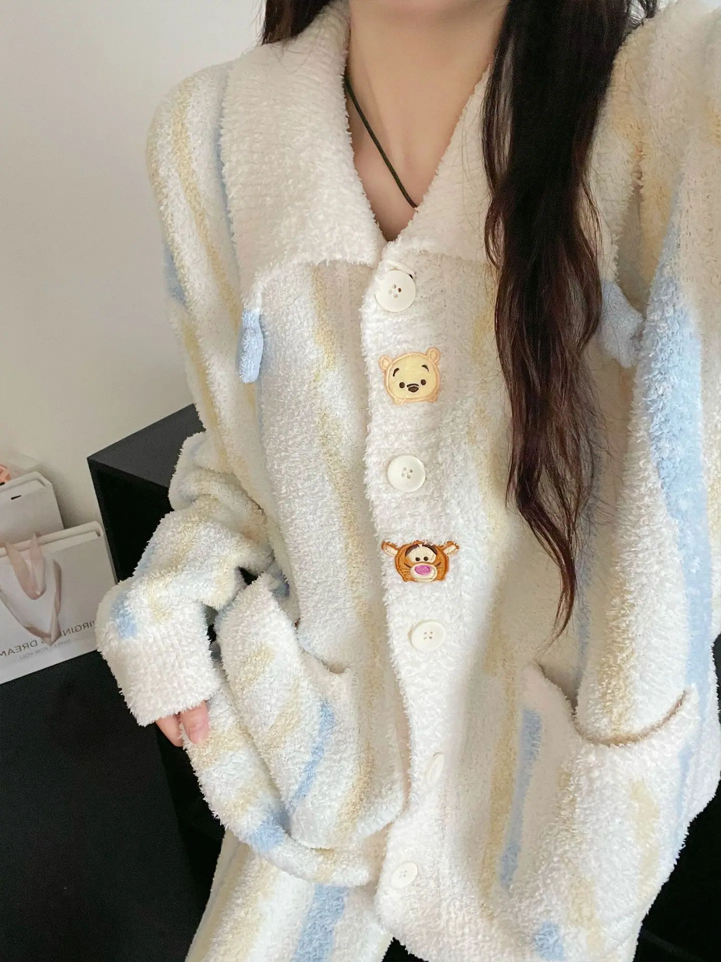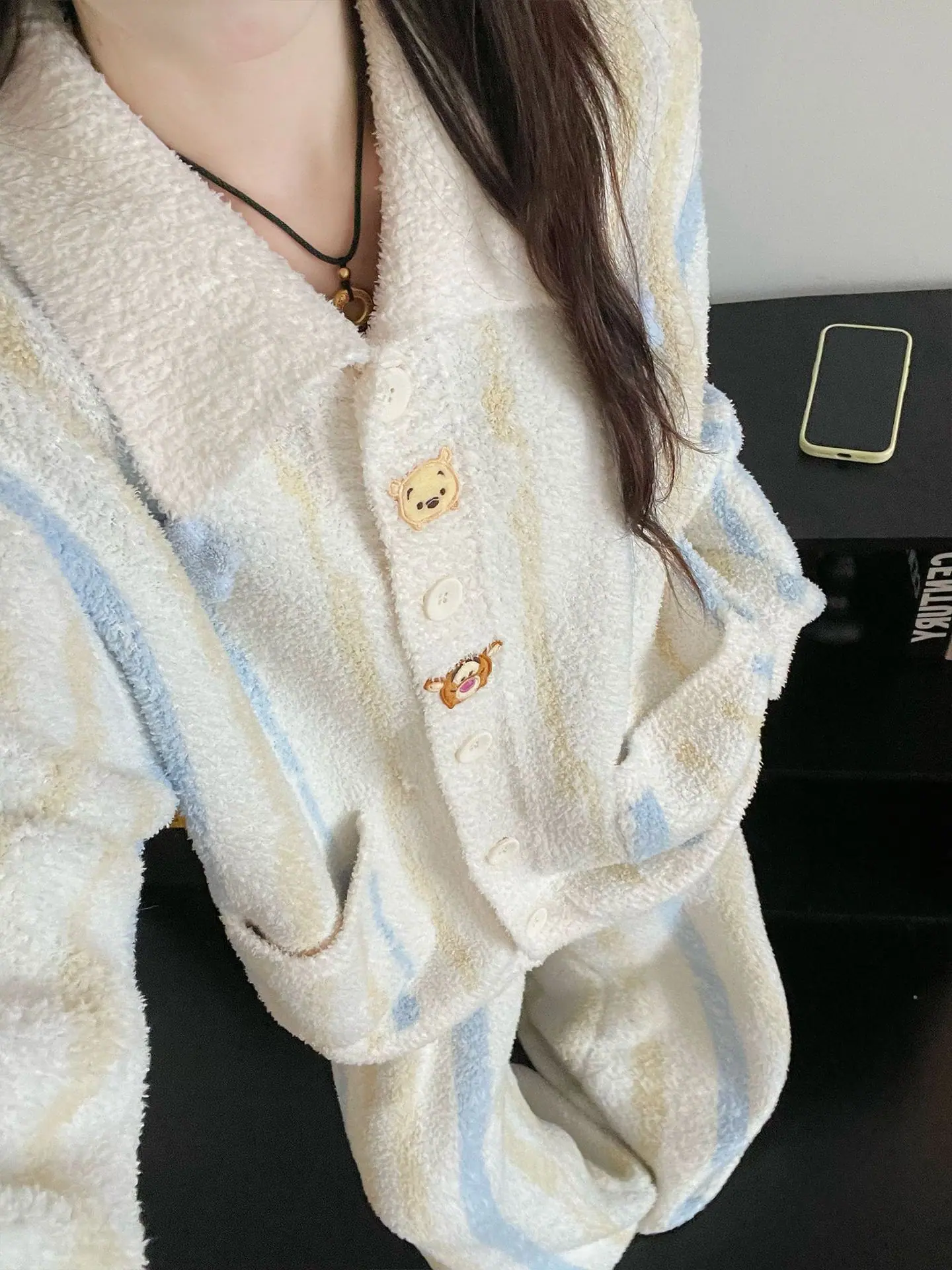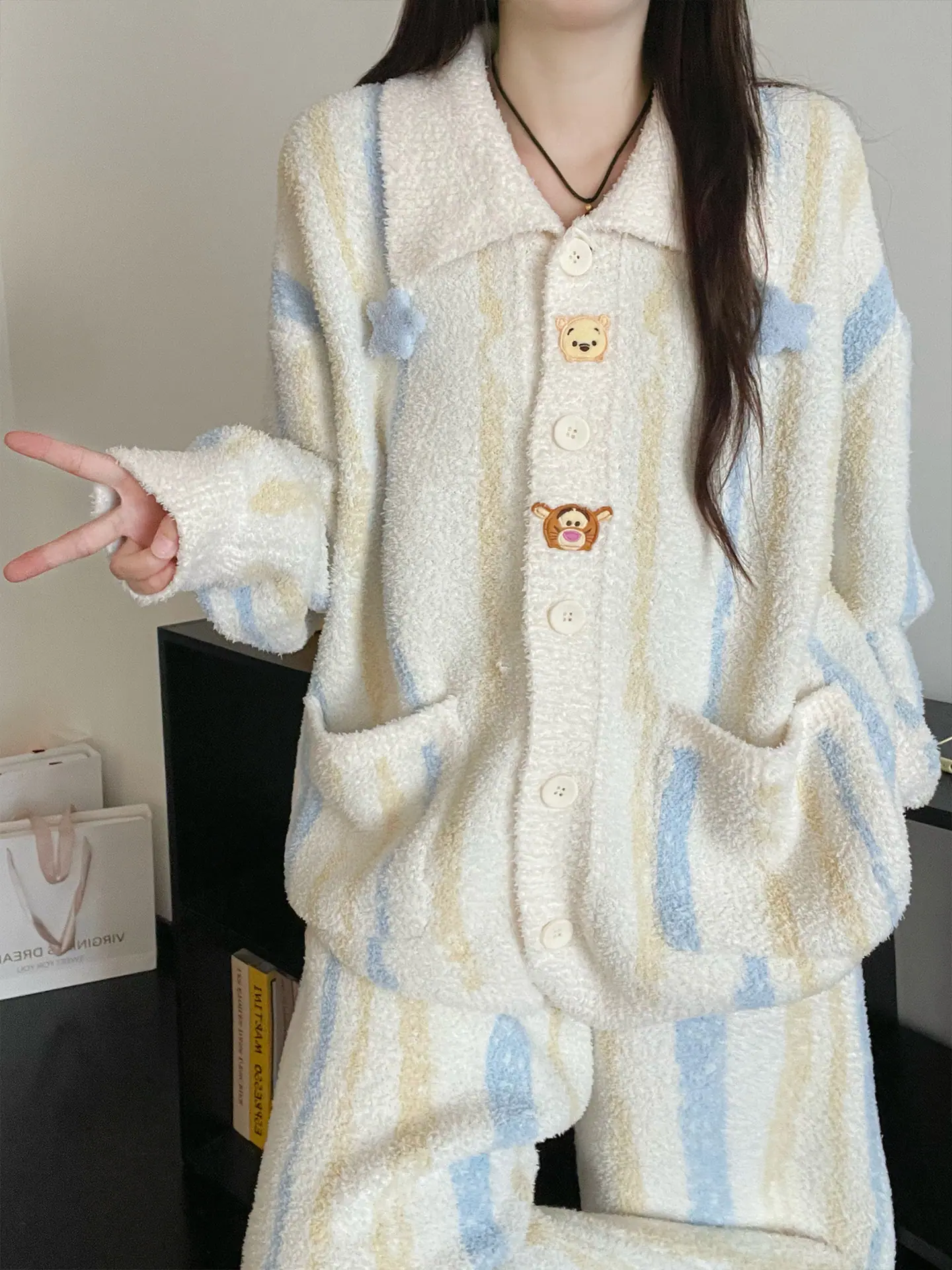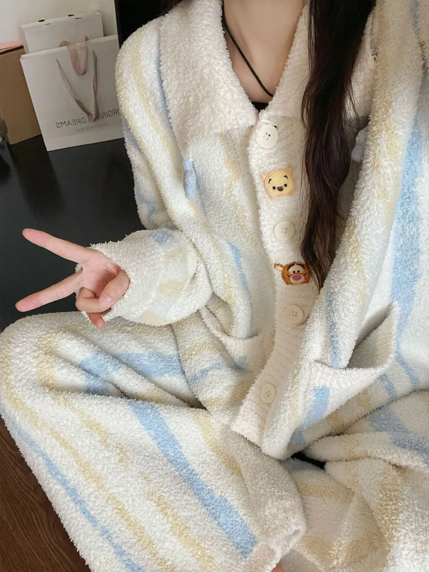 Pijama de Media Felpa con Estampado de Oso Lindo Estilo Coreano para Mujer Invierno Nuevo Estilo para Mujer Talla Grande Grueso Cálido Conjunto para Estar en Casa