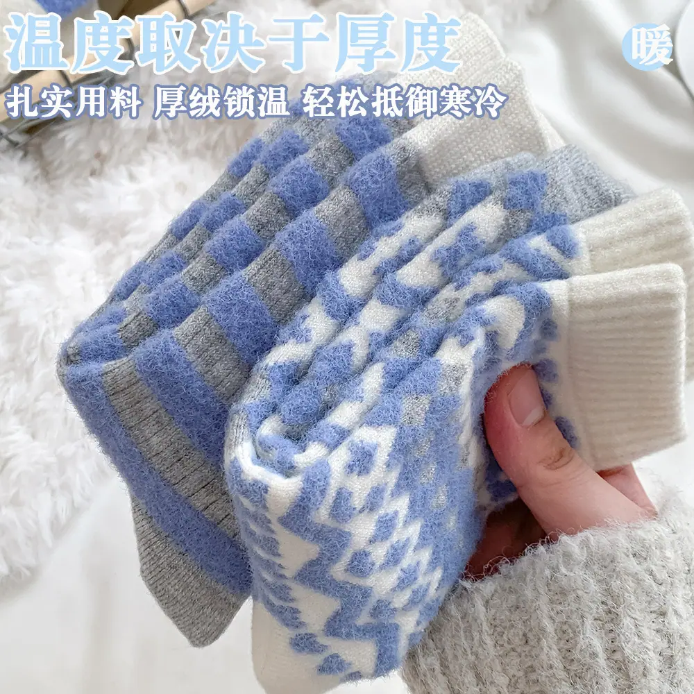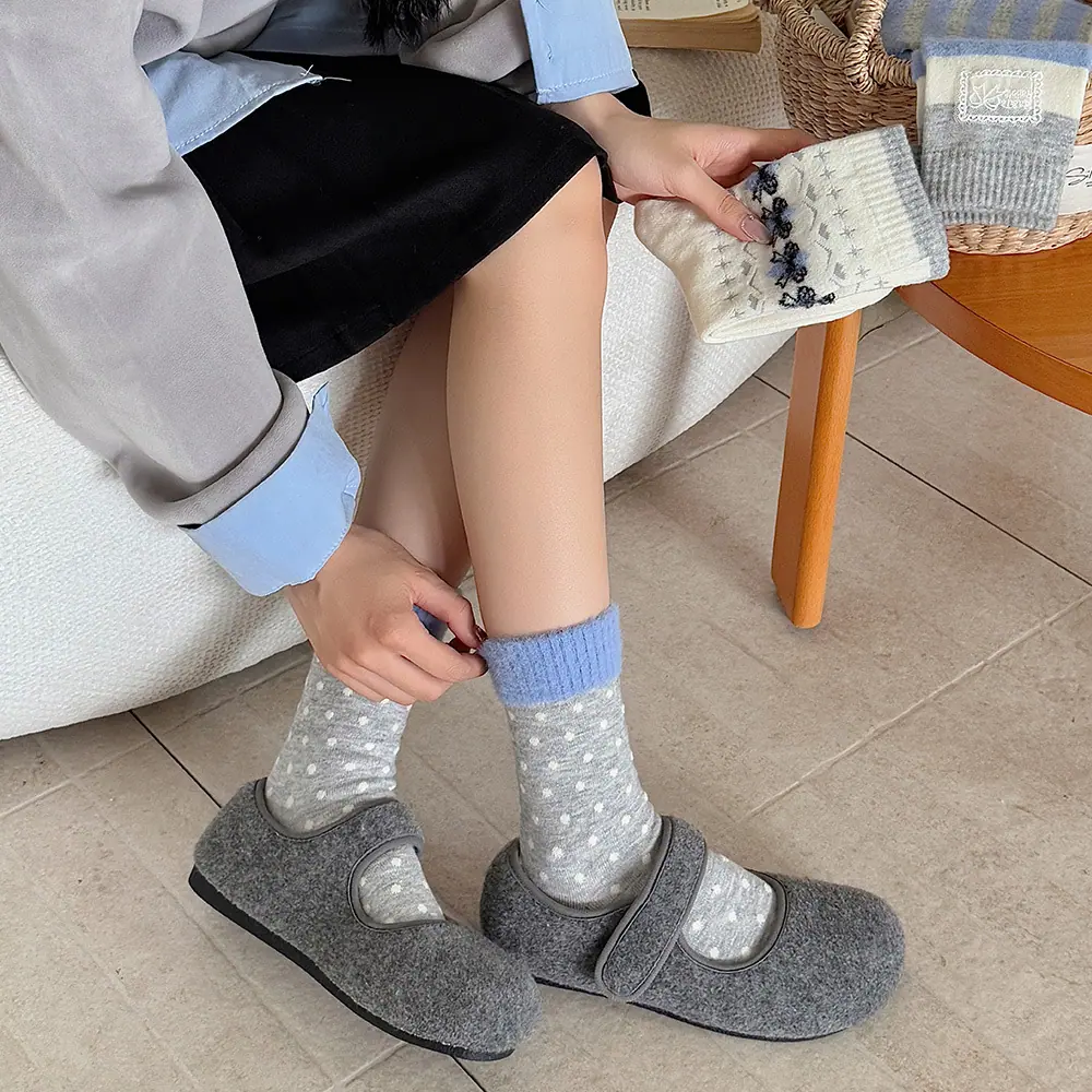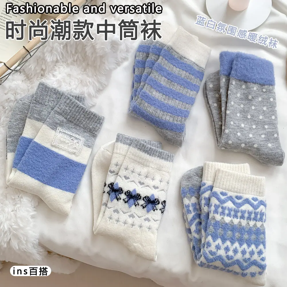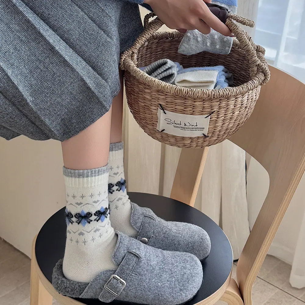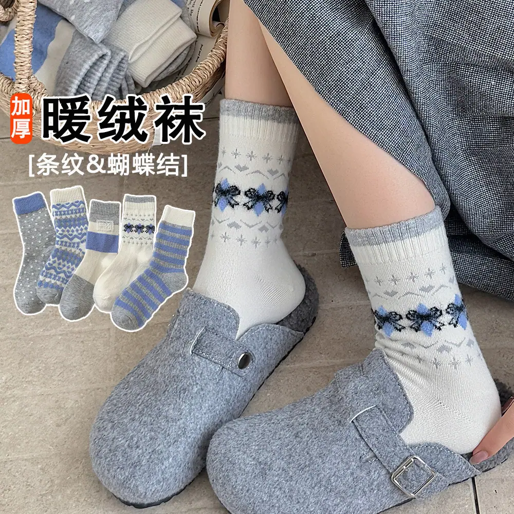 Calcetines gruesos de otoño e invierno para mujer, calcetines cálidos de forro polar, calcetines cálidos y delicados hasta la mitad de la pantorrilla, calcetines Fair Isle a rayas con lazo, calcetines versátiles holgados