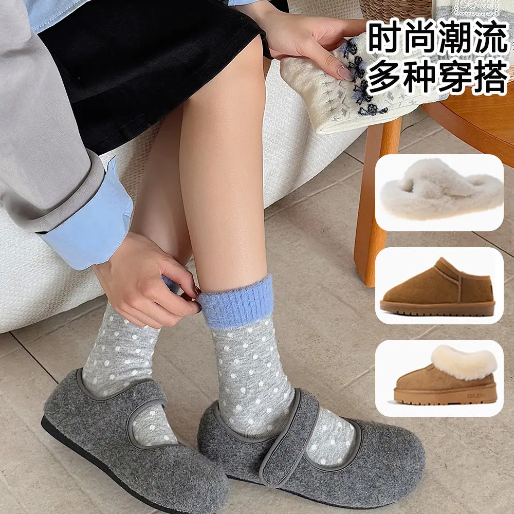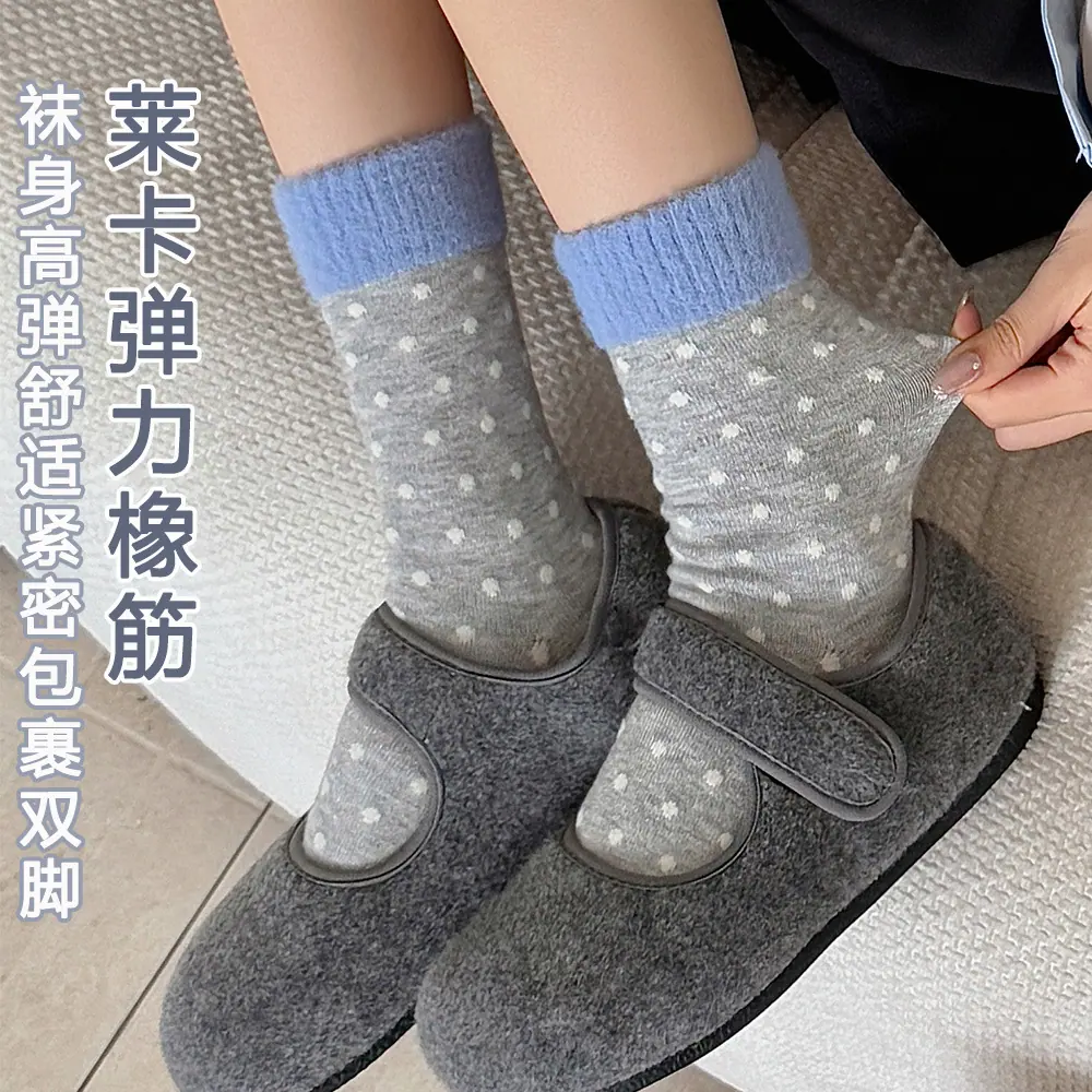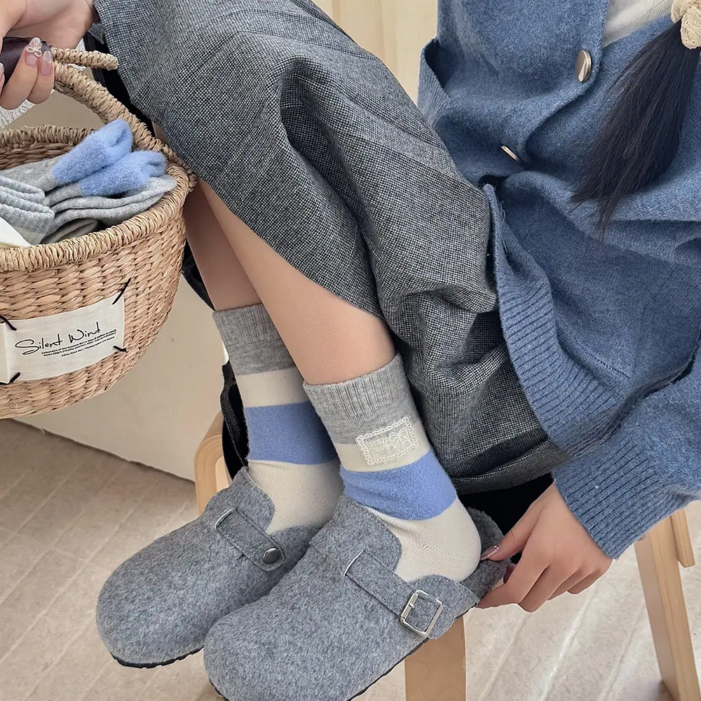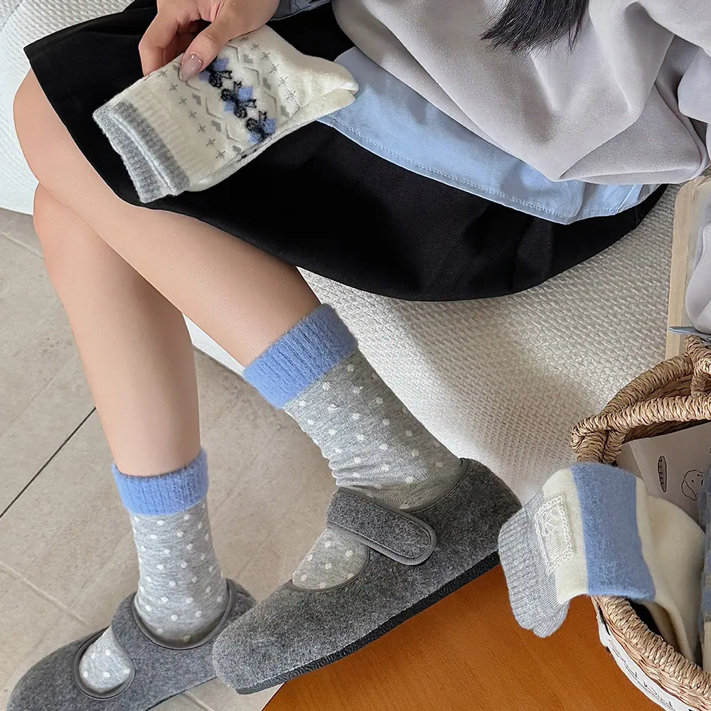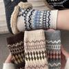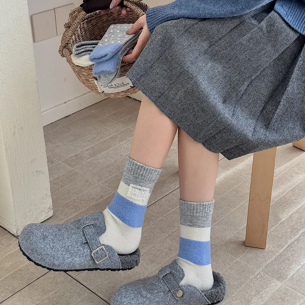 Calcetines gruesos de otoño e invierno para mujer, calcetines cálidos de forro polar, calcetines cálidos y delicados hasta la mitad de la pantorrilla, calcetines Fair Isle a rayas con lazo, calcetines versátiles holgados