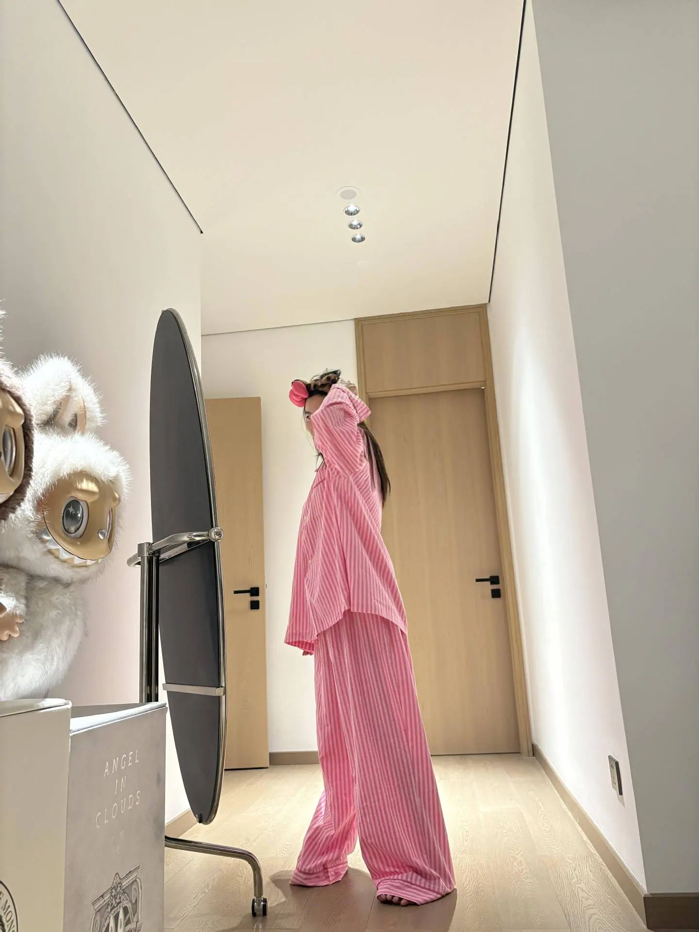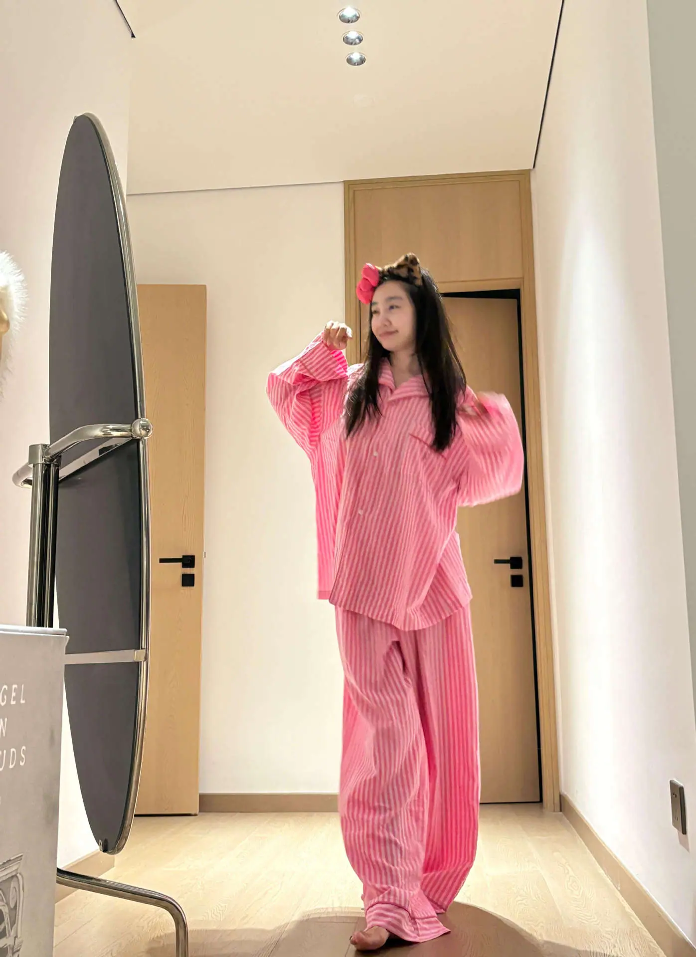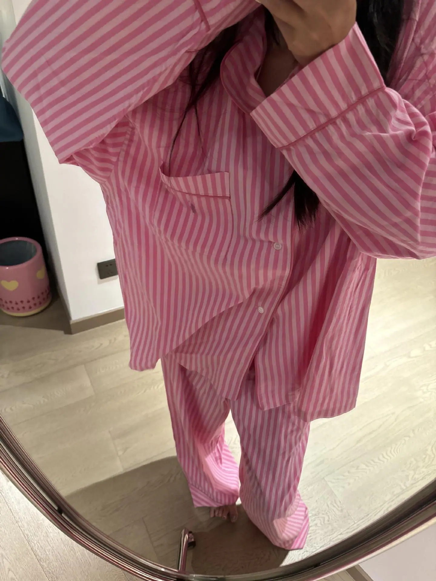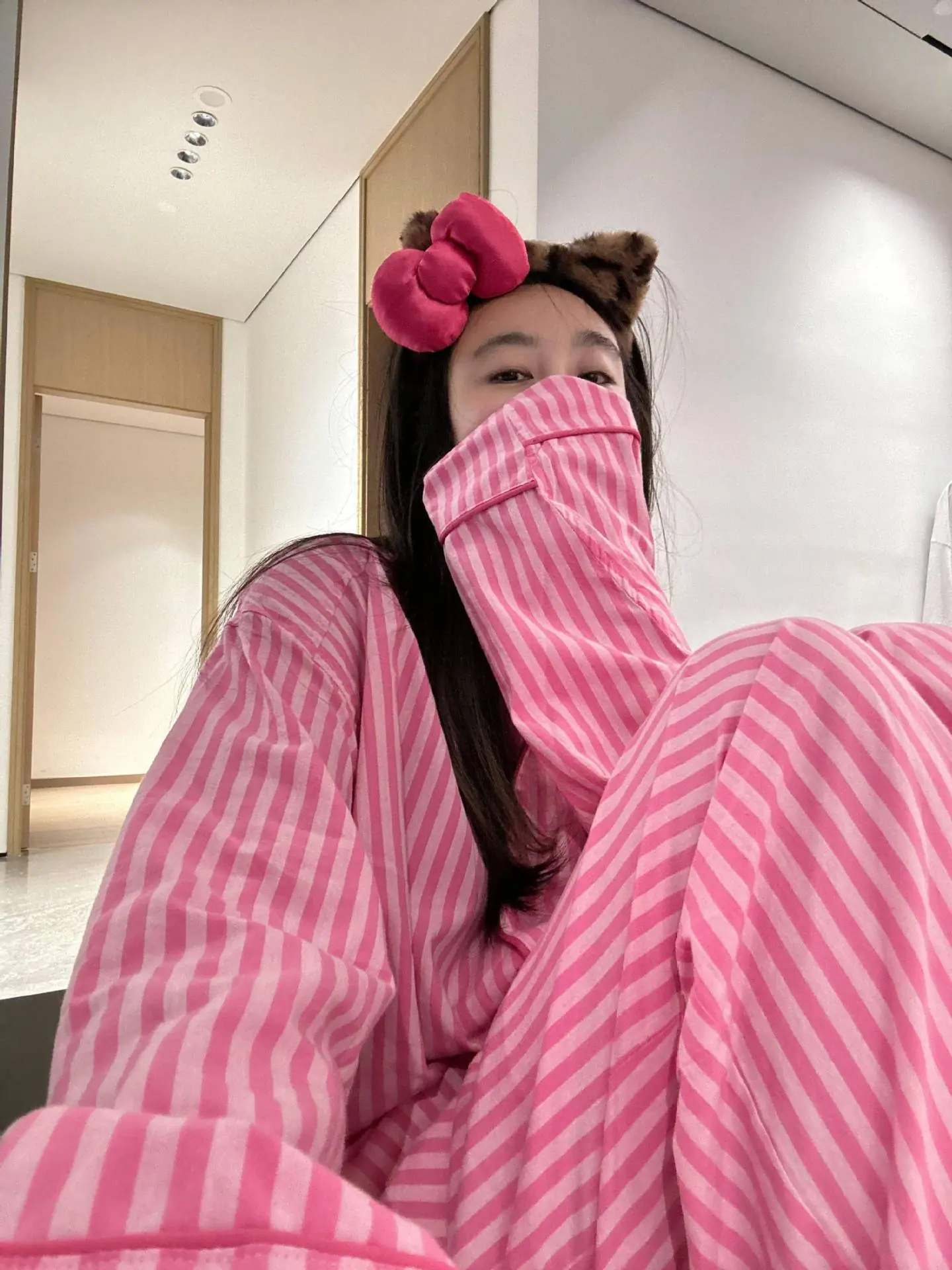 Pijama dulce y holgado de bloques de color a rayas para mujer, nuevo de otoño, casual, de manga larga y pantalón largo, conjunto para estar en casa que se puede usar en el exterior