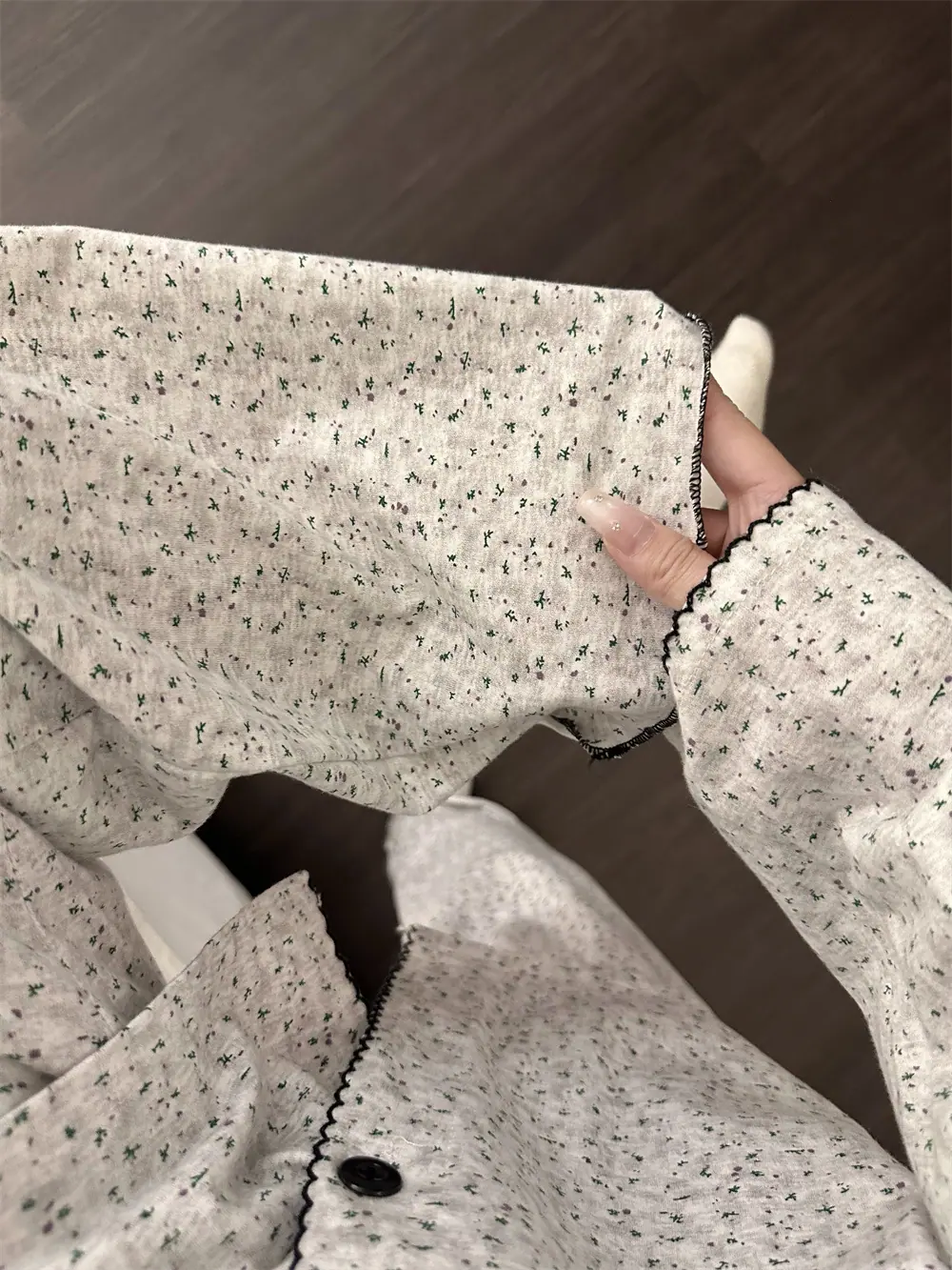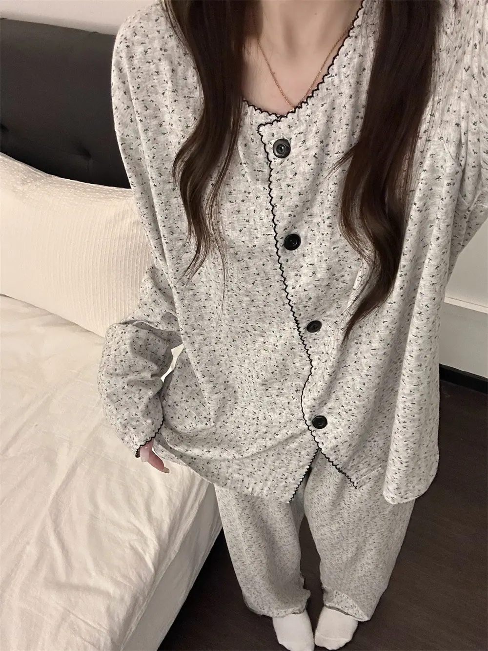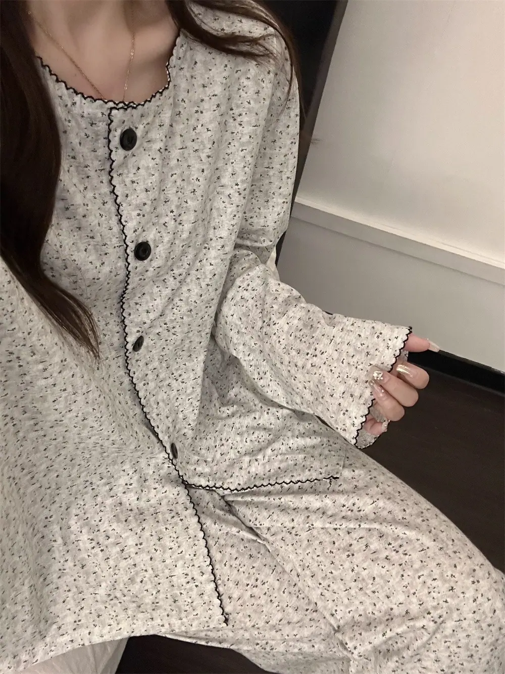 Pijama dulce y fresco de estilo coreano floral para mujer otoño y primavera nuevo cárdigan manga larga pantalón largo ropa de casa se puede usar fuera conjunto