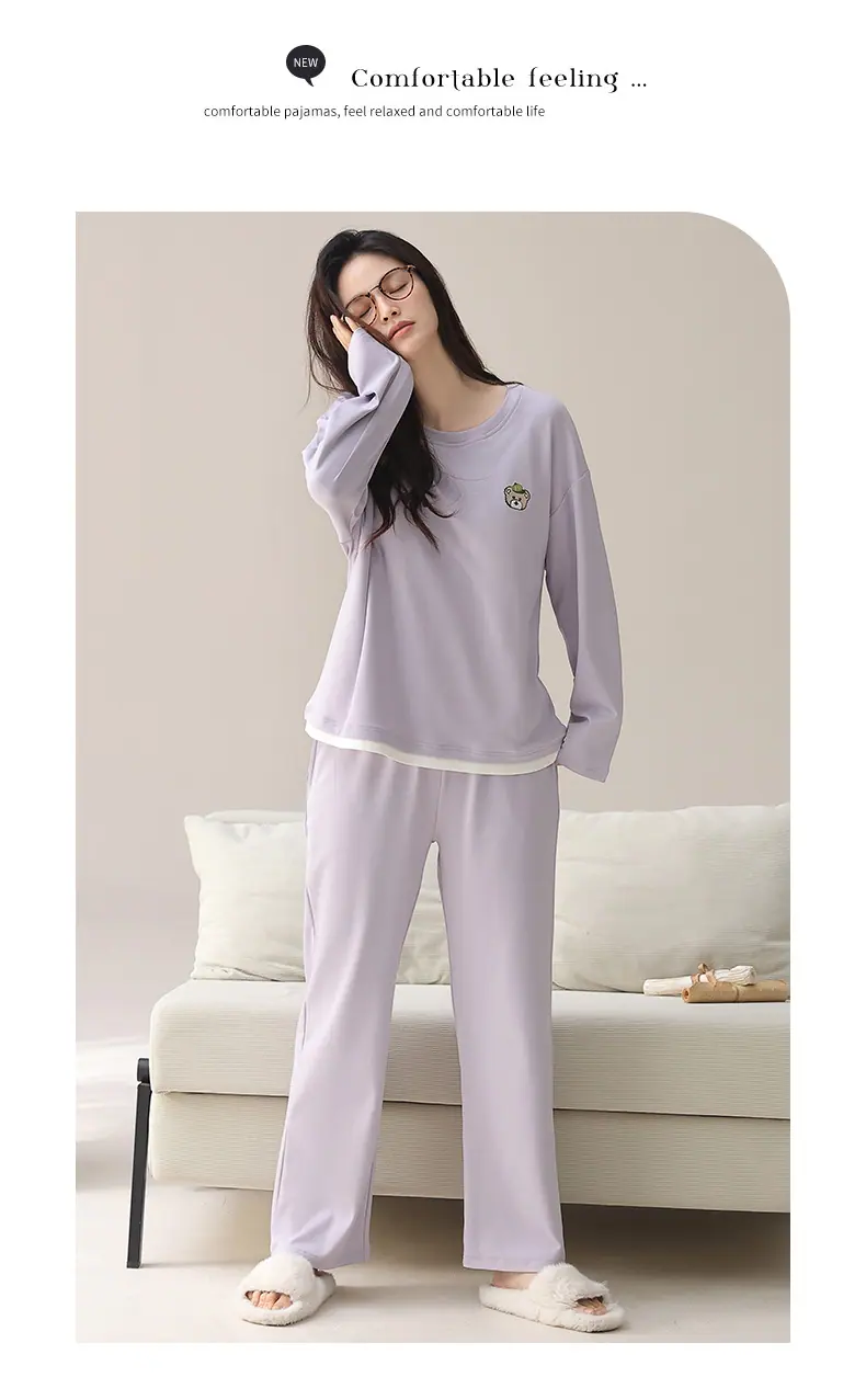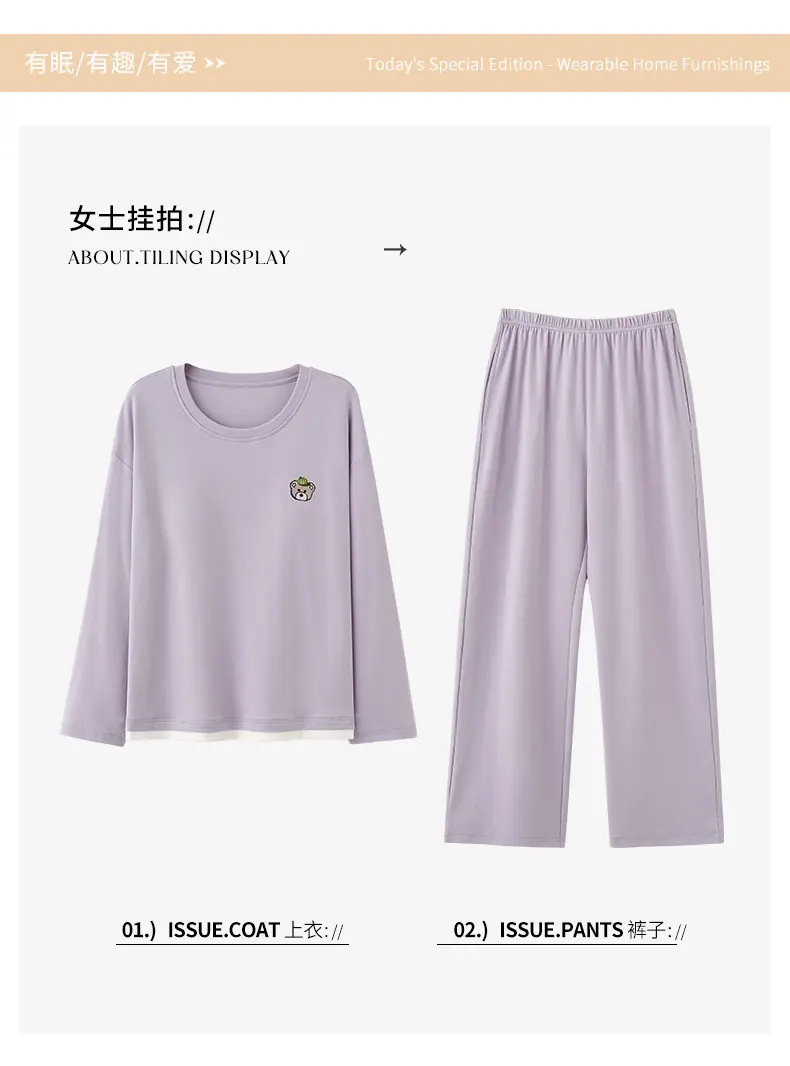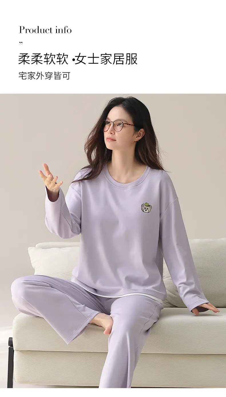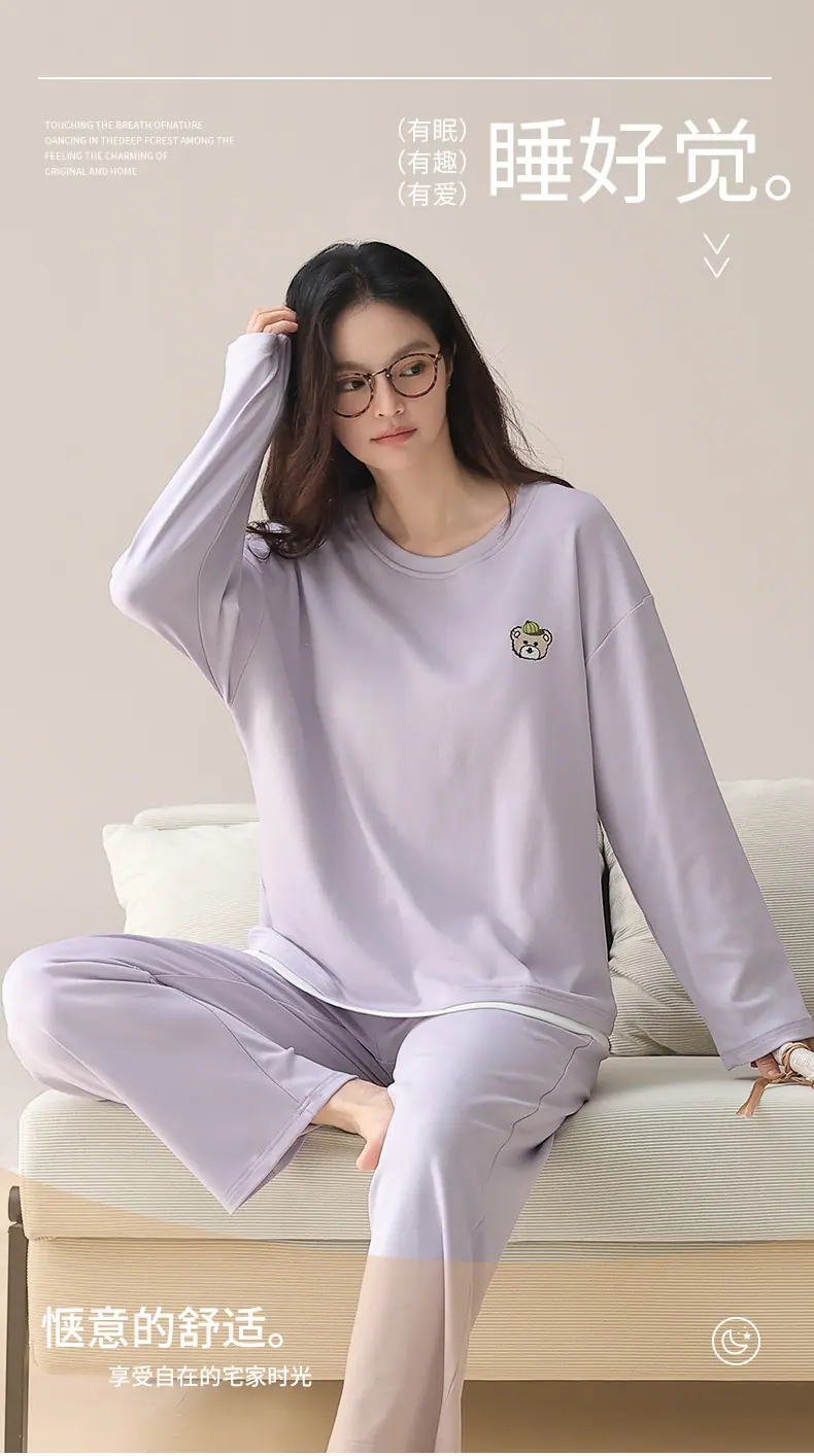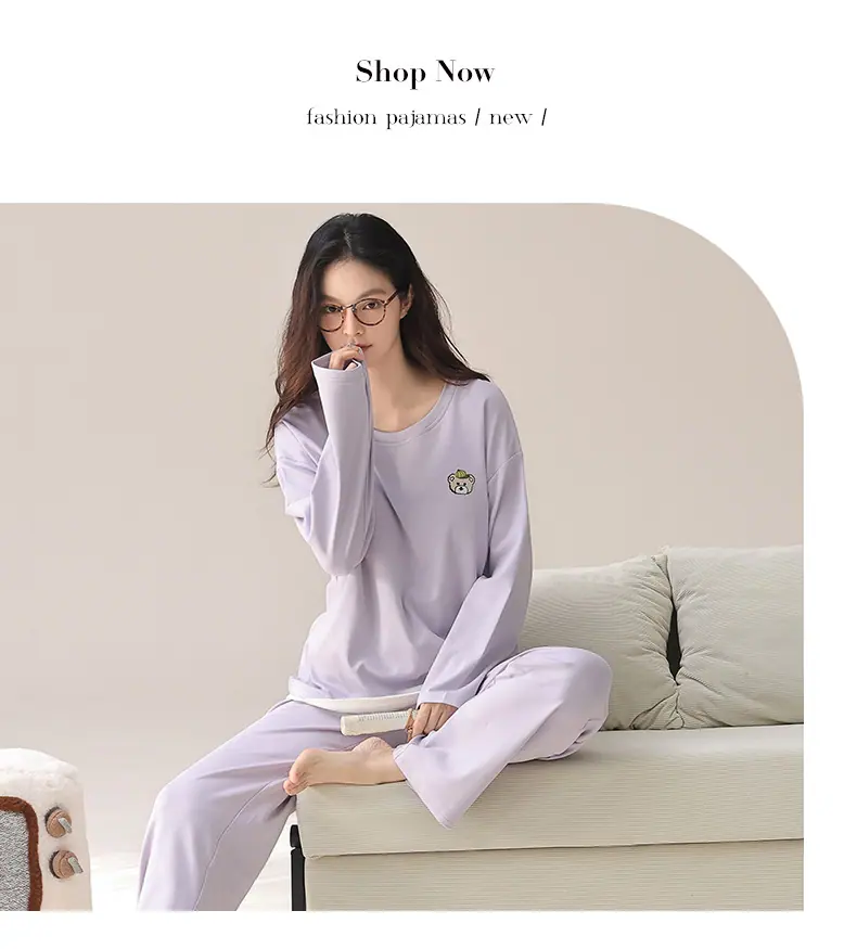 Compra Pijama sólido de gran venta para mujer, cuello redondo, manga larga, cómodo, amigable con la piel, puro algodón, estampado dulce, para estar en casa, primavera y otoño, se puede usar como conjunto exterior al por mayor en Joom.pro