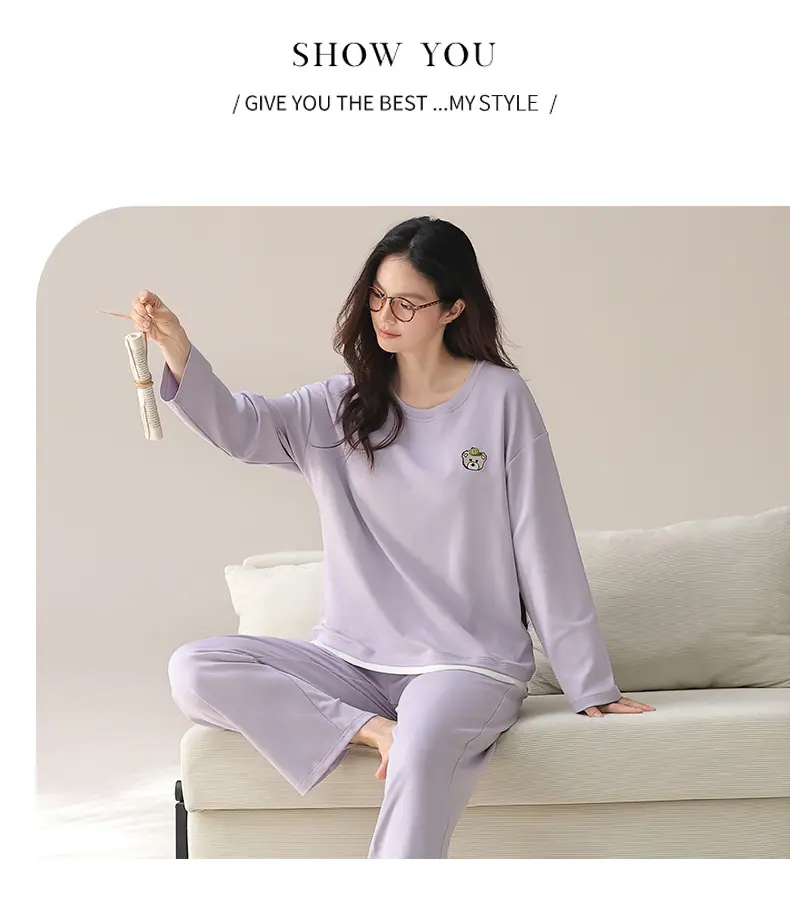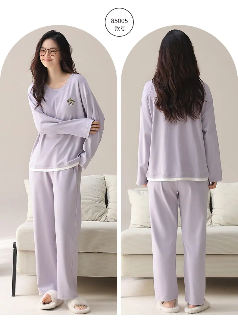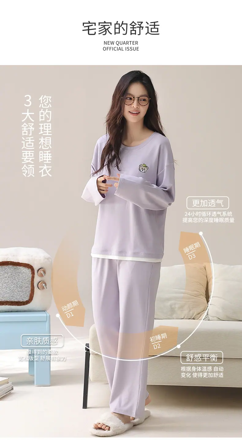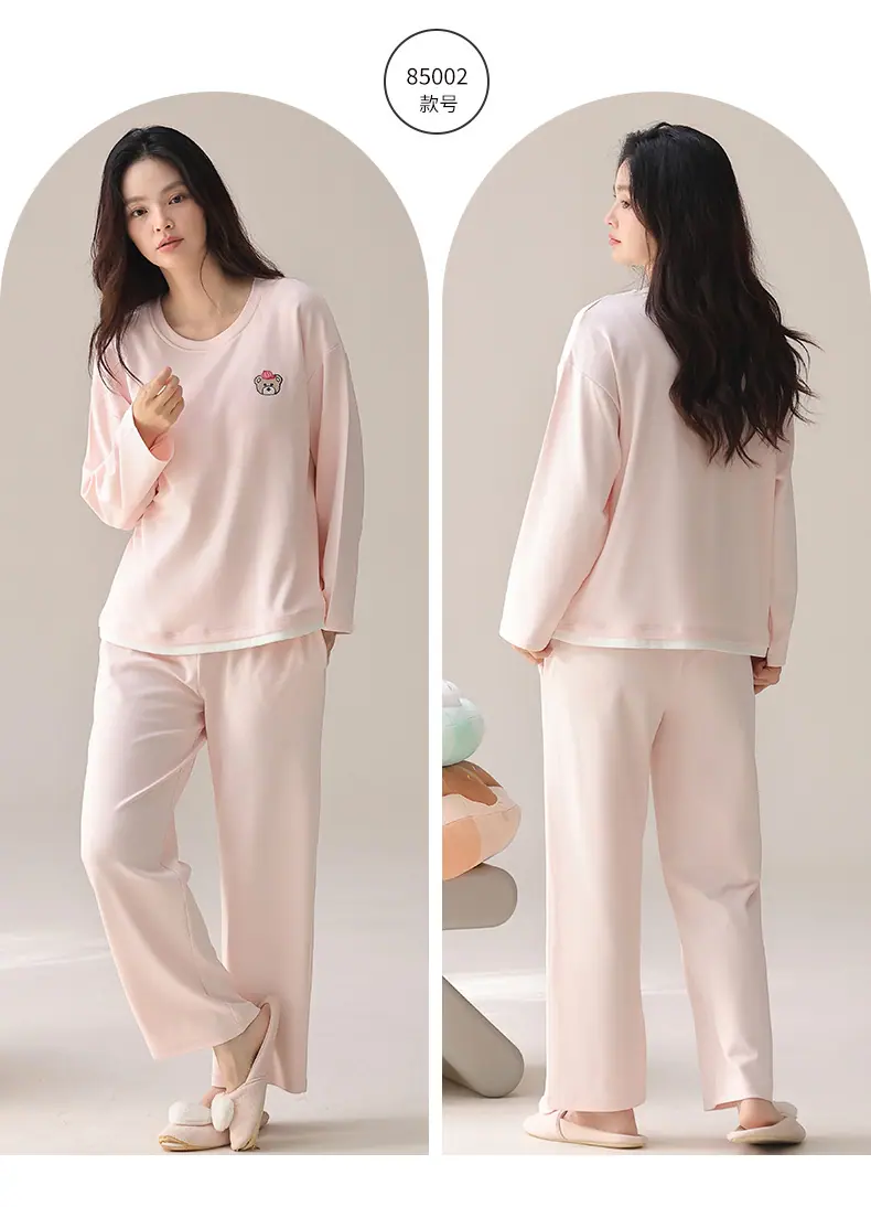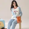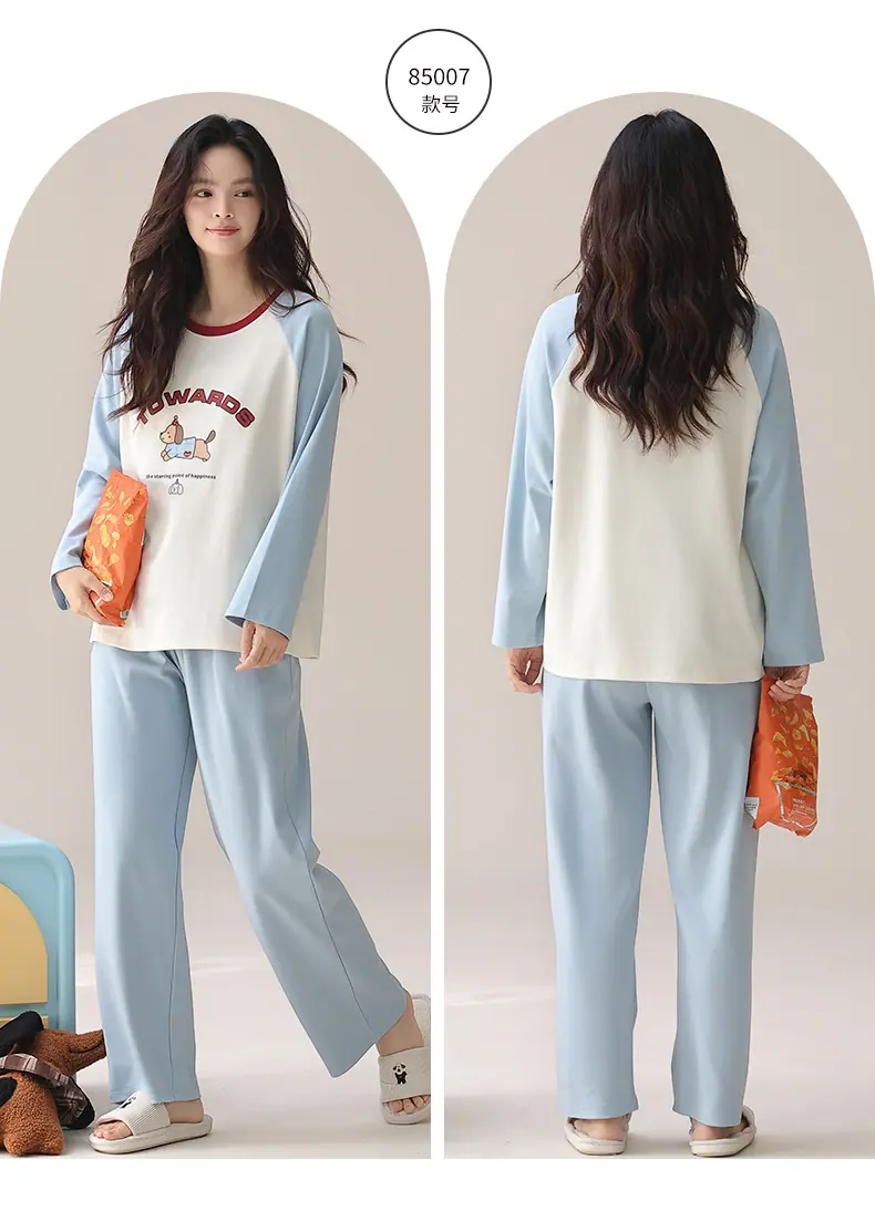 Compra Pijama sólido de gran venta para mujer, cuello redondo, manga larga, cómodo, amigable con la piel, puro algodón, estampado dulce, para estar en casa, primavera y otoño, se puede usar como conjunto exterior al por mayor en Joom.pro