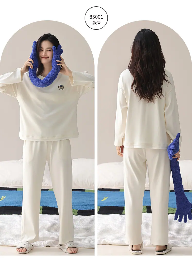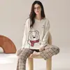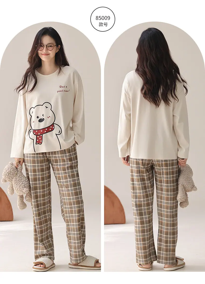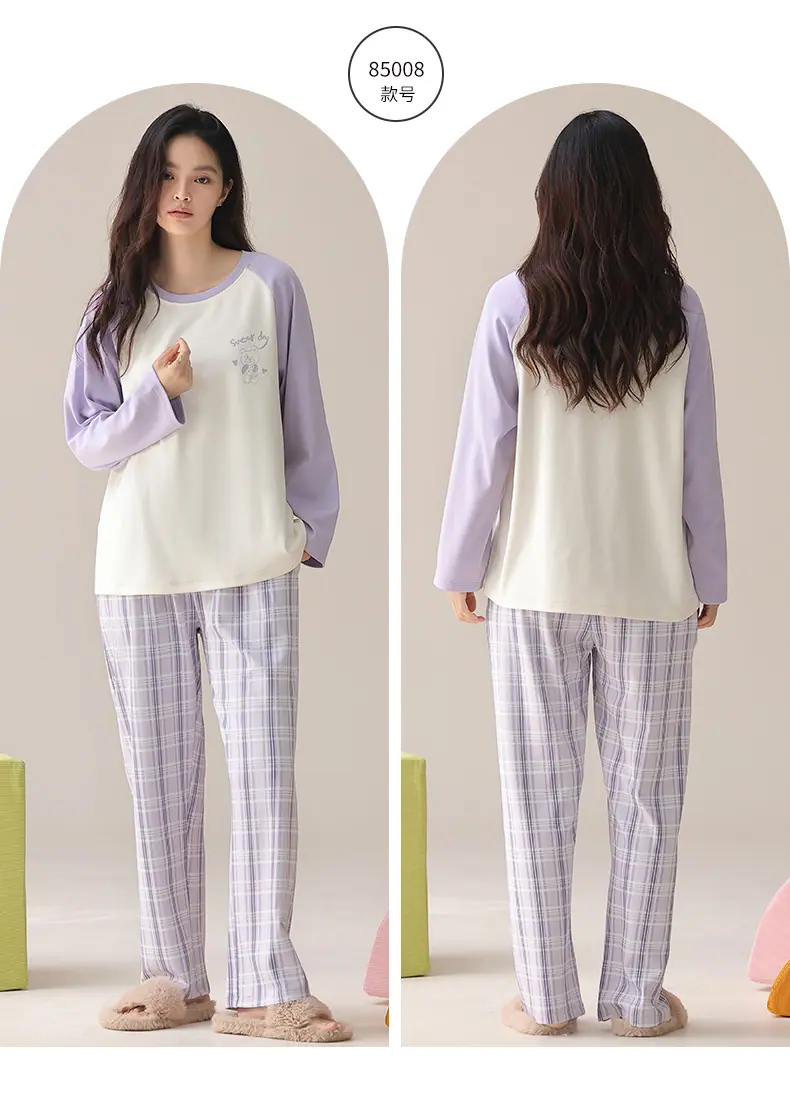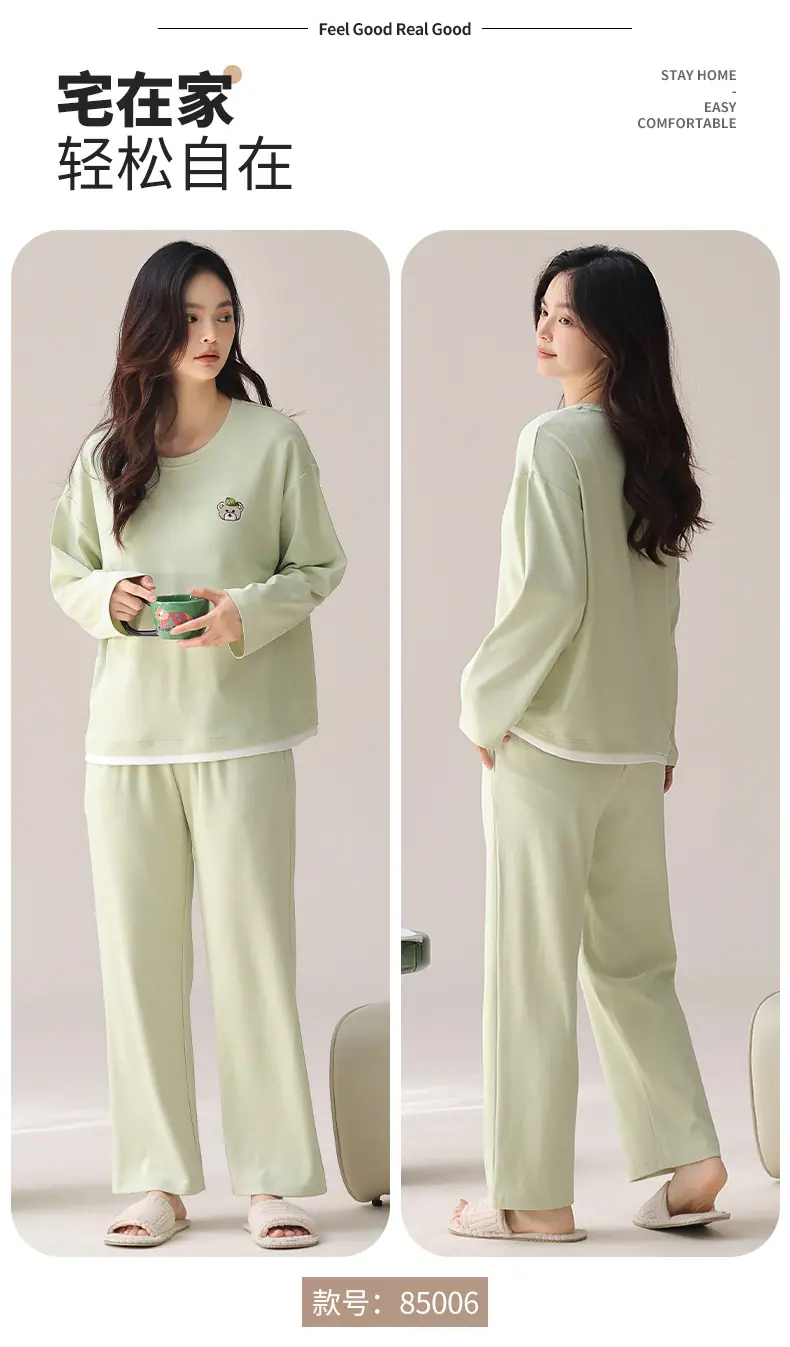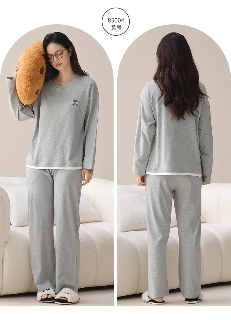 Compra Pijama sólido de gran venta para mujer, cuello redondo, manga larga, cómodo, amigable con la piel, puro algodón, estampado dulce, para estar en casa, primavera y otoño, se puede usar como conjunto exterior al por mayor en Joom.pro