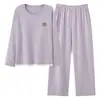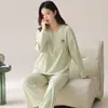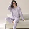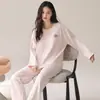 Pijama sólido de gran venta para mujer, cuello redondo, manga larga, cómodo, amigable con la piel, puro algodón, estampado dulce, para estar en casa, primavera y otoño, se puede usar como conjunto exterior